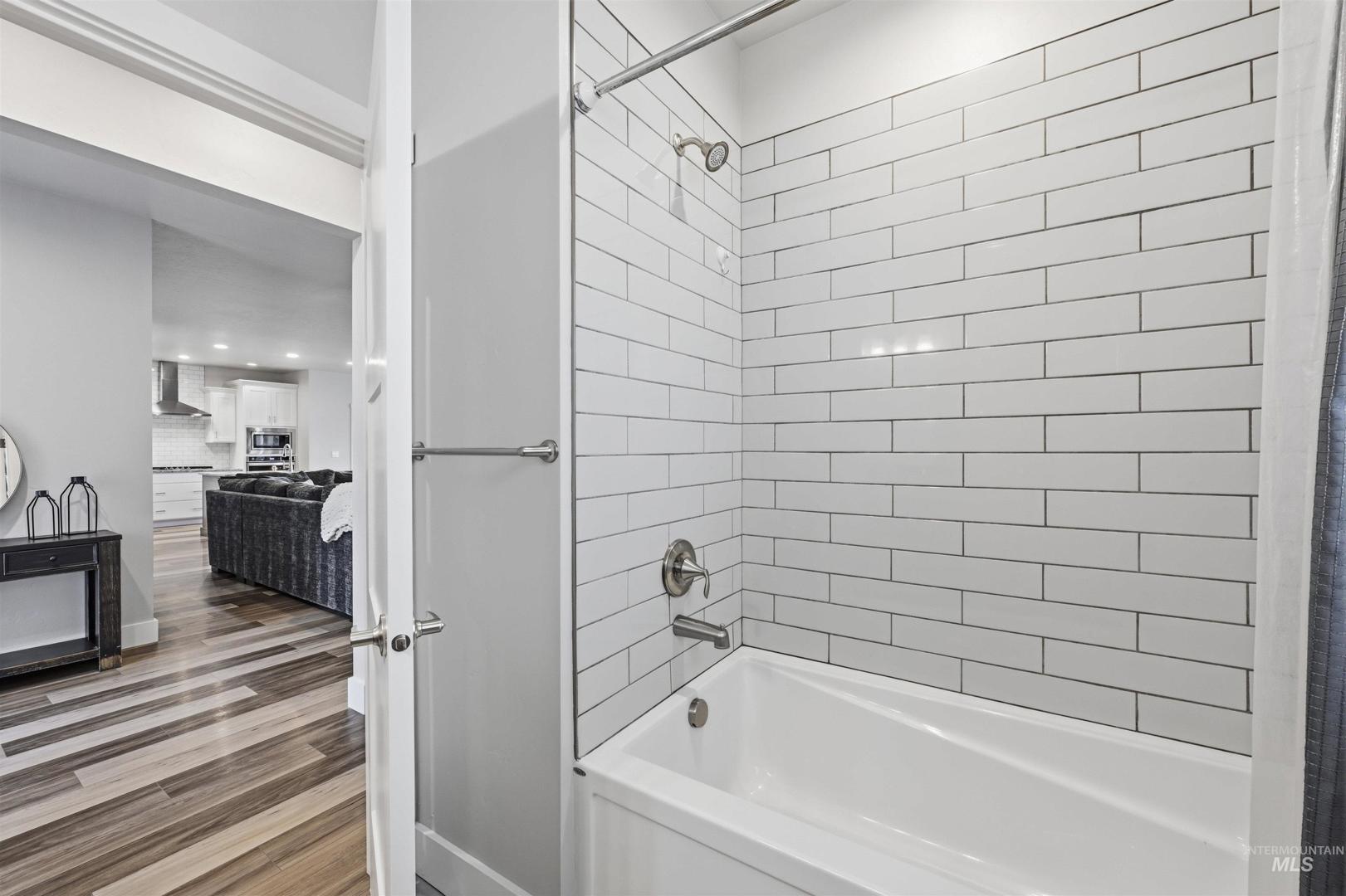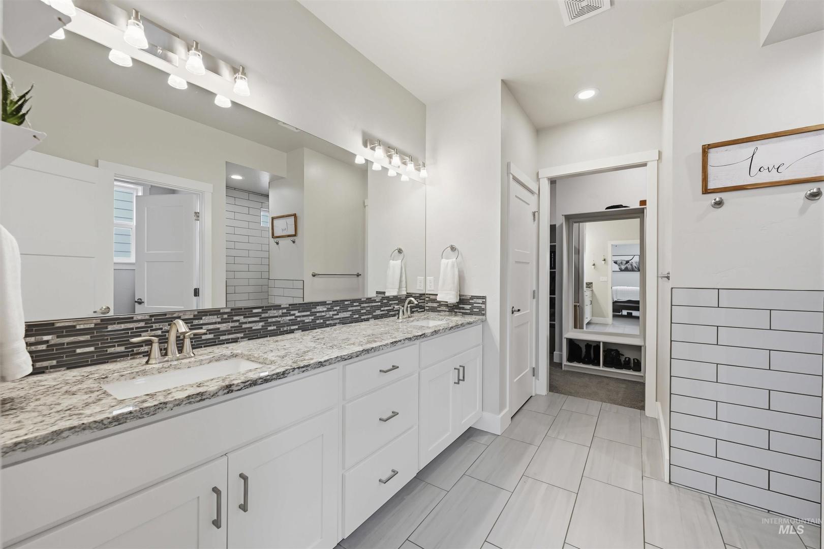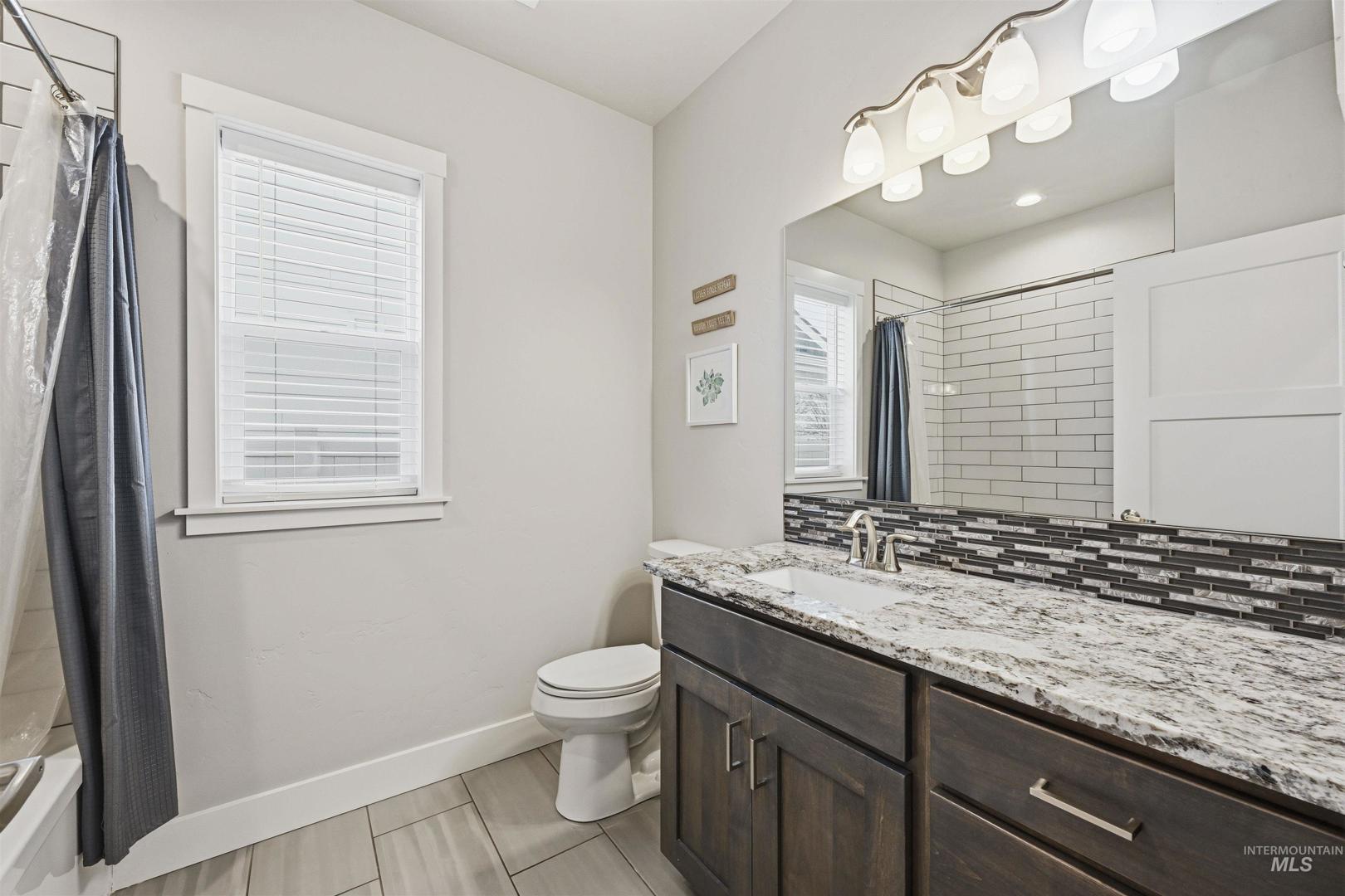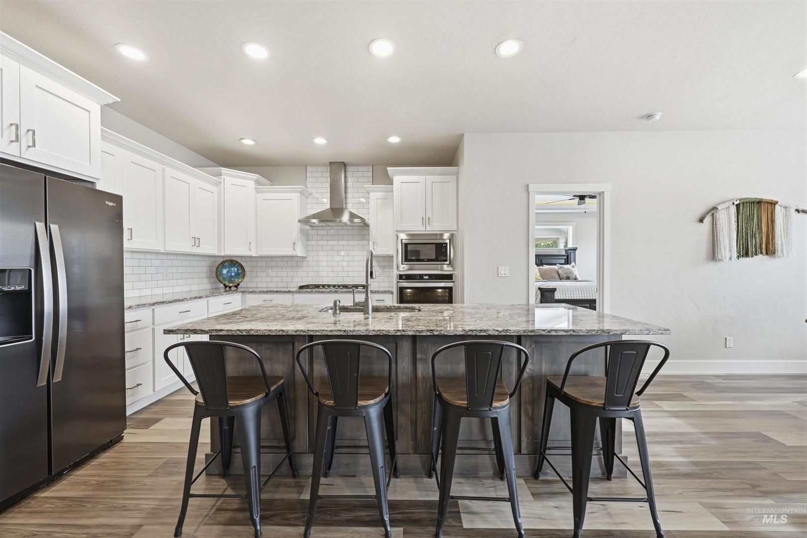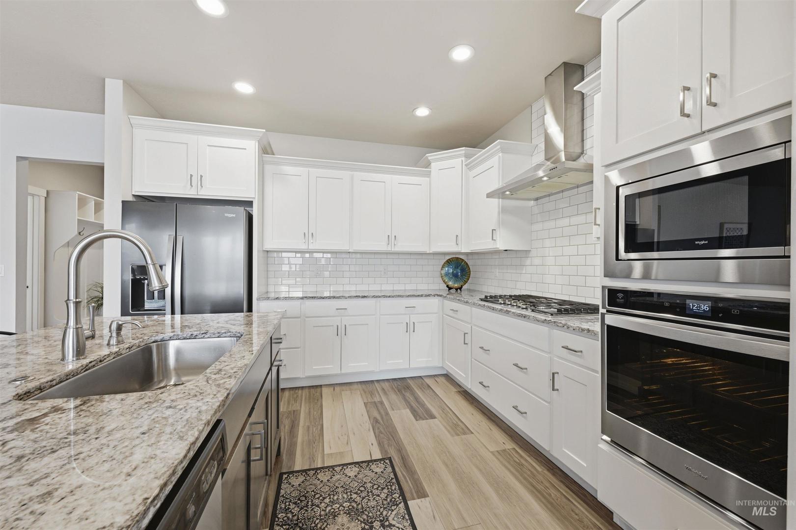 Step into this beautiful single-level home where comfort, style, and thoughtful design come together effortlessly! Rich hardwood floors guide you through the entry, kitchen, dining area, and expansive great room, anchored by a striking floor-to-ceiling stone fireplace that instantly sets the tone for cozy evenings and memorable gatherings. The kitchen is a true showstopper, offering stainless steel appliances, custom cabinetry, a large island perfect for entertaining, granite countertops, and a spacious pantry designed for everyday ease. The primary suite feels like a private retreat, highlighted by dual vanities with granite countertops, a luxurious soaker tub, a full tile walk-in shower, and an oversized walk-in closet. Step outside to the covered back patio: an ideal space for hosting friends, enjoying summer evenings, or simply unwinding at the end of the day. A roomy three-car garage adds both convenience and storage, while the home’s prime location places you just minutes from popular restaurants, shopping, and easy access to the Eagle Road interchange. This home truly offers the perfect blend of elegance, functionality, and location.