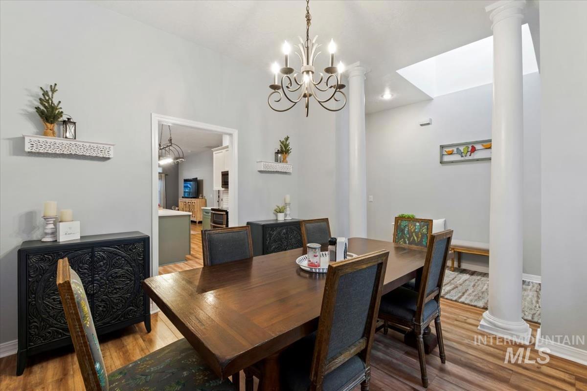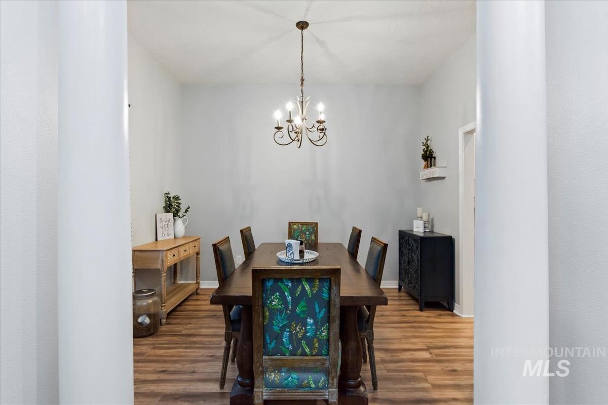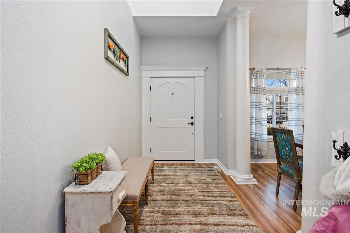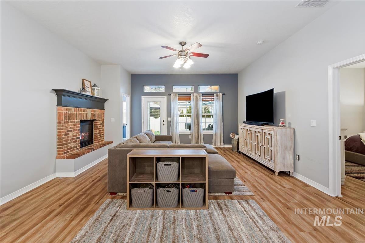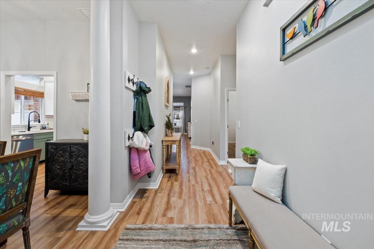 Charming cottage-style home on a beautifully landscaped corner lot, backing to a peaceful community pathway. A covered front porch with classic pillars welcomes you, while full brick accents highlight the oversized, extra-deep garage with abundant storage. Inside, a front dining area framed by elegant pillars overlooks the porch & flows seamlessly into the heart of the home: a fully remodeled kitchen with new cabinetry, quartz counters, tile backsplash, stainless steel appliances & center island, opening to a warm living room with a brick fireplace & views of the covered back patio. Newer resilient flooring enhances the main living areas. The spacious primary suite offers a large bathroom with corner soaker tub, separate shower & generous walk-in closet. A bright laundry room includes a window, cabinets & folding counter. Enjoy an exceptional community with multiple parks, large playground & community pool. Designed for comfort, style & easy living in central N. Meridian location.
