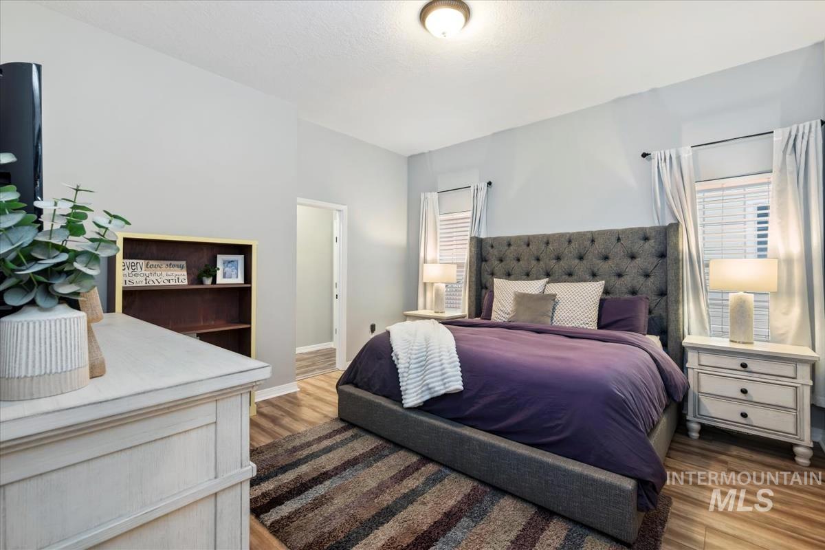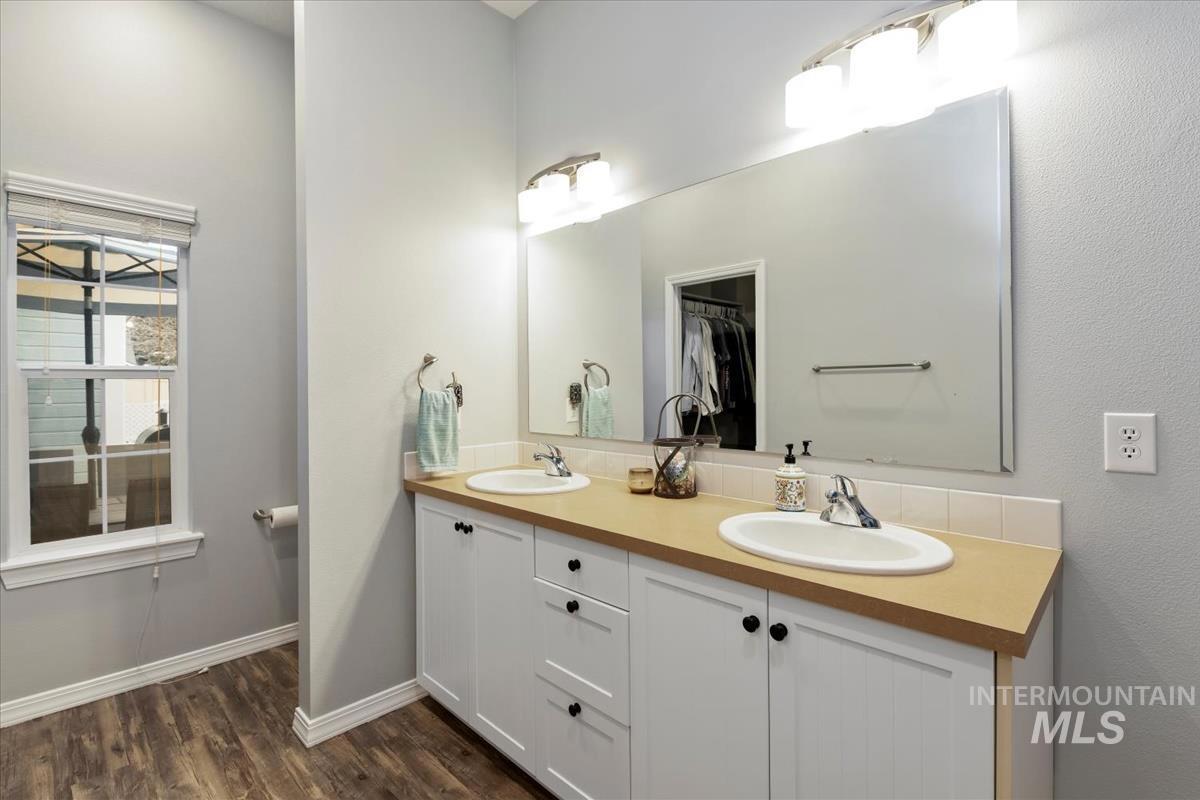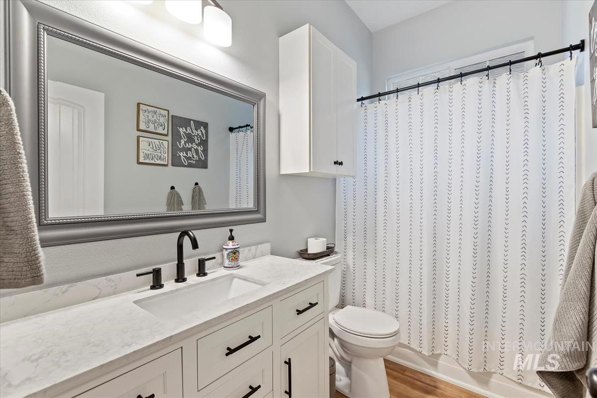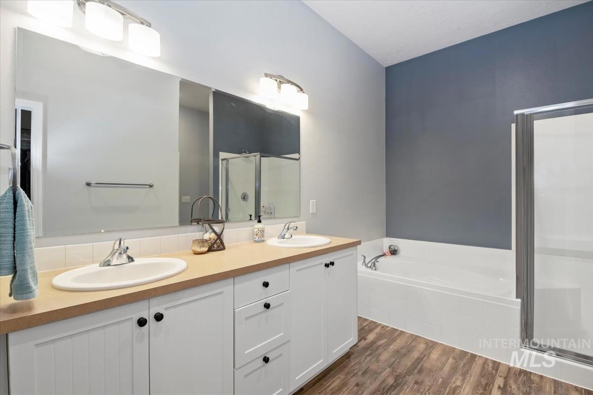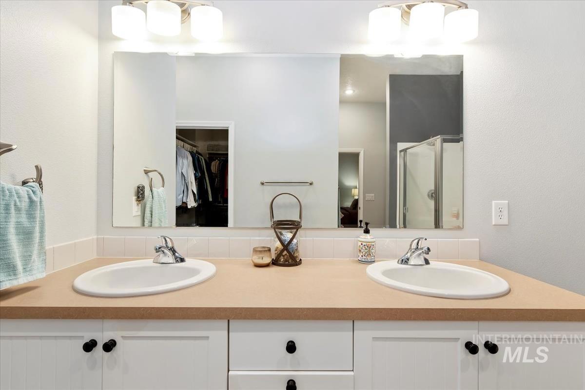 Charming cottage-style home on a beautifully landscaped corner lot, backing to a peaceful community pathway. A covered front porch with classic pillars welcomes you, while full brick accents highlight the oversized, extra-deep garage with abundant storage. Inside, a front dining area framed by elegant pillars overlooks the porch & flows seamlessly into the heart of the home: a fully remodeled kitchen with new cabinetry, quartz counters, tile backsplash, stainless steel appliances & center island, opening to a warm living room with a brick fireplace & views of the covered back patio. Newer resilient flooring enhances the main living areas. The spacious primary suite offers a large bathroom with corner soaker tub, separate shower & generous walk-in closet. A bright laundry room includes a window, cabinets & folding counter. Enjoy an exceptional community with multiple parks, large playground & community pool. Designed for comfort, style & easy living in central N. Meridian location.