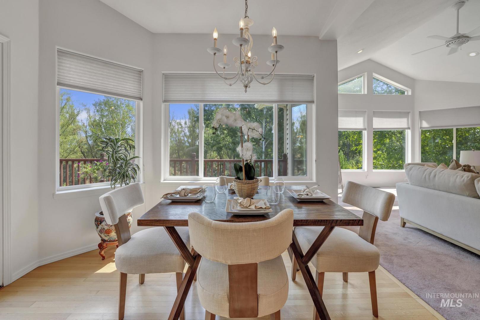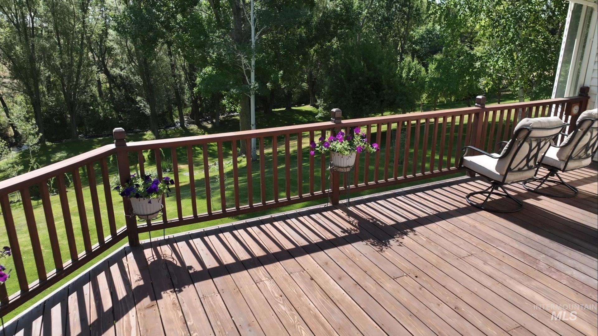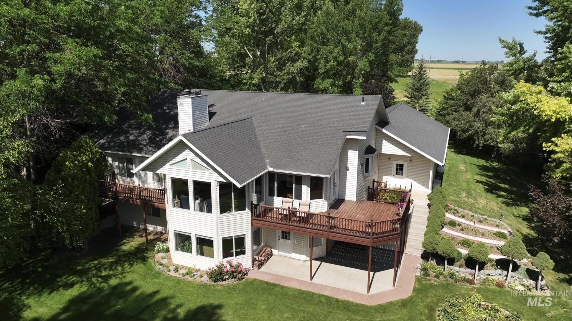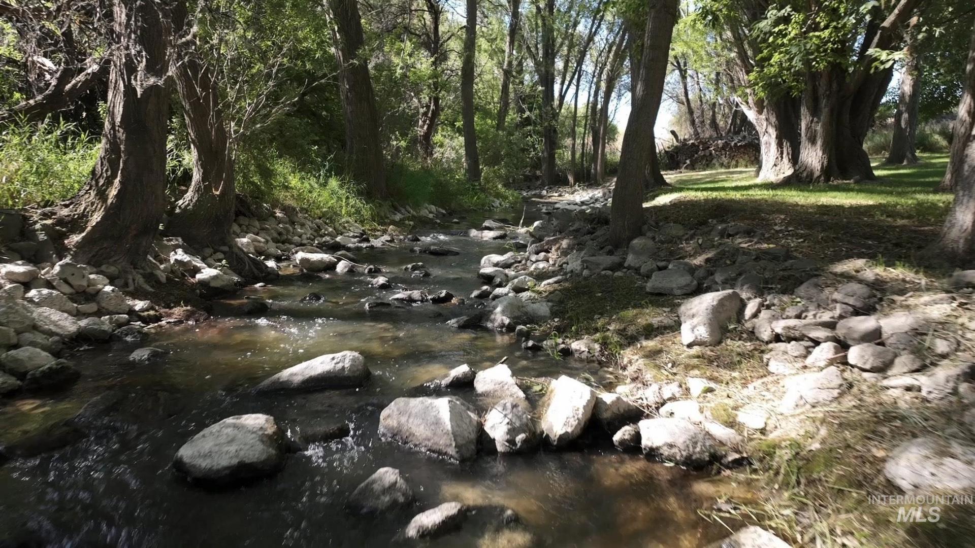 This property offers a tranquil retreat set among natural beauty, as evidenced by the private road lined with trees and the peaceful, flowing stream. The large, modern home is nestled in a lush, wooded environment, providing a secluded feel. Inside, the home features a spacious, bright living areas with vaulted ceilings, large windows offering scenic views, and an open-concept design ideal for entertaining. The kitchen is warm and inviting, boasting maple wood cabinetry, and granite countertops. Natural light floods the main living spaces, emphasizing the oak flooring. With its blend of comfortable, updated interiors and picturesque, private outdoor spaces, this property presents a charming and serene lifestyle. A private deck off the main bedroom, plus a deck off the kitchen and a patio from the walk-out basement, invite you to enjoy the all-season beauty. Full water shares delivered, storage galore, office/craft space, fruit trees, oversized garage/workshop. A rare opportunity to own your own Private Idaho.