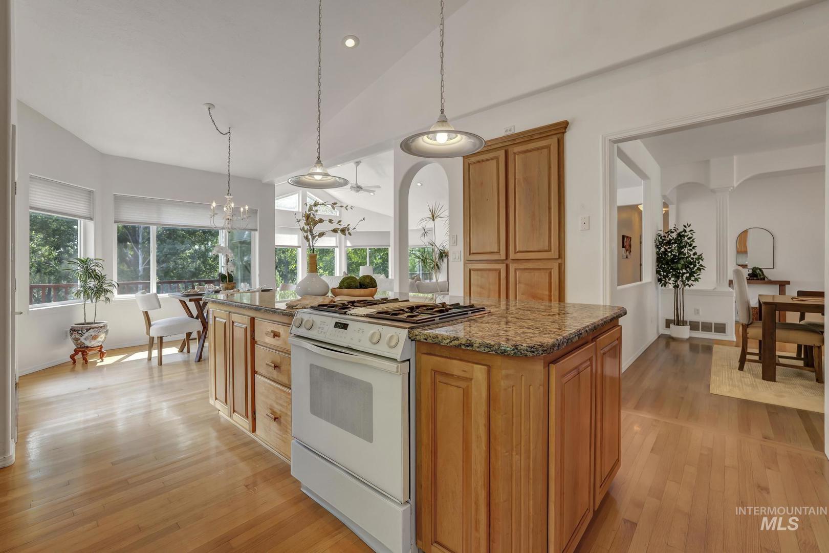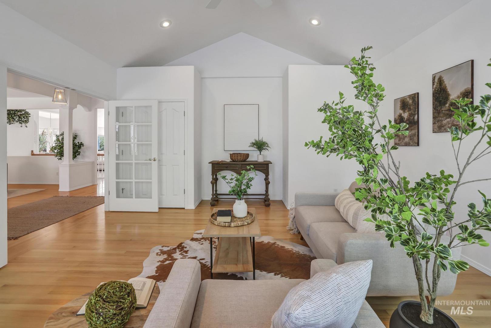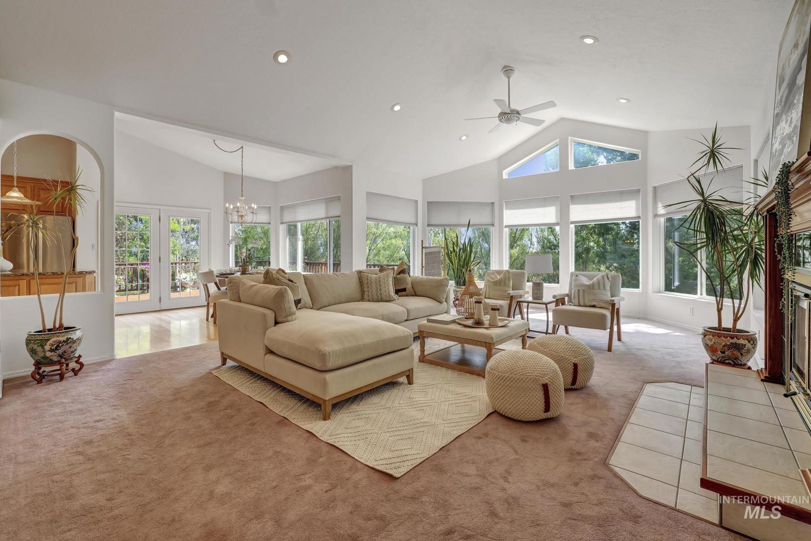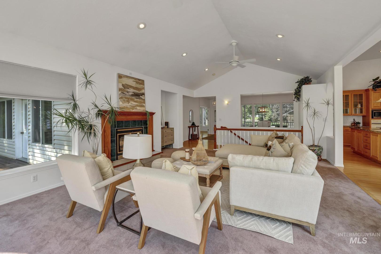 This property offers a tranquil retreat set among natural beauty, as evidenced by the private road lined with trees and the peaceful, flowing stream. The large, modern home is nestled in a lush, wooded environment, providing a secluded feel. Inside, the home features a spacious, bright living areas with vaulted ceilings, large windows offering scenic views, and an open-concept design ideal for entertaining. The kitchen is warm and inviting, boasting maple wood cabinetry, and granite countertops. Natural light floods the main living spaces, emphasizing the oak flooring. With its blend of comfortable, updated interiors and picturesque, private outdoor spaces, this property presents a charming and serene lifestyle. A private deck off the main bedroom, plus a deck off the kitchen and a patio from the walk-out basement, invite you to enjoy the all-season beauty. Full water shares delivered, storage galore, office/craft space, fruit trees, oversized garage/workshop. A rare opportunity to own your own Private Idaho.