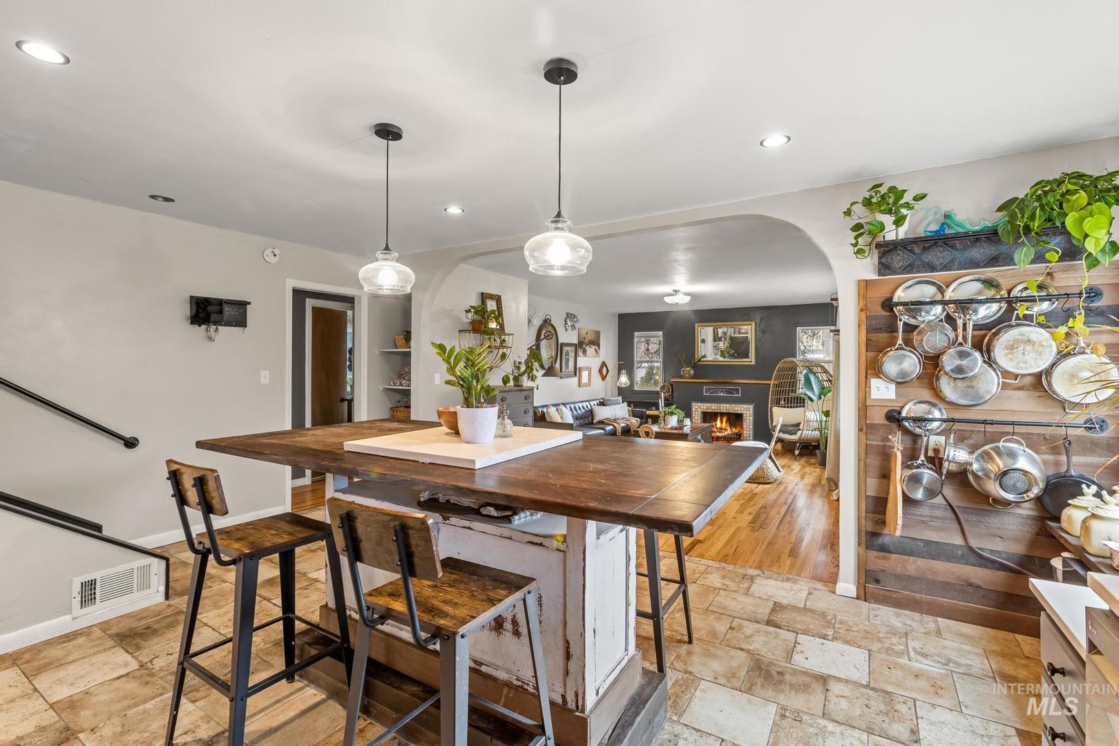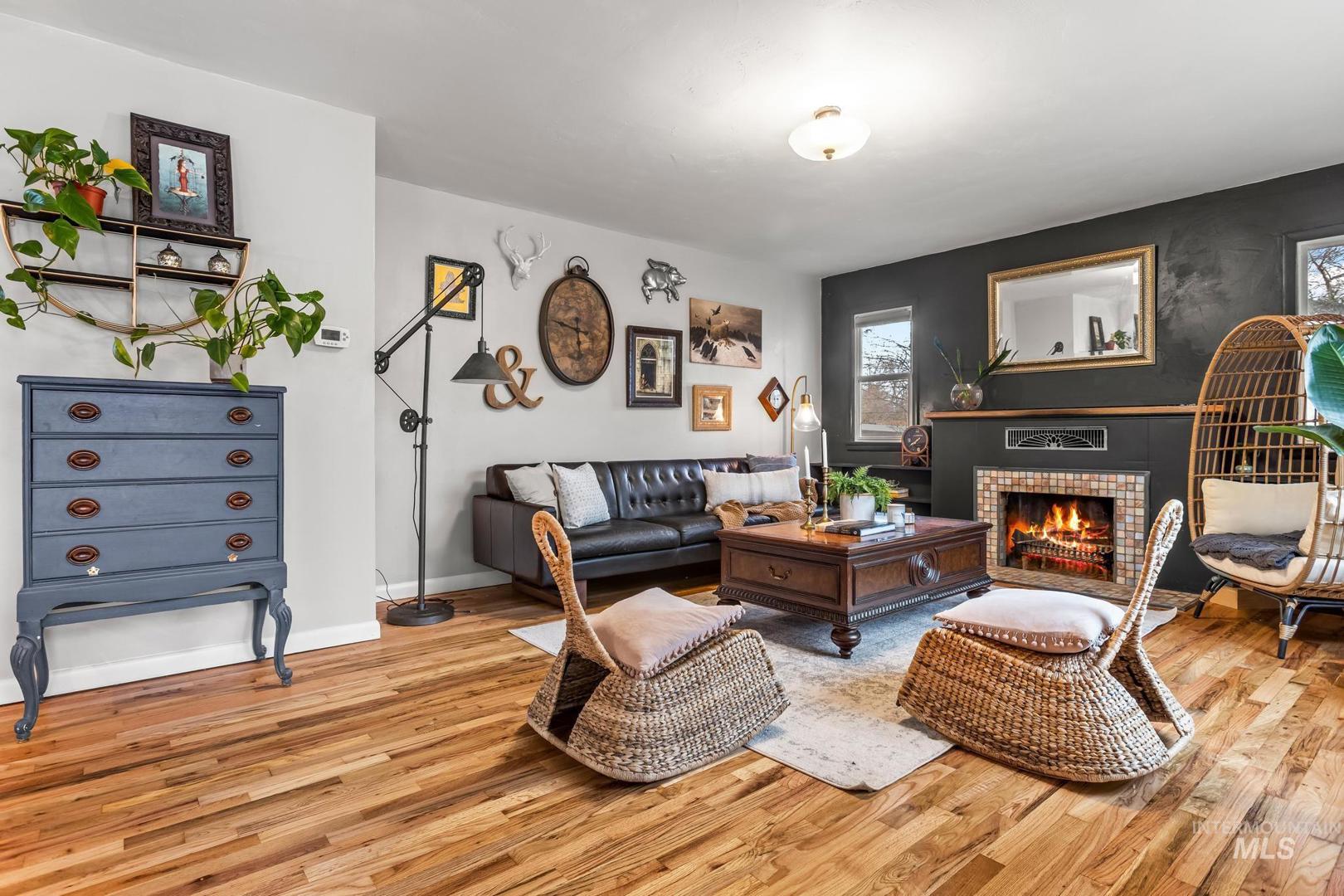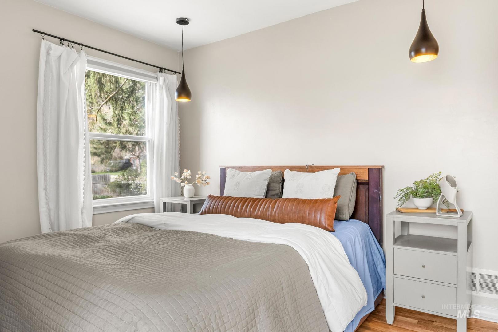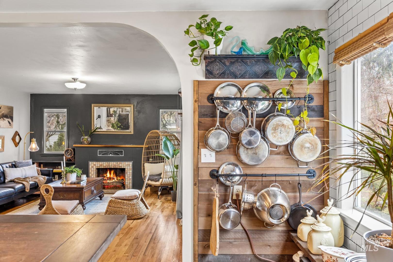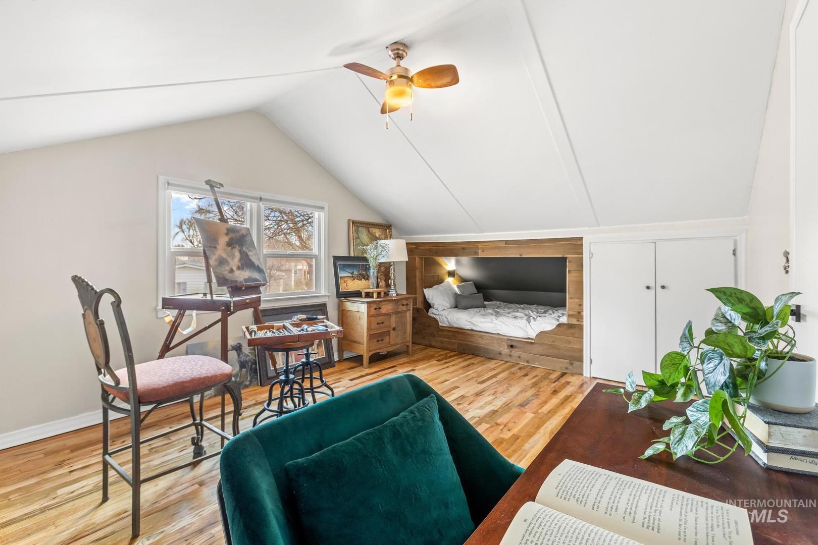 Rarely available in the North End, this storybook dream home is here. Freshly refinished hardwood floors great you in the bright living room with a wood burning fireplace, perfect for cozying up with a book. The open updated kitchen has so much space for culinary adventures. The window overlooking the sink, storage for your copper pots, and so much counter-space and custom display shelves for your pottery. The main level features two bedrooms with hardwood floors and ample closet. The shared bathroom has custom tile and large shower. The upstairs suite is an artists dream perched above the rest with foothills and treetop views, it has a custom cubby bed every kid dreams of disappearing into a book. Downstairs a large flex space for music or dining with a doorway to the incredible Secret Garden yard. The basement is a recreational haven with two more bedrooms, a play space, craft bar, and more. Attached garage lends for more storage.