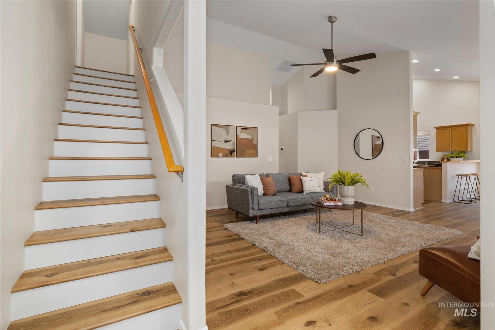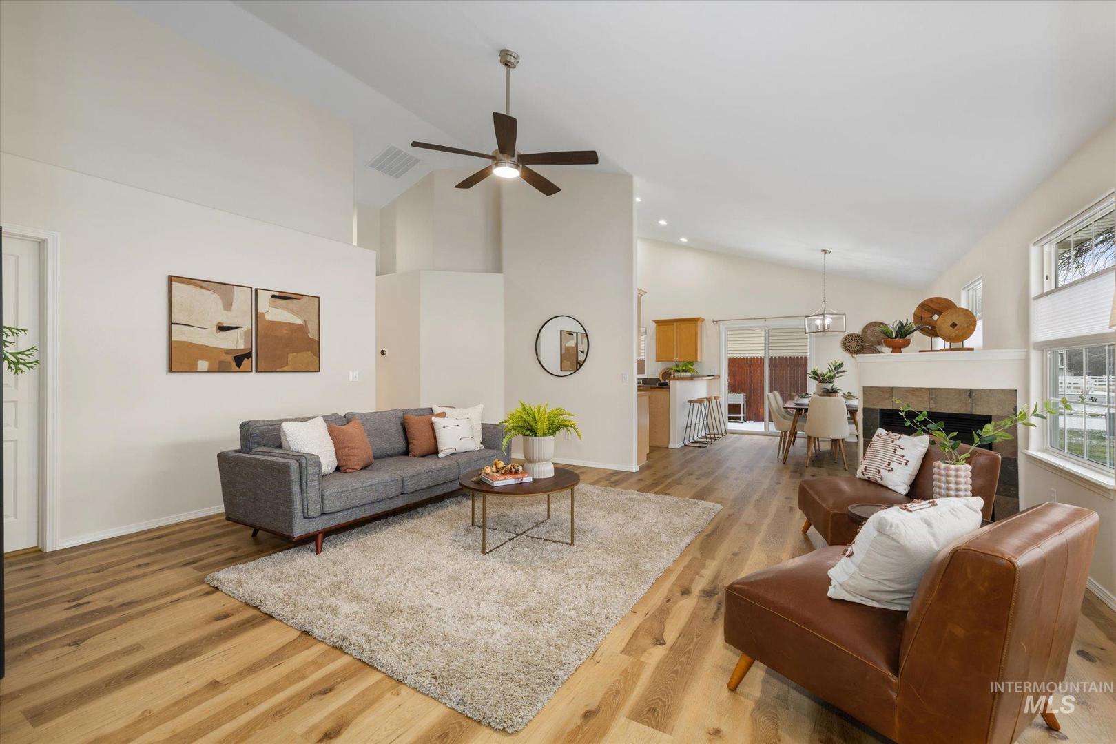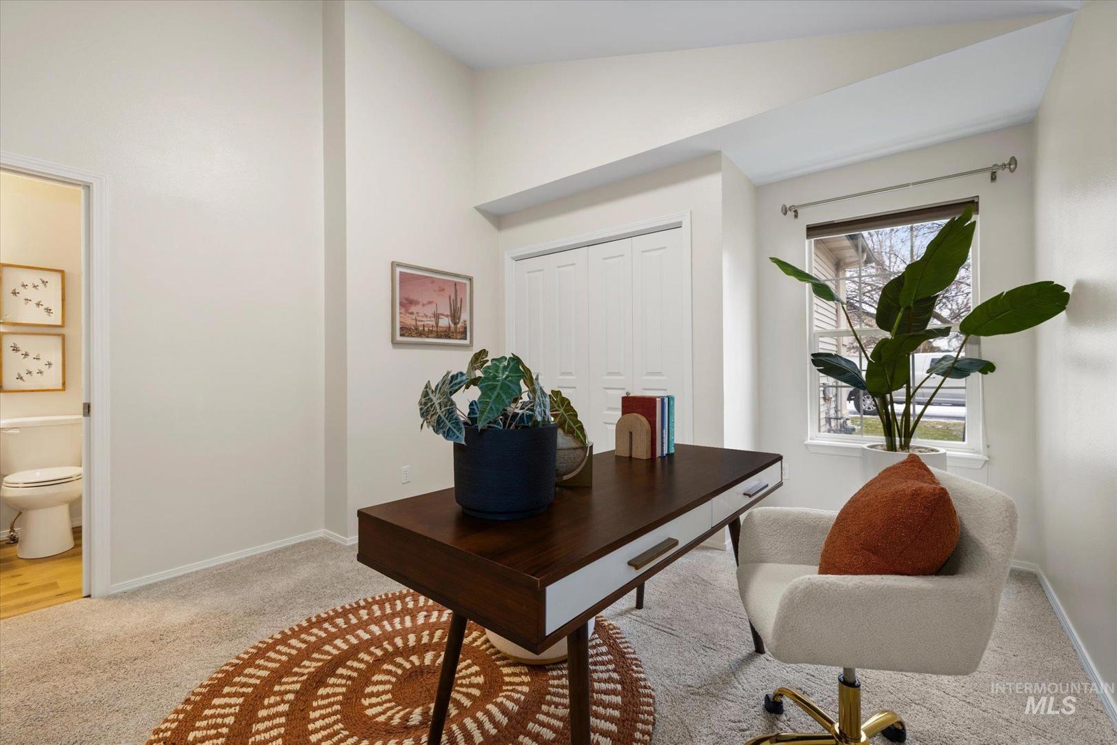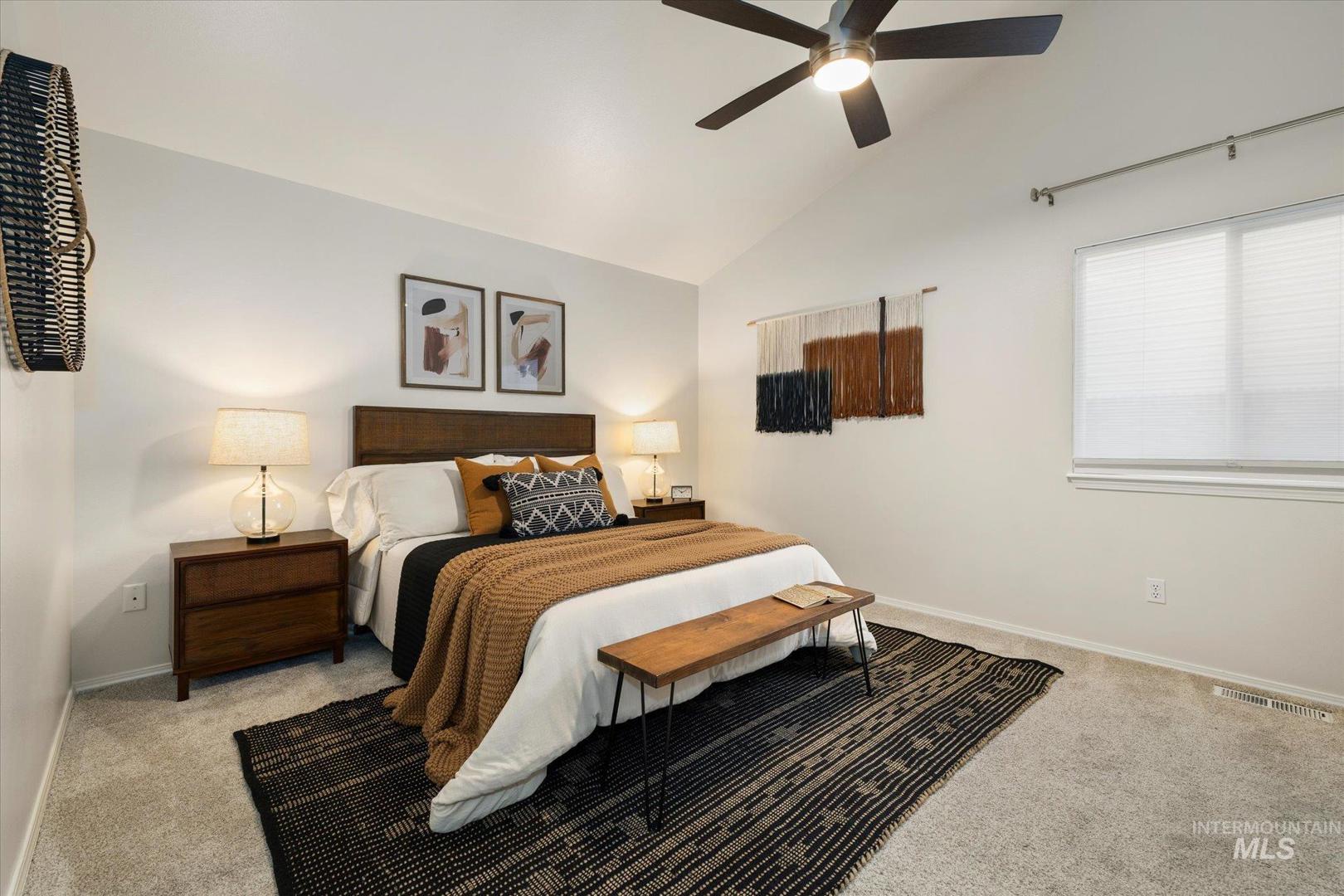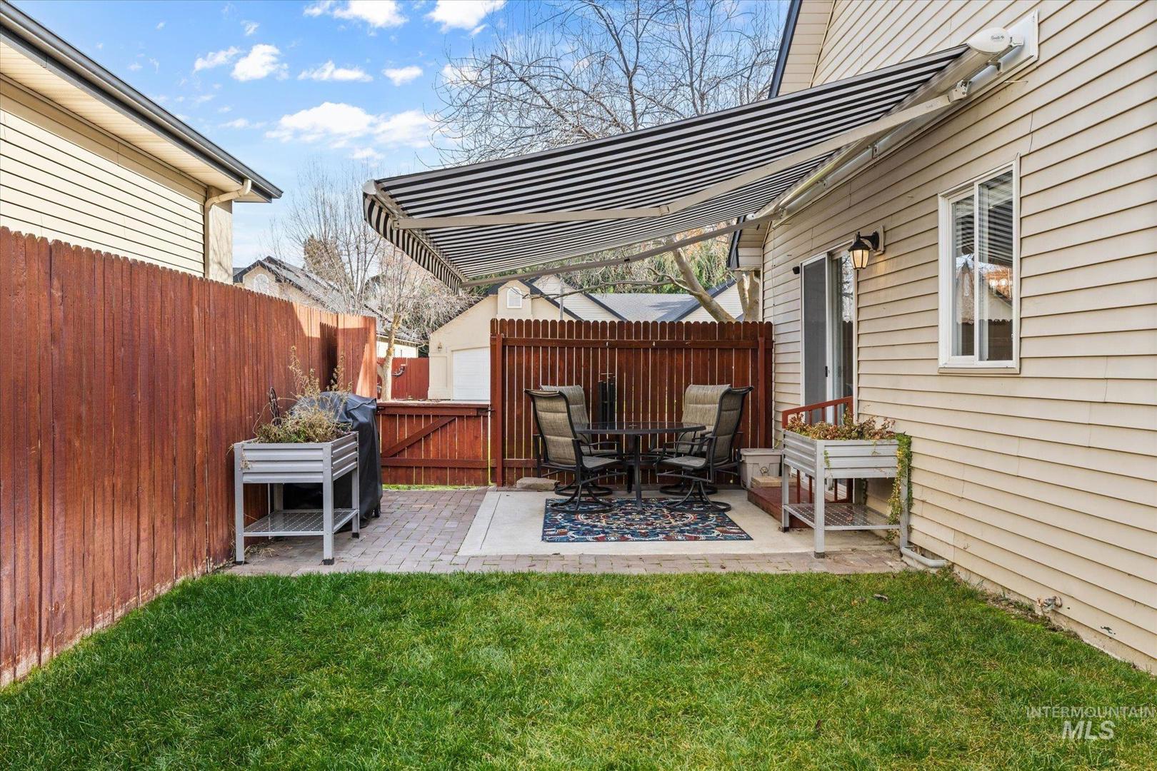 This well-maintained home features vaulted ceilings, a modern coat of warm white interior paint, updated lighting and natural wood look luxury vinyl plank flooring throughout. Set upon a corner lot with multiple east facing windows invite inside a generous layer of natural light. The furnace, AC and water heater have been updated as of 2017. Quaintly situated in Northwest Boise, close to foothills trails and many other amenities, this home is a great place to start, downsize or to invest in a low maintenance home. The layout features a roomy main-level primary suite plus additional bedroom (or office) and additional full bath, along with an oversized upstairs 3rd bedroom or bonus room with skylights. Outside you`ll find a private fully fenced backyard featuring hard surface patio with custom retractable awning offering shade on those warm summer evenings. The 2-car garage features extra room for storage of all of the Boise things to enjoy.