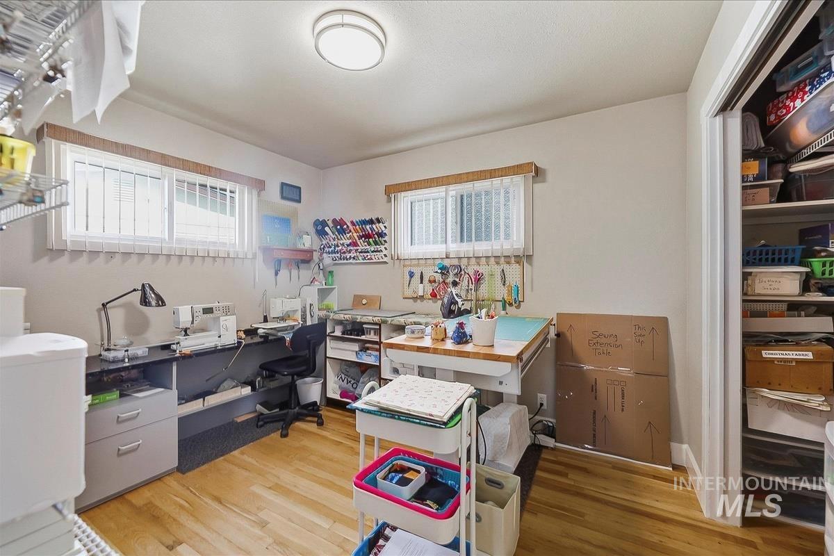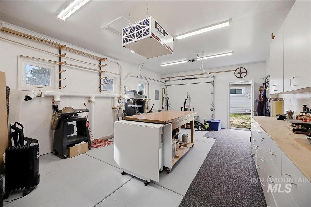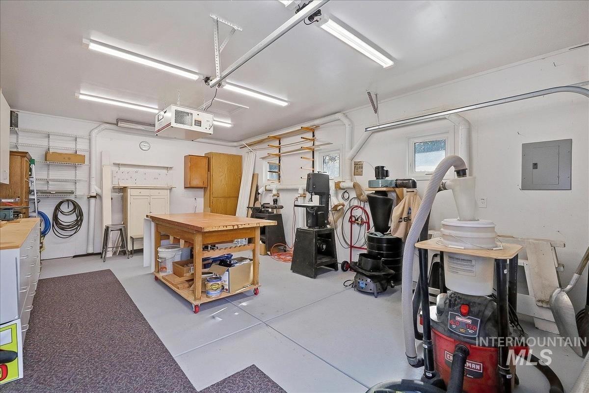 Comfortable single-level home with a finished basement offering flexible living space and practical updates throughout. The main level includes three bedrooms, a bright living area with wood stove, and an updated kitchen designed for everyday use. Insulation, electrical, and windows were updated in 2009 for added efficiency and comfort. The finished basement adds a fourth bedroom, a large secondary living space, a dedicated pantry closet with shelving, and additional storage room. Exterior improvements include Hardi-board siding added in 2018 and a metal roof installed in 2017. The backyard is set up for projects and gardening with a detached woodworker’s shop added in 2014 featuring a dust collection system, window A/C, garage door, and separate man-door access. Additional outdoor features include a greenhouse, tool shed, designated garden space, gutter guards, and full sprinkler system. The furnace and A/C were replaced in 2024.