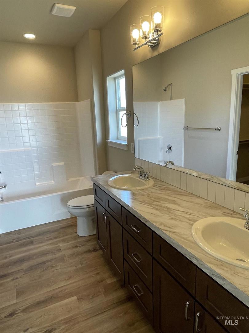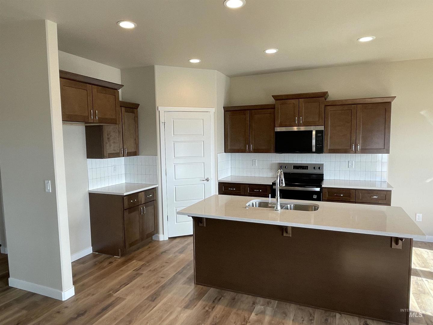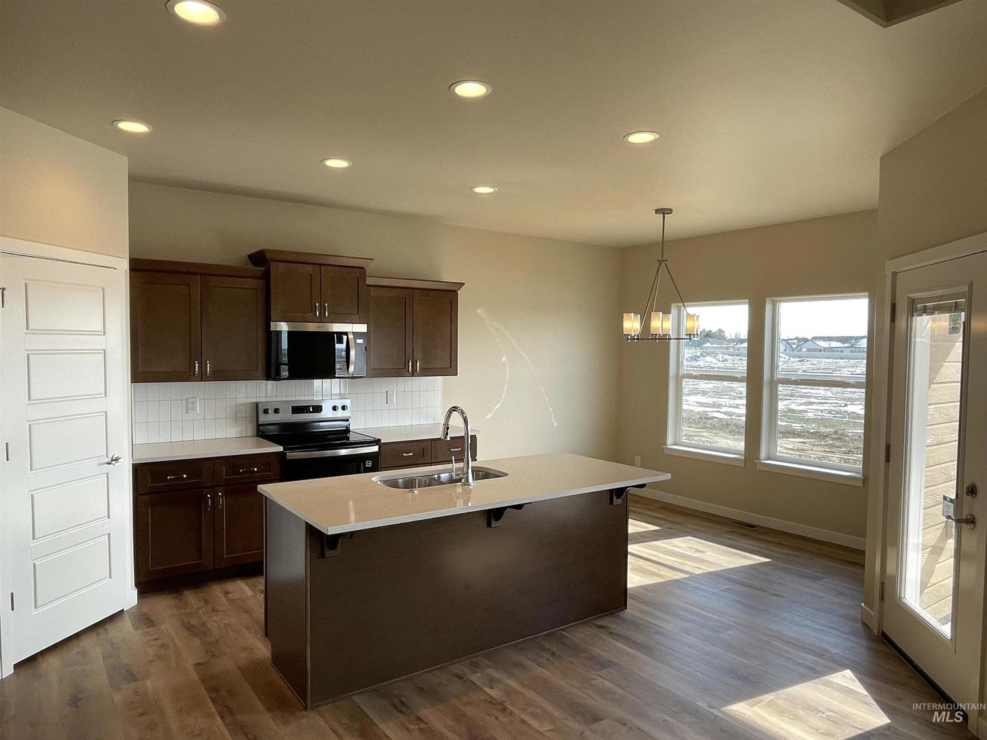 Located at 961 Quartz Street in Kimberly, Idaho, this 4 bedroom, 2 bathroom home offers approximately 1,538 square feet of living space with a 2-car garage. The open-concept layout connects the living area, dining space, and kitchen, featuring a center island with dual sink, solid surface countertops, tile backsplash, stainless steel appliances, and pantry storage. The primary suite includes a private bathroom with dual vanities, tub/shower combination, and walk-in closet. Additional features include vinyl plank flooring in main living areas, carpeted bedrooms, recessed lighting, ceiling fans, laundry room with upper cabinetry, and sliding glass door access to the backyard. Buyer to verify all information.