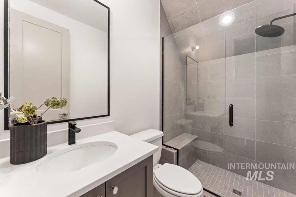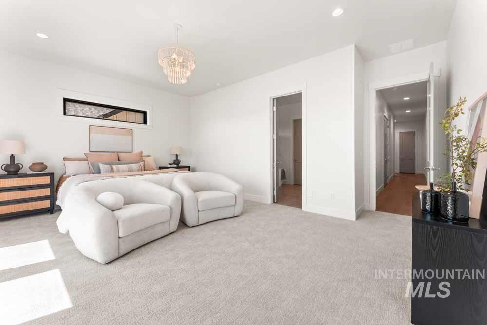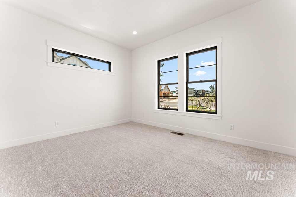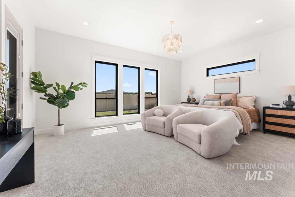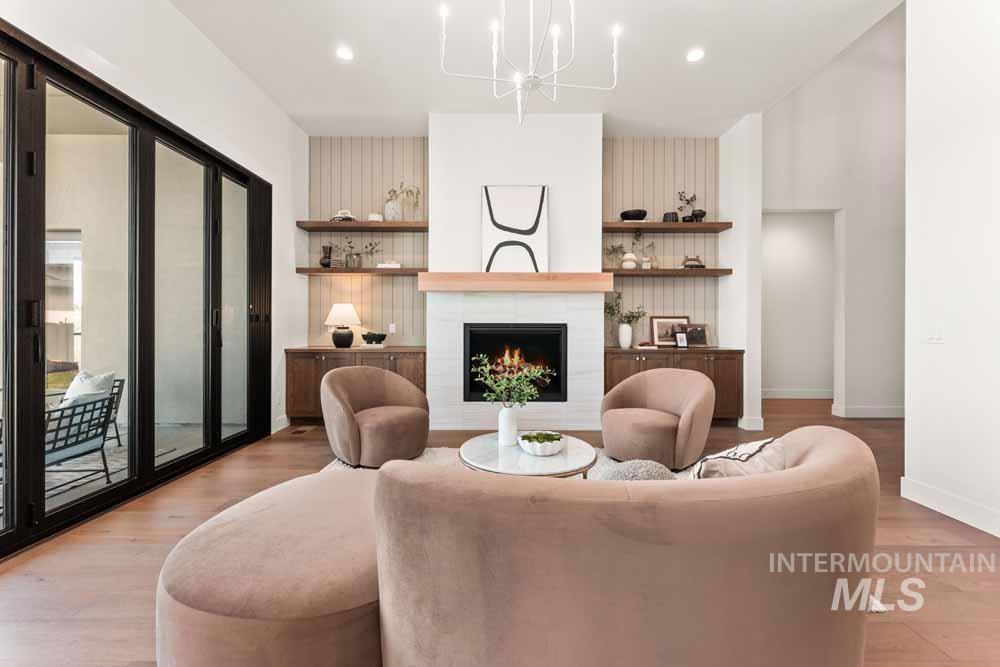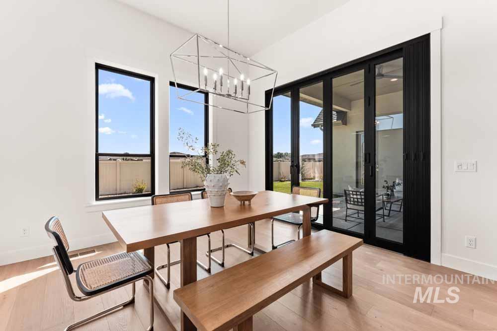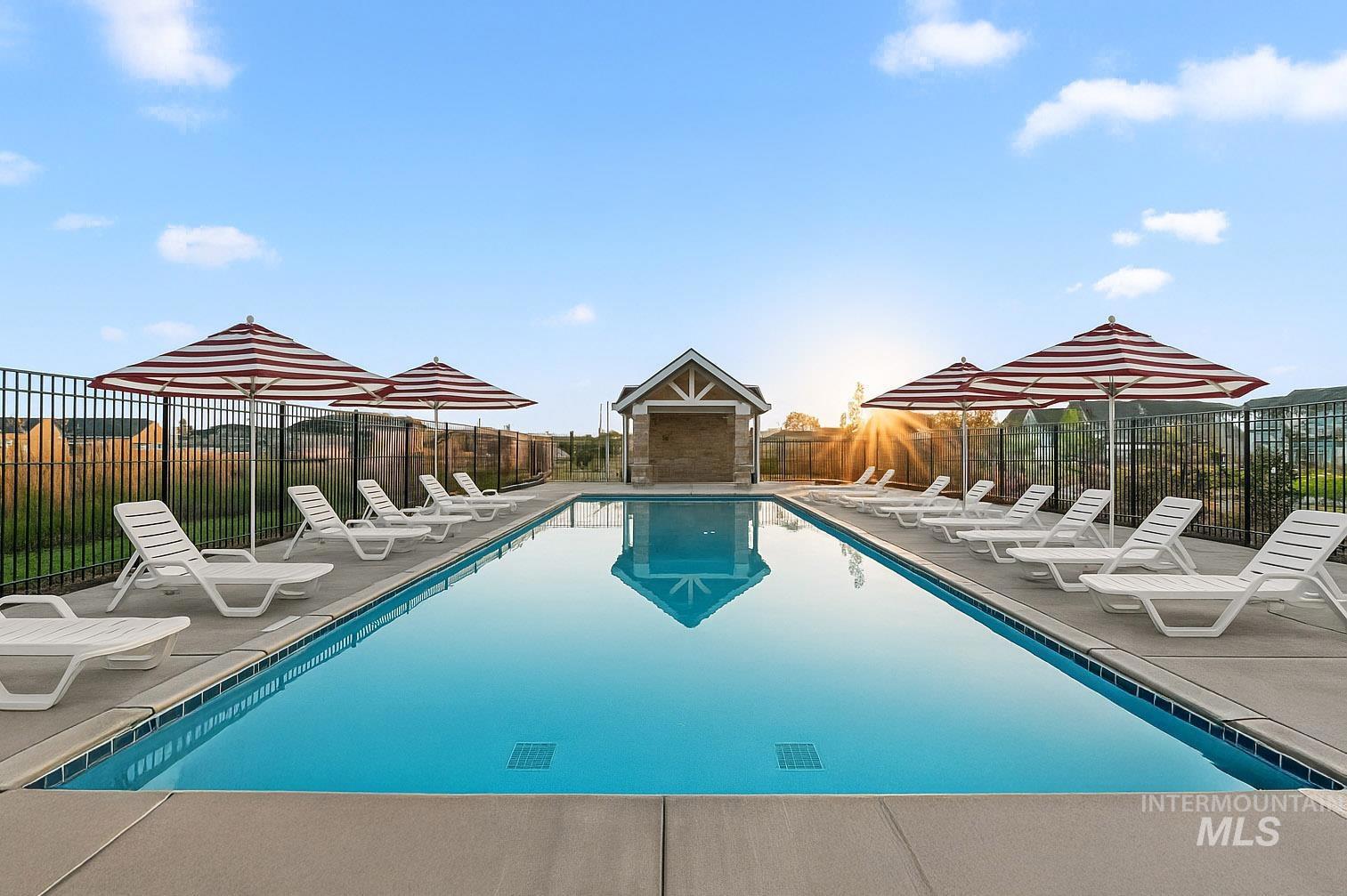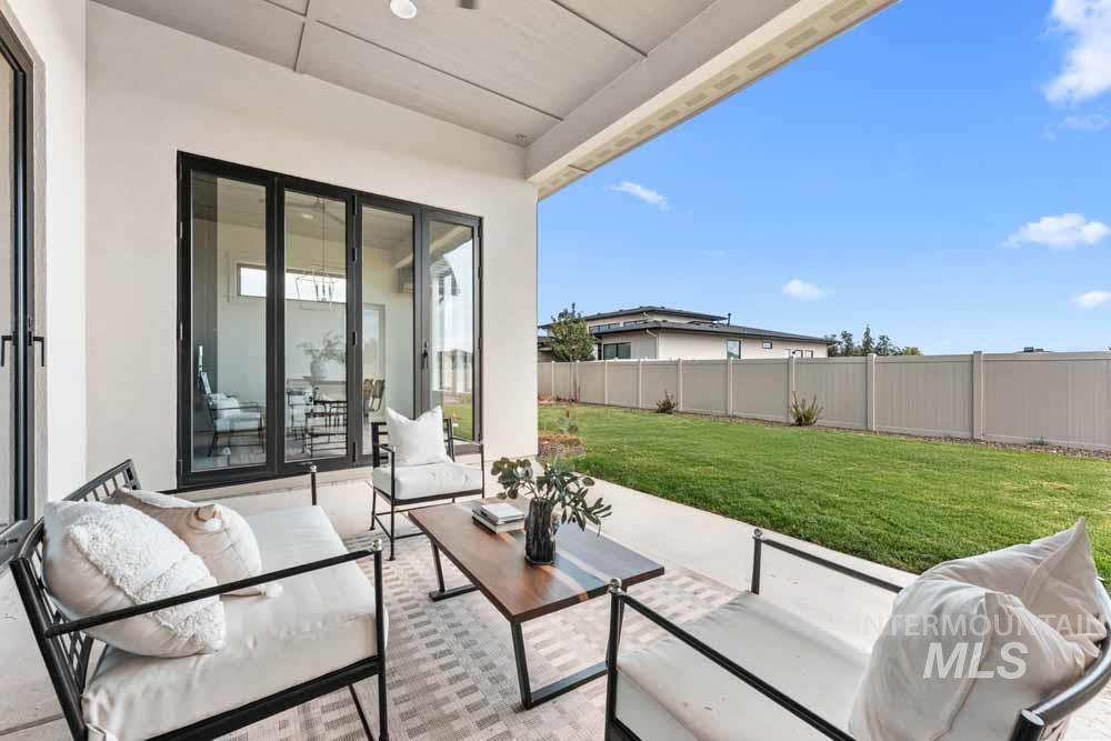 This beautiful Iron Oak Homes home offers comfortable single-level living, plus a bonus retreat upstairs for added space and flexibility! Enjoy a spacious open layout with soaring ceilings, Andersen windows, elegant finishes, and designer lighting. The great room showcases a floor-to-ceiling fireplace and Steelsen Telescopic doors to a covered patio. The gourmet kitchen boasts designer stainless appliances, ceiling-height two-tone cabinetry, and an oversized prep island. The luxe primary suite offers patio access, a spa-like bath with frameless glass shower, freestanding tub, and dramatic walk-in closet. A flexible 4th bedroom works perfectly as a home office or guest retreat. Upstairs features a large bonus room with its own bathroom. Additional highlights include a garage with oversized boat bay and 13-ft ceilings. Located in Centerra with access to a community pool, walking paths, and close proximity to downtown Eagle!