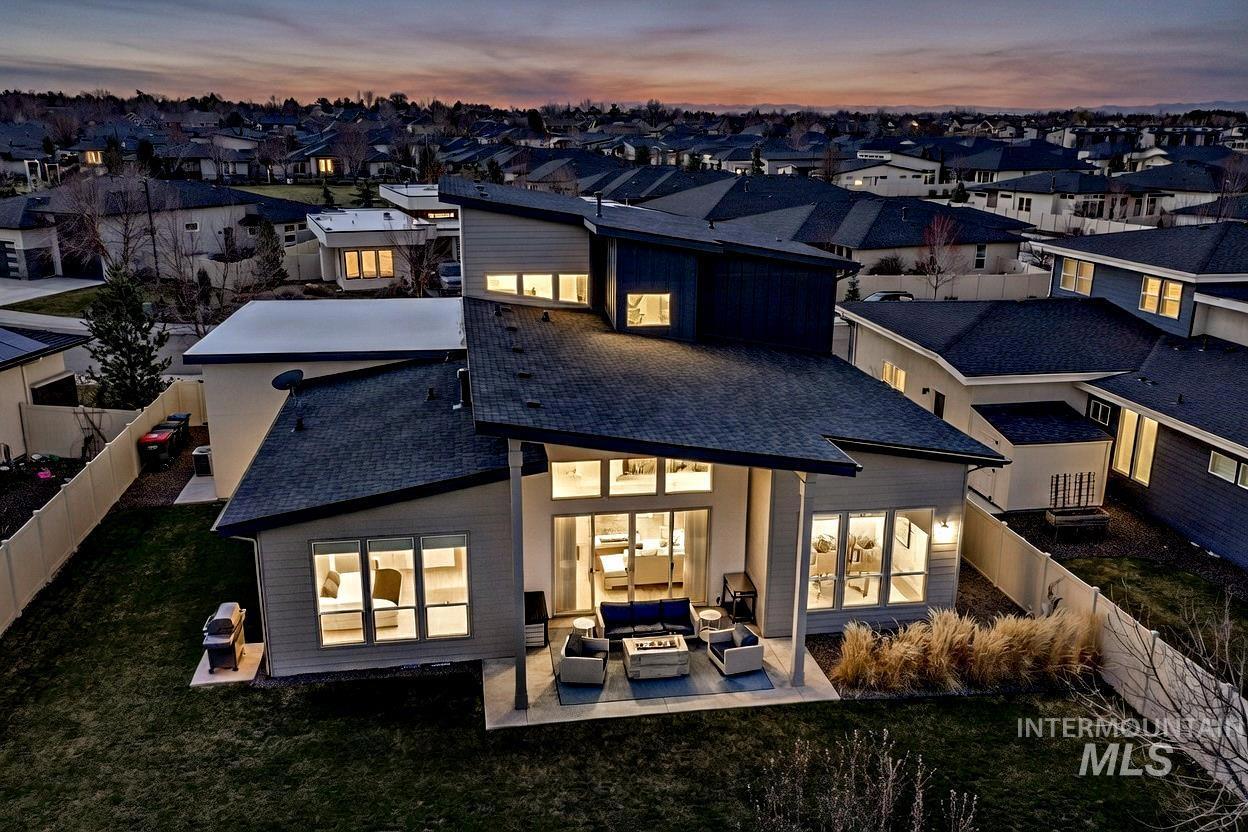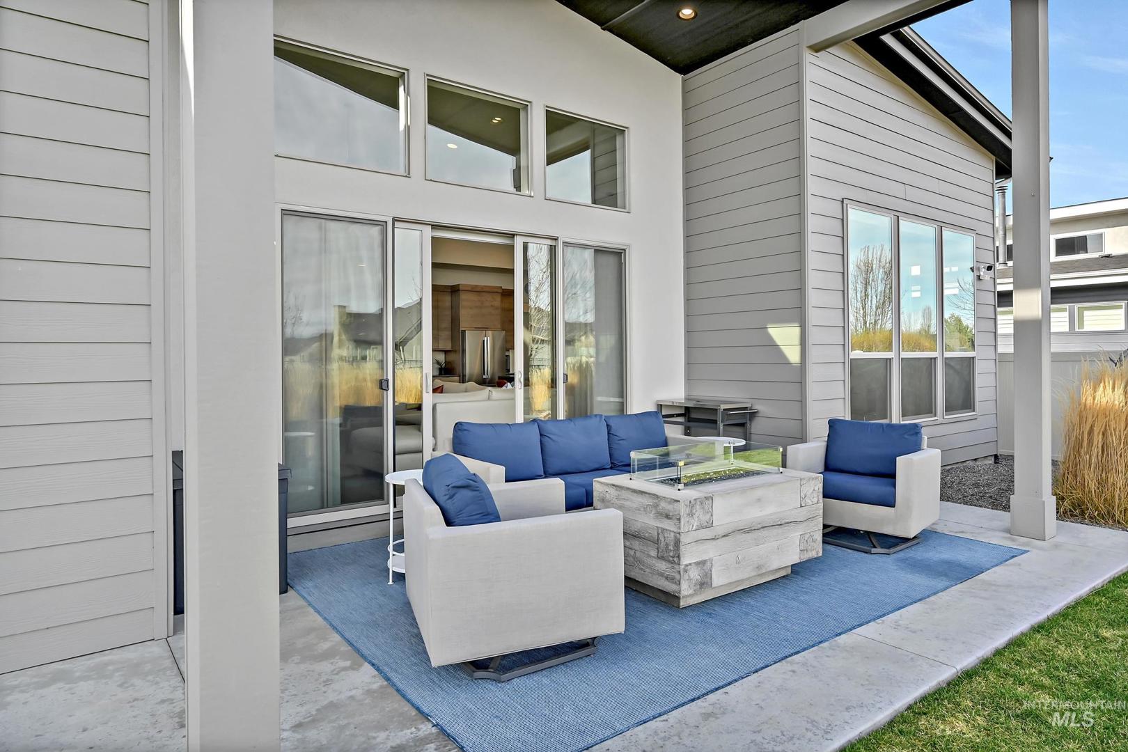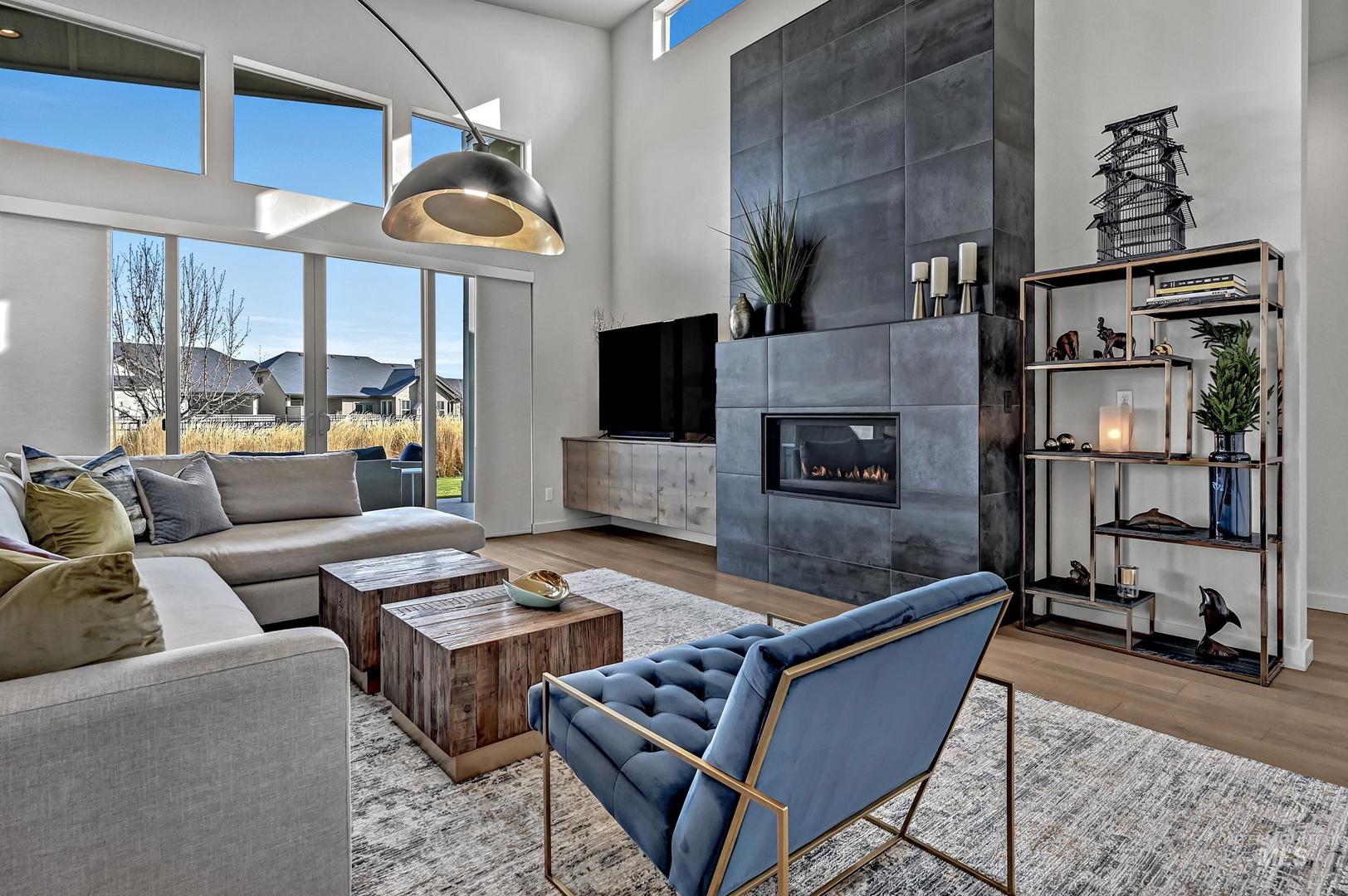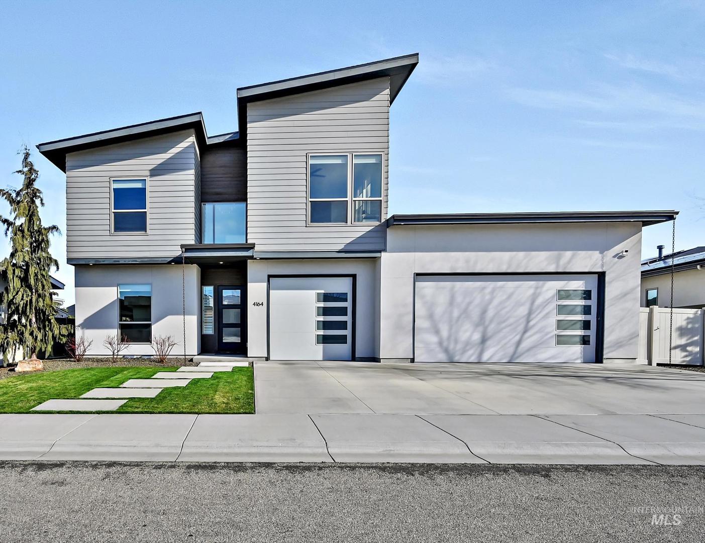 Striking architectural design defines this refined modern luxury home in Movado Estates, one of Meridian’s most desirable communities. The stunning main-level primary suite offers a private retreat featuring a spa-inspired bath with a freestanding soaking tub, walk-in shower, dual vanities, and a spacious walk-in closet. An adjoining laundry room adds everyday convenience. A second bedroom or office and full bath on the main level provide exceptional flexibility for guests or remote work. Designed for both daily living and entertaining, the chef-inspired kitchen showcases a large quartz island, premium cabinetry, high-end appliances, and a butler’s pantry. The open-concept great room features soaring 18-foot ceilings, expansive windows that flood the home with natural light, and a dramatic feature-wall gas fireplace. Enjoy seamless indoor-outdoor living with an expansive covered patio overlooking Five Mile Creek and captivating mountain views—perfect for relaxing or hosting gatherings. The upper level offers a spacious second great room, two additional bedrooms, a full bath, and versatile multi-use spaces—an ideal retreat for the younger generation or extended living. Additional highlights include abundant storage throughout, an oversized three-car garage, and the exciting potential for a future rooftop balcony to take full advantage of the surrounding views.