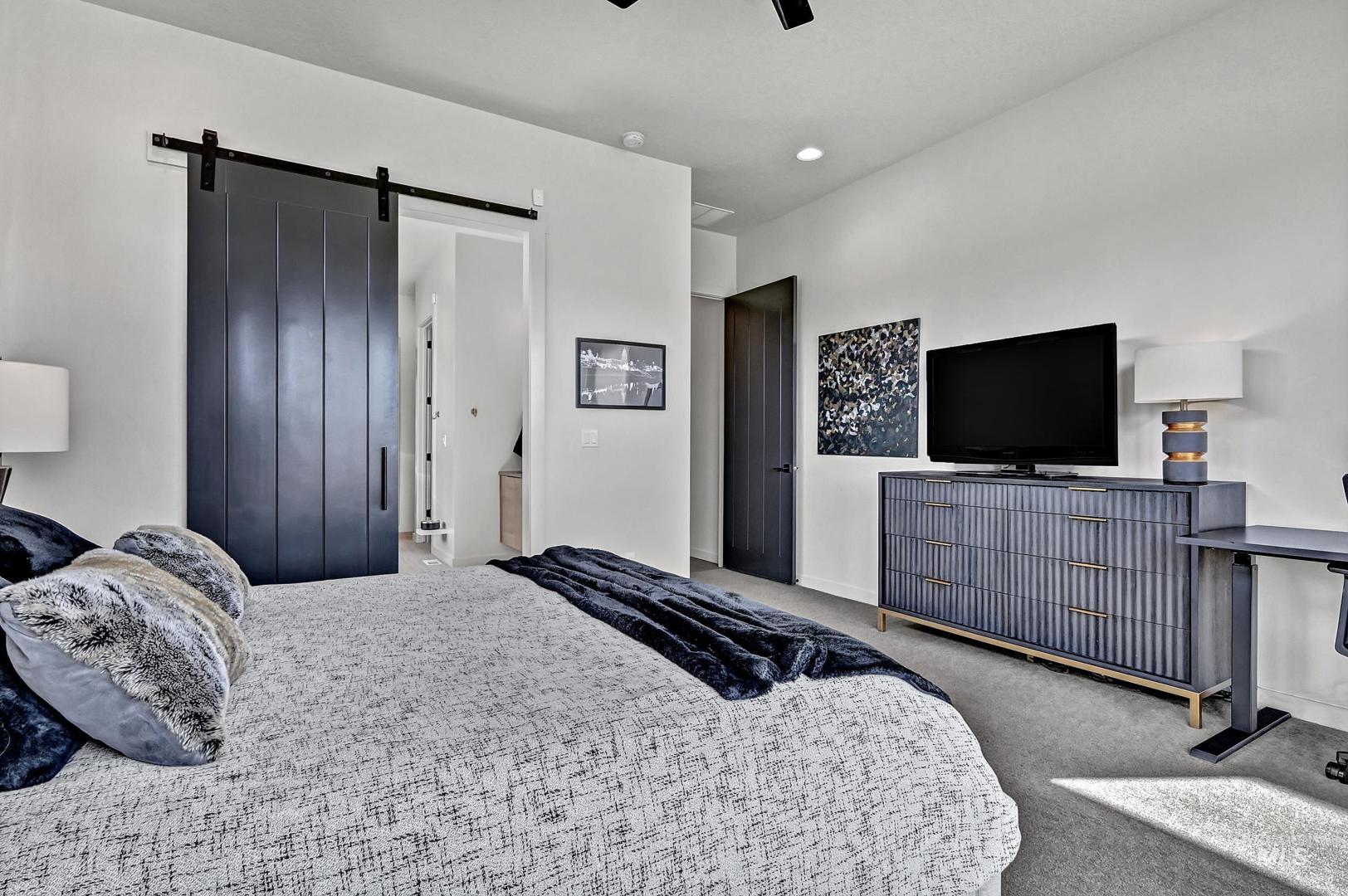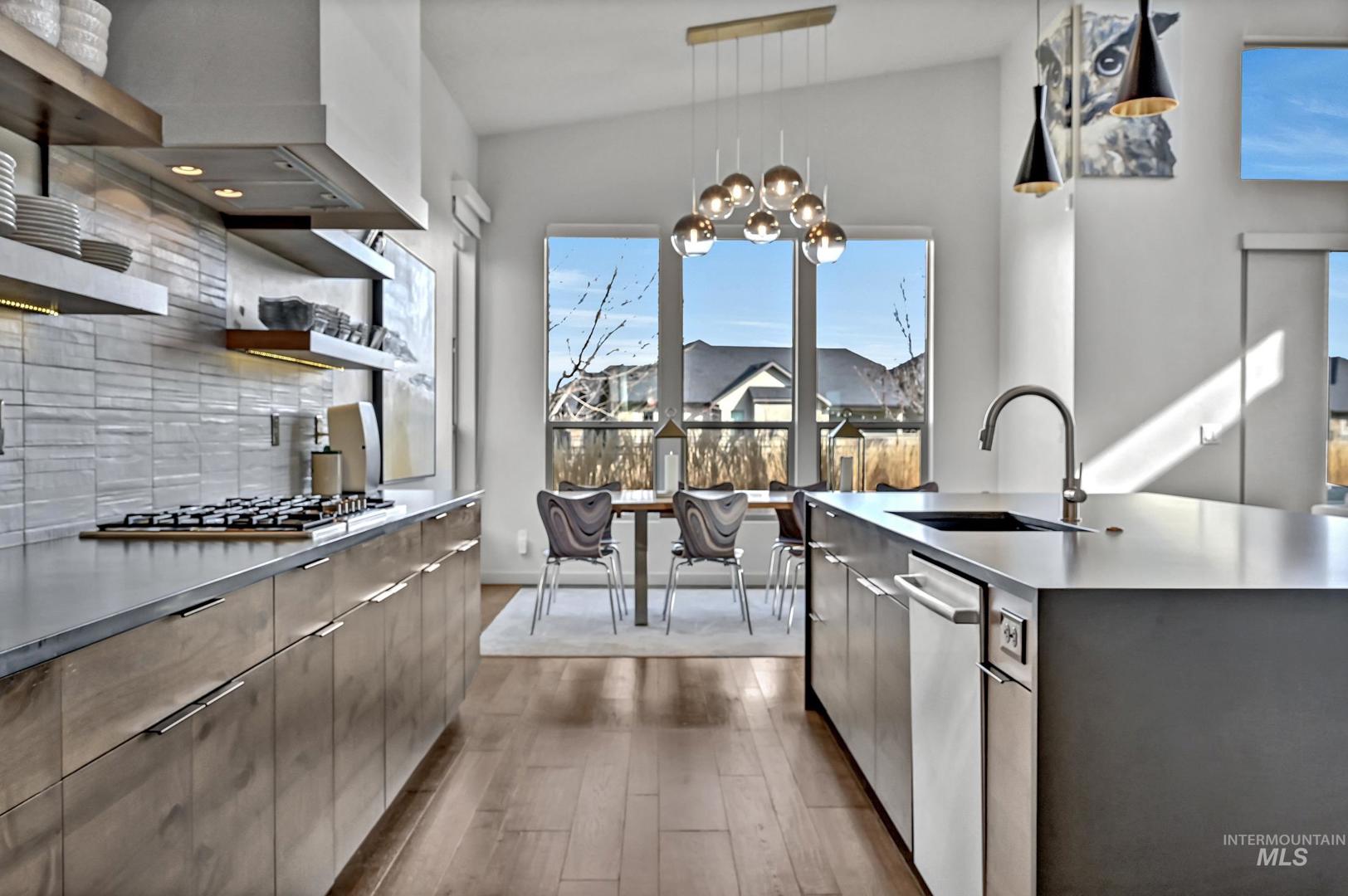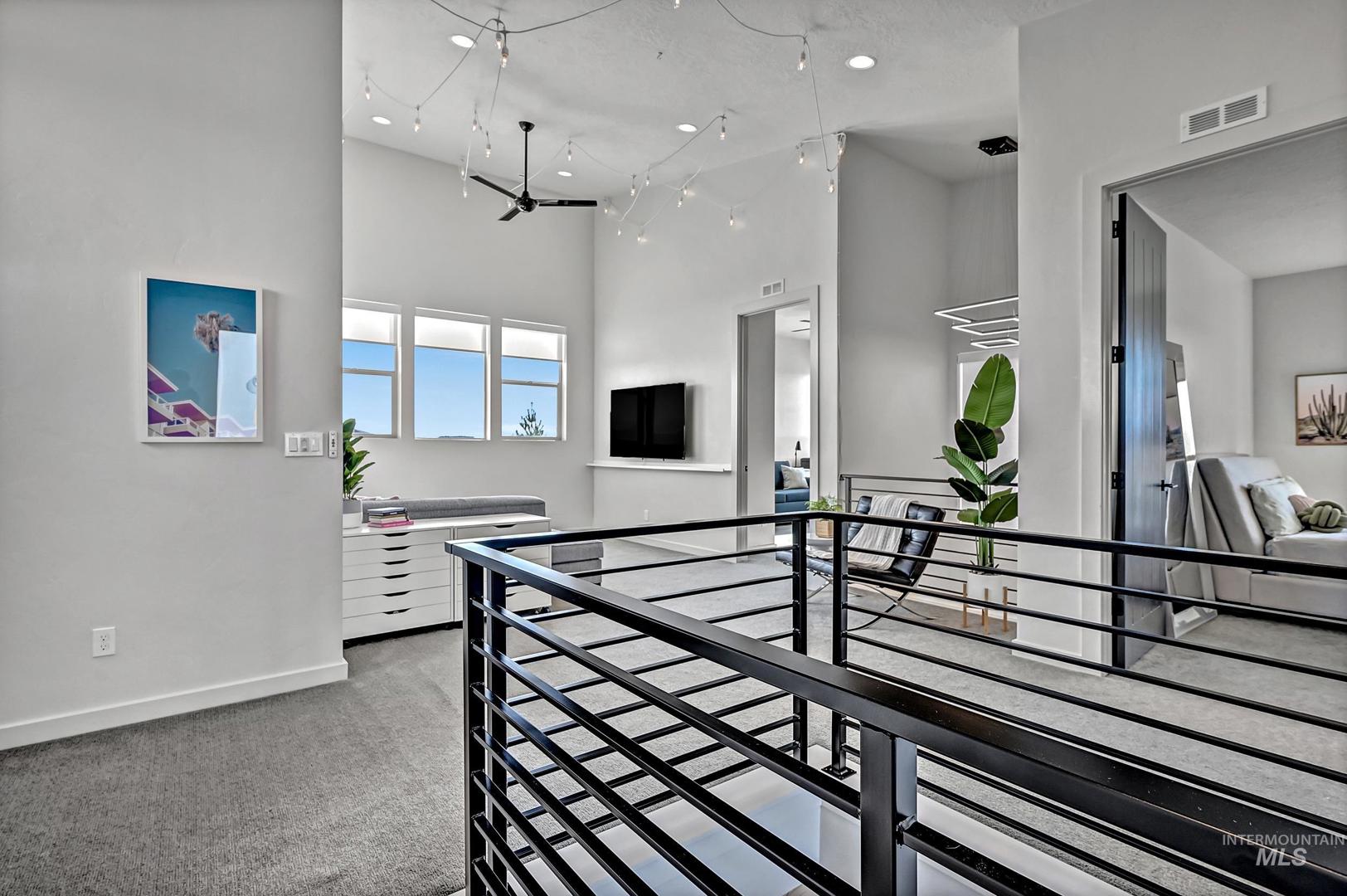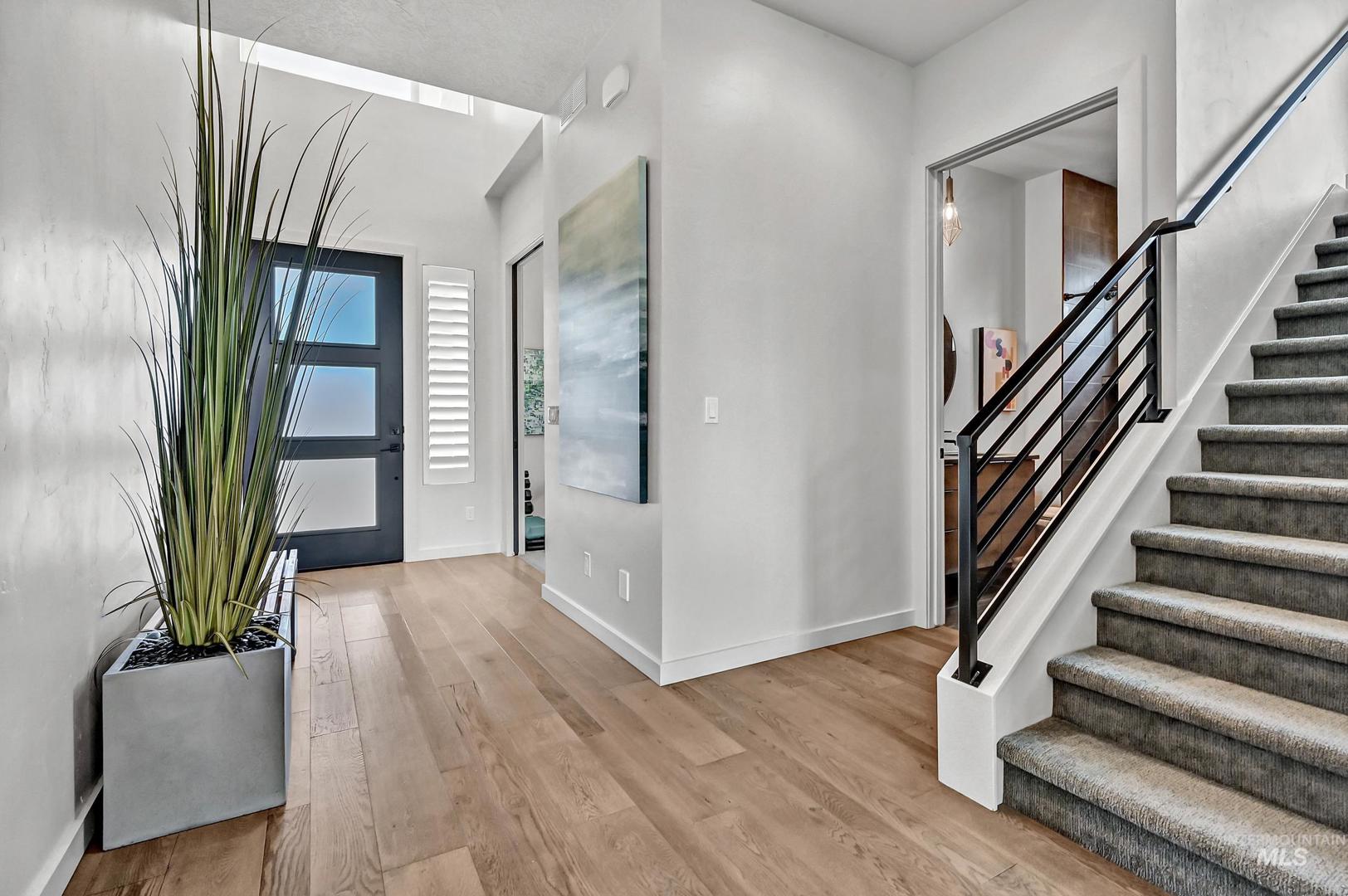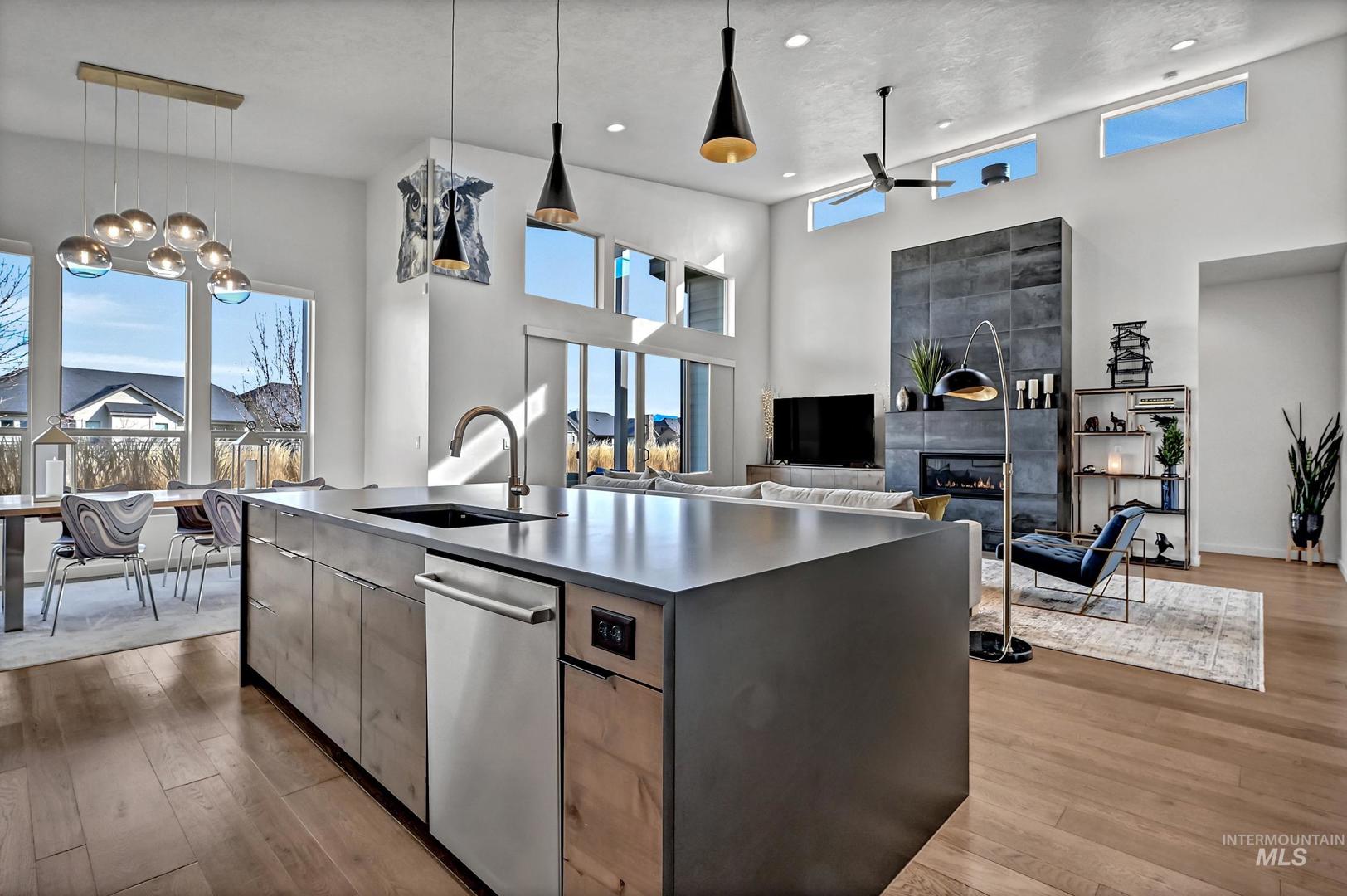 Striking architectural design defines this refined modern luxury home in Movado Estates, one of Meridian’s most desirable communities. The stunning main-level primary suite offers a private retreat featuring a spa-inspired bath with a freestanding soaking tub, walk-in shower, dual vanities, and a spacious walk-in closet. An adjoining laundry room adds everyday convenience. A second bedroom or office and full bath on the main level provide exceptional flexibility for guests or remote work. Designed for both daily living and entertaining, the chef-inspired kitchen showcases a large quartz island, premium cabinetry, high-end appliances, and a butler’s pantry. The open-concept great room features soaring 18-foot ceilings, expansive windows that flood the home with natural light, and a dramatic feature-wall gas fireplace. Enjoy seamless indoor-outdoor living with an expansive covered patio overlooking Five Mile Creek and captivating mountain views—perfect for relaxing or hosting gatherings. The upper level offers a spacious second great room, two additional bedrooms, a full bath, and versatile multi-use spaces—an ideal retreat for the younger generation or extended living. Additional highlights include abundant storage throughout, an oversized three-car garage, and the exciting potential for a future rooftop balcony to take full advantage of the surrounding views.