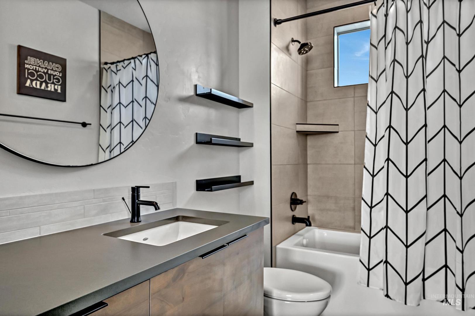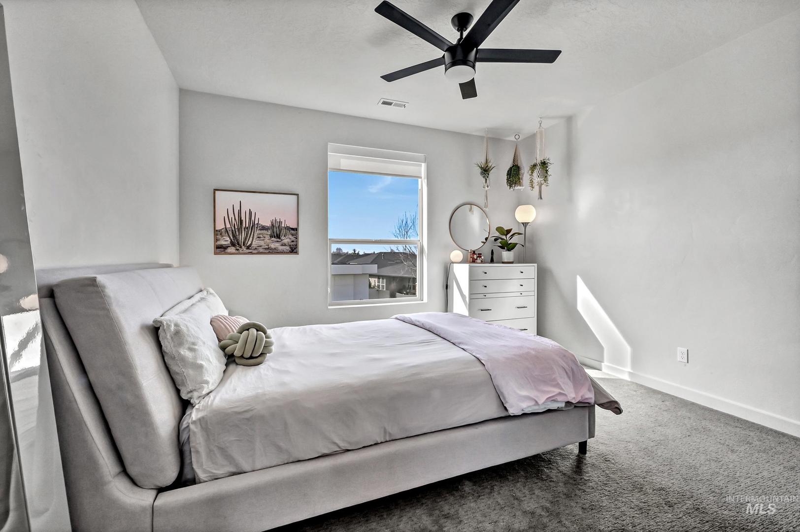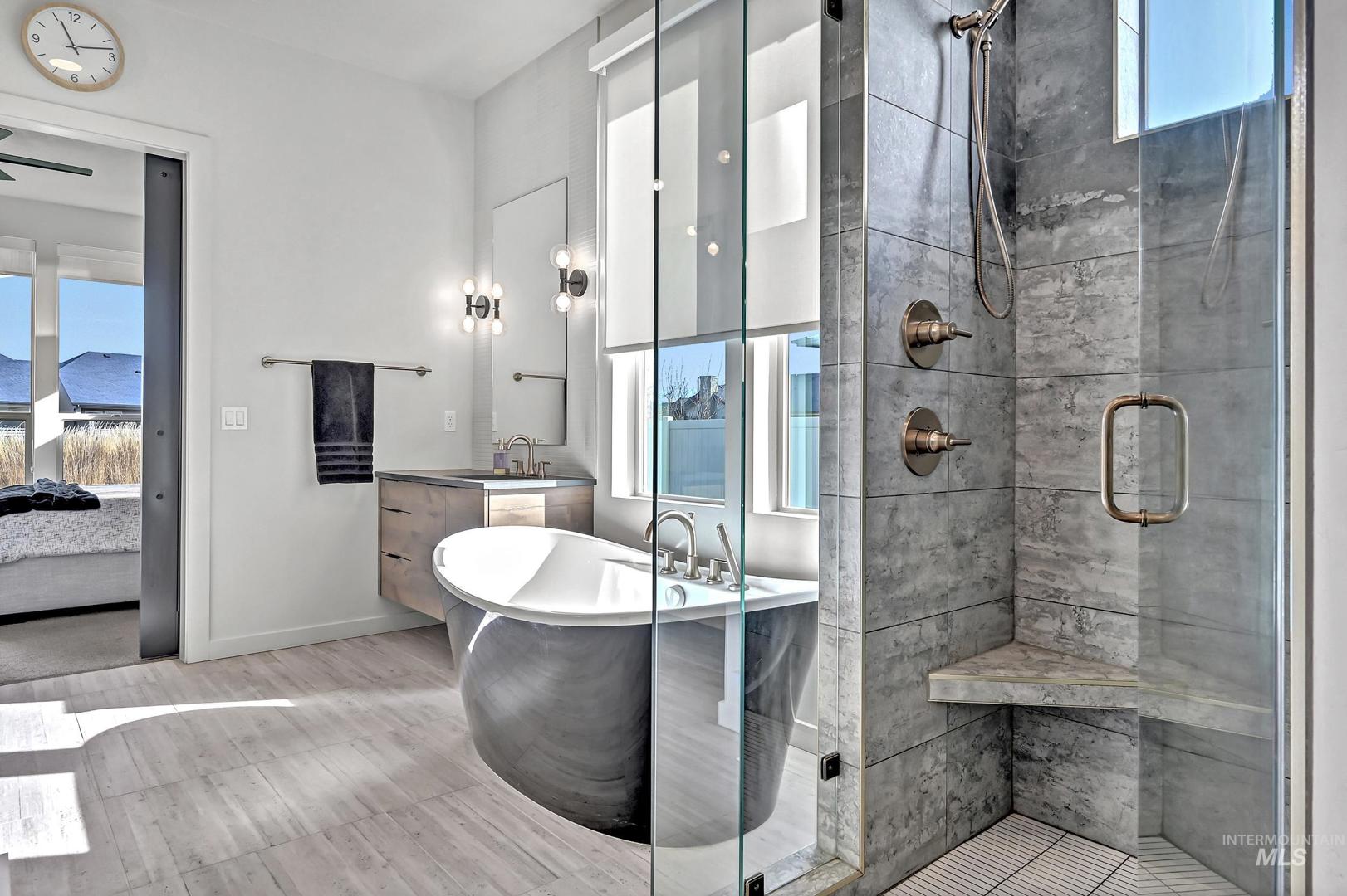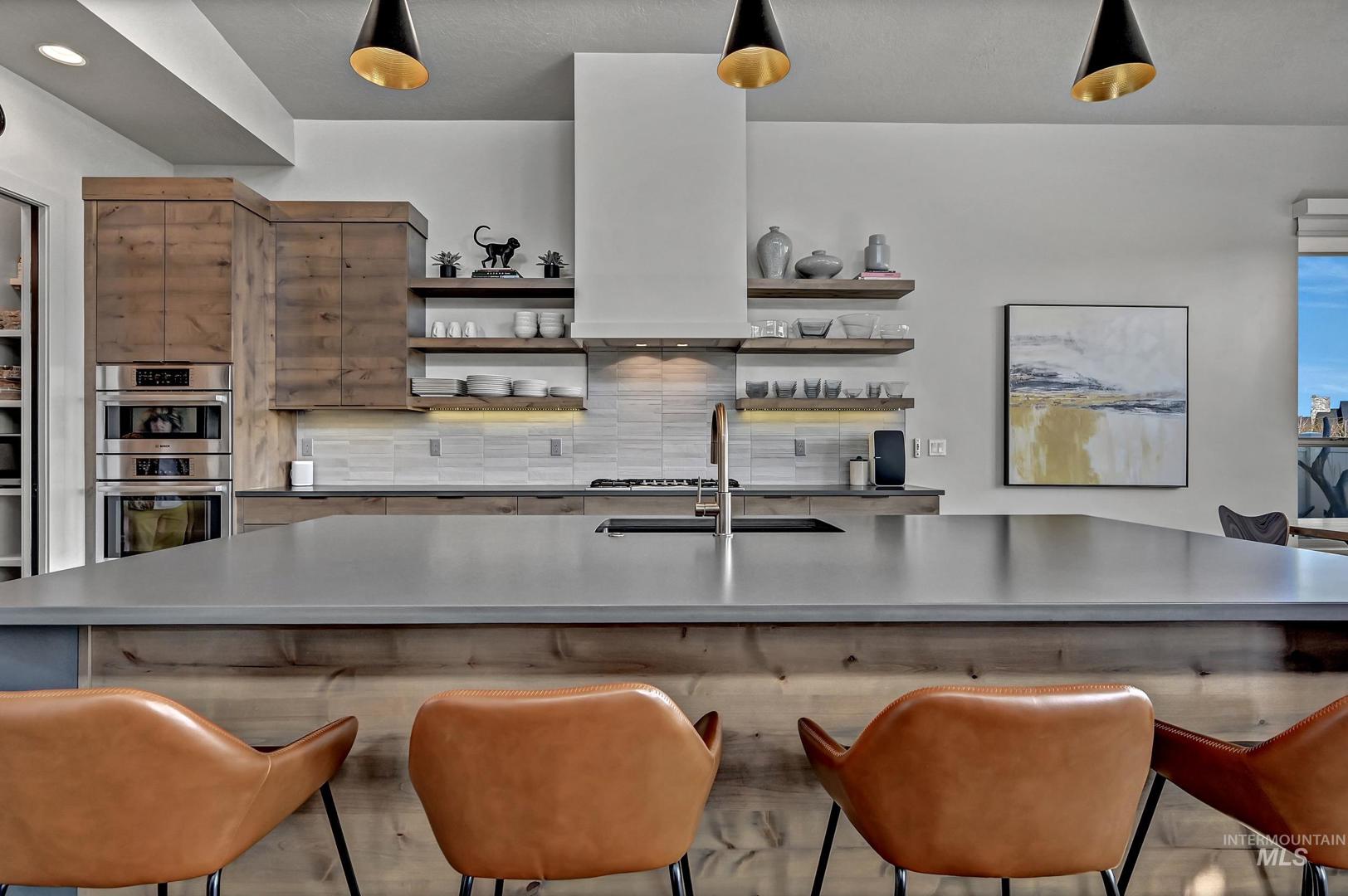 Striking architectural design defines this refined modern luxury home in Movado Estates, one of Meridian’s most desirable communities. The stunning main-level primary suite offers a private retreat featuring a spa-inspired bath with a freestanding soaking tub, walk-in shower, dual vanities, and a spacious walk-in closet. An adjoining laundry room adds everyday convenience. A second bedroom or office and full bath on the main level provide exceptional flexibility for guests or remote work. Designed for both daily living and entertaining, the chef-inspired kitchen showcases a large quartz island, premium cabinetry, high-end appliances, and a butler’s pantry. The open-concept great room features soaring 18-foot ceilings, expansive windows that flood the home with natural light, and a dramatic feature-wall gas fireplace. Enjoy seamless indoor-outdoor living with an expansive covered patio overlooking Five Mile Creek and captivating mountain views—perfect for relaxing or hosting gatherings. The upper level offers a spacious second great room, two additional bedrooms, a full bath, and versatile multi-use spaces—an ideal retreat for the younger generation or extended living. Additional highlights include abundant storage throughout, an oversized three-car garage, and the exciting potential for a future rooftop balcony to take full advantage of the surrounding views.