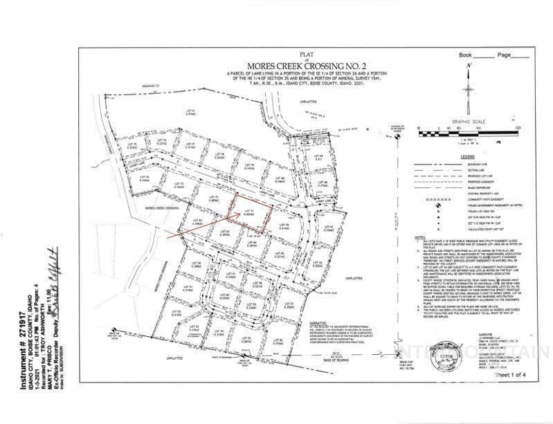 Incredible opportunity to own a .40-acre mountain lot in the desirable Mores Creek Crossing community in the heart of Idaho City. Bring your own builder & design the custom retreat you’ve always envisioned. Surrounded by breathtaking mountain views & located near Mores Creek, this property is perfect for outdoor enthusiasts w/endless ATV trails, snowmobiling, scenic hiking, fishing spots & nearby hot springs to explore. Enjoy the peace & beauty of mountain living while still being just minutes from the charm of historic Idaho City. This unique mountain town offers local restaurants, shops, essential amenities & a rich Gold Rush history that gives the area its distinctive character. Whether you`re dreaming of a cozy getaway cabin or a full-time mountain residence, this homesite offers the perfect setting to create your own private retreat while enjoying year-round recreation & the welcoming atmosphere of a vibrant mountain community. All utilities are installed to property line. No need to drill well or septic