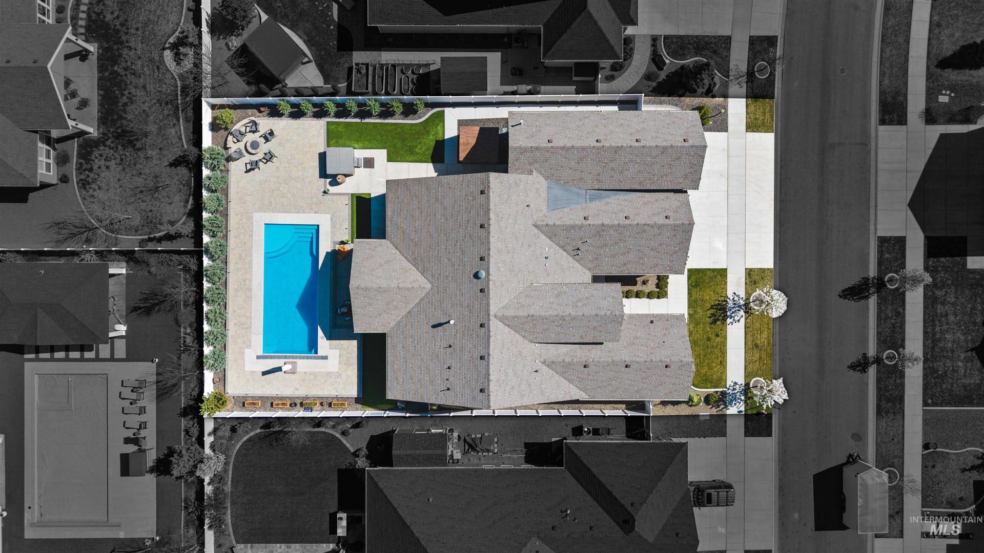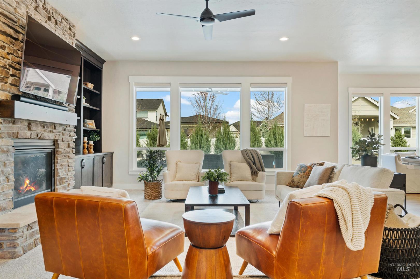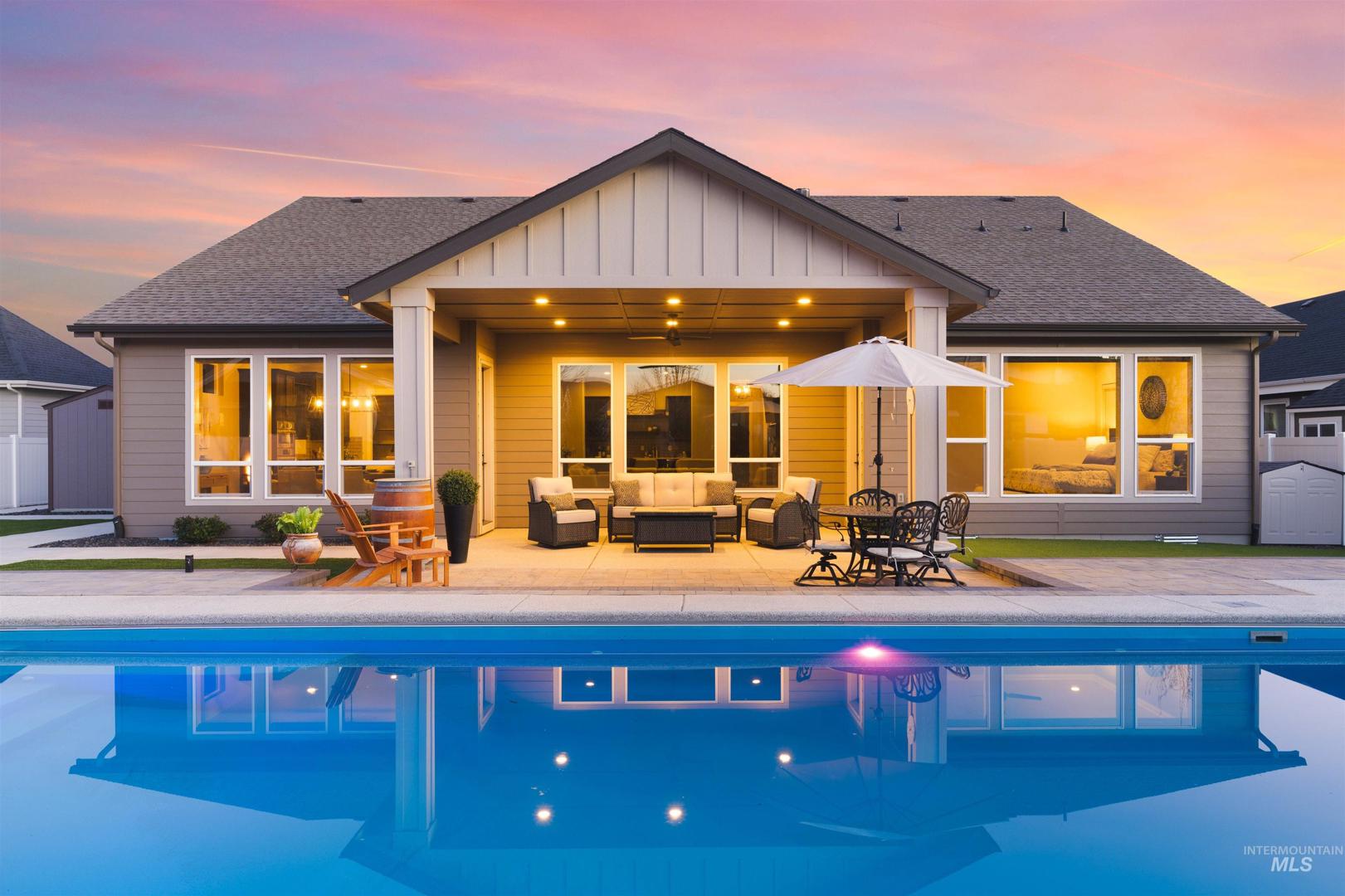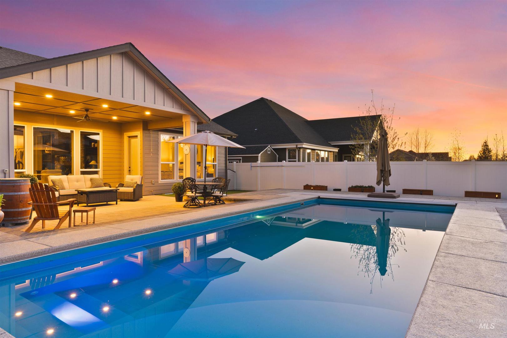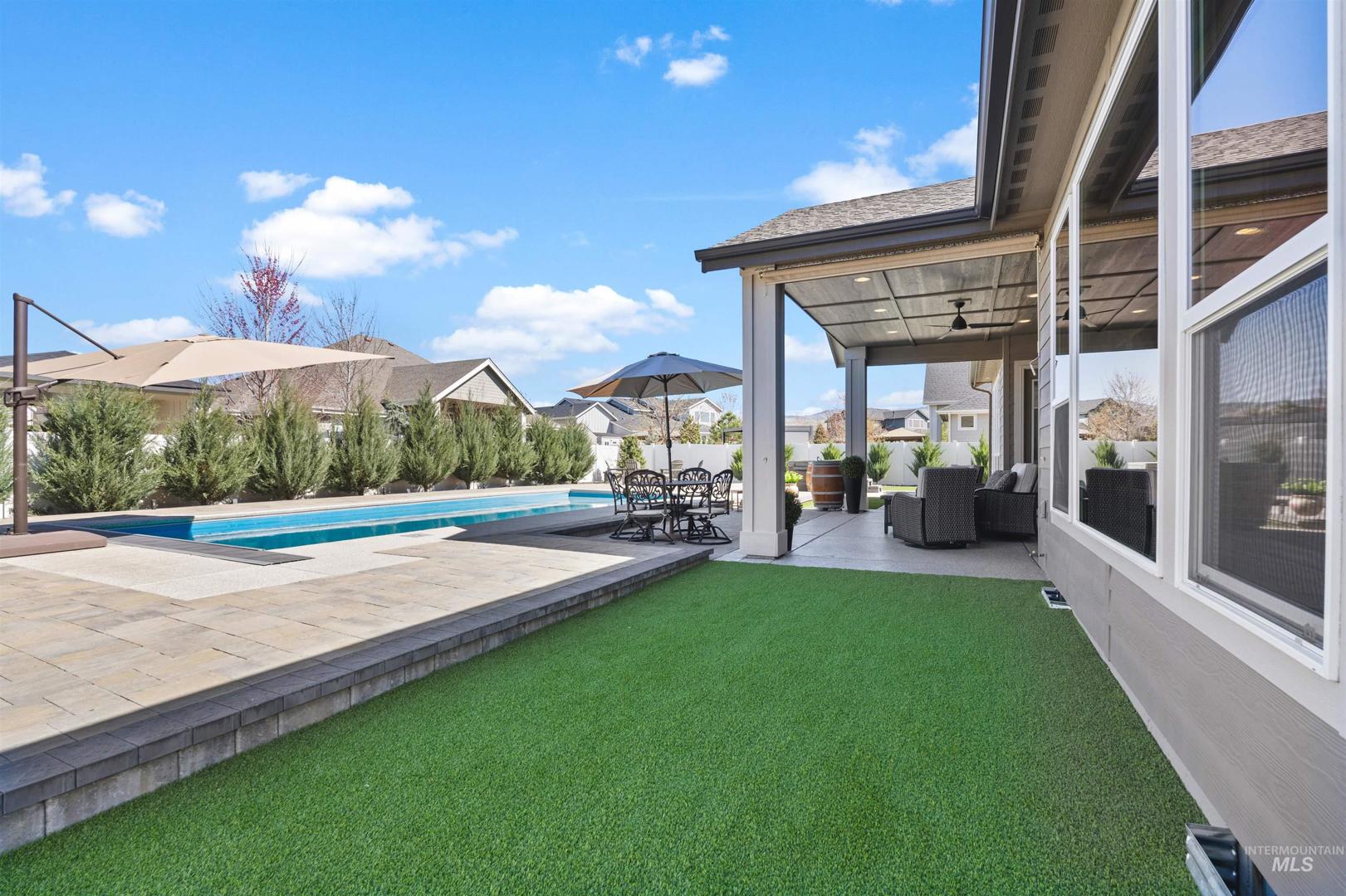 Designed for resort-style living and effortless entertaining, this home showcases a backyard retreat that truly sets it apart, complete with a heated pool, hot tub, expansive paver patio, turf and a striking high BTU firepit lounge area for year-round enjoyment. Interior opens to a spacious great room with floor-to-ceiling stone fireplace, custom built-ins & wine bar, flowing seamlessly into a chef’s kitchen featuring quartz countertops, large island, Bosch appliances, gas cooktop, double ovens, rich wood cabinetry and walk-in pantry. Hardwood flooring enhances the warmth and continuity. The primary suite delivers a spa-like experience with heated tile floors, freestanding soaking tub, dual-head walk-in shower & walk-in closet. All three bedrooms offer private ensuite baths plus an additional half bath for guests and a separate office. Additional upgrades- reverse osmosis, whole house humidifier, power blinds, professionally installed privacy film on rear windows, power pool cover & turf backyard. 3 car garage plus a 45 ft RV bay complete with RV dump, epoxy flooring & gas garage heater. Located in Dry Creek Ranch with pools, 8,840 sqft clubhouse, fitness center, pickleball, volleyball, basketball, walking trails, managed neighborhood farm, & equestrian amenities, all surrounded by foothill views. RV homes with this level of outdoor living and community access are rarely available.