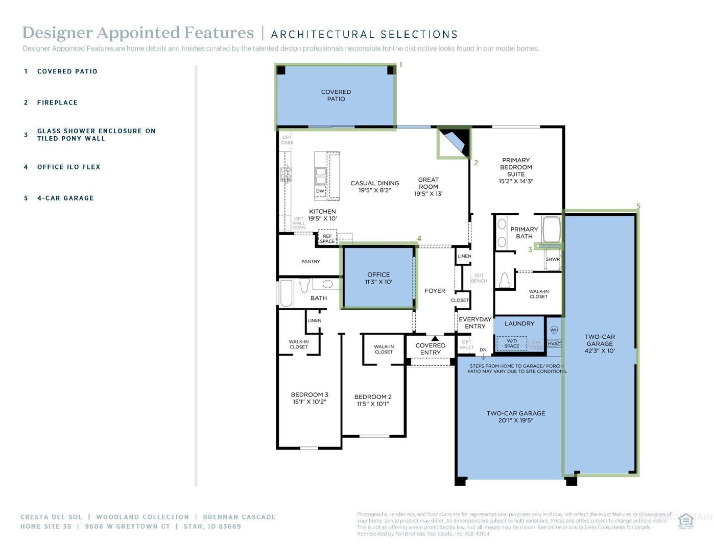 An inviting foyer and flex room flow into the Brennan`s expansive great room and casual dining area with desirable covered patio access. Adjacent, the well-designed kitchen is complete with a large center island with breakfast bar, ample counter and cabinet space, and a generous pantry. The magnificent primary bedroom is enhanced by a spacious walk-in closet and an alluring primary bath with a dual-sink vanity, a large soaking tub, a luxe shower, and a private water closet. Secondary bedrooms feature walk-in closets and share a hall bath. Additional highlights include a private home office, conveniently located laundry off the everyday entry and plenty of additional storage. 3 car garage. BTVAI