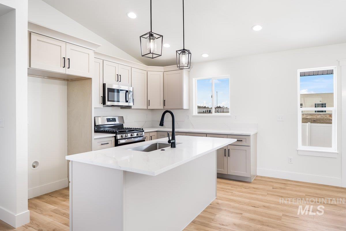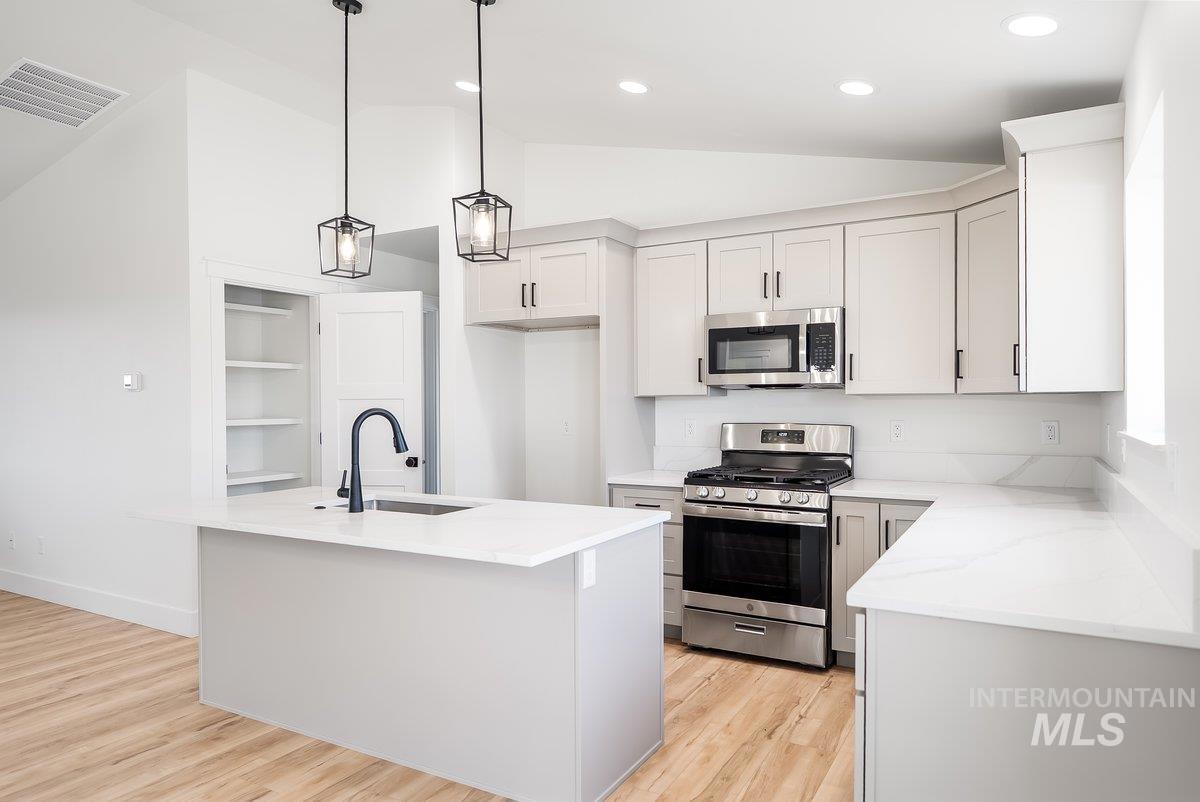 This brand-new home offers a spacious, single-level open-concept floor plan with 4 bedrooms and 2 bathrooms across 1,482 square feet. Built by CA Homes, LLC—People’s Choice Winner of the 2023, 2024, 2025 Parade of Homes—this residence showcases quality craftsmanship and thoughtful design. Interior finishes include luxury vinyl plank flooring with low-pile carpet in the bedrooms, sleek white quartz countertops, and stainless steel appliances. The kitchen is equipped with a four-burner gas cooktop with griddle, electric oven, and abundant storage space. Vaulted ceilings and modern farmhouse accents—such as stylish cabinet pulls and designer lighting—add charm and character throughout. The primary suite features dual vanities in the bathroom, enhancing comfort and functionality. The home is filled with natural light, and the finished 2-car garage provides additional convenience.