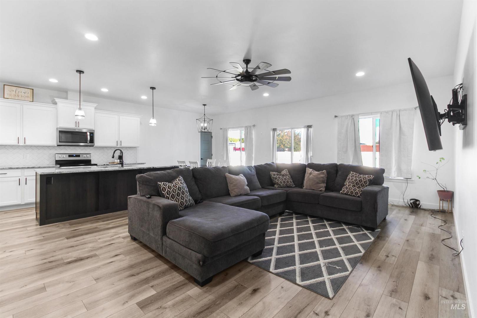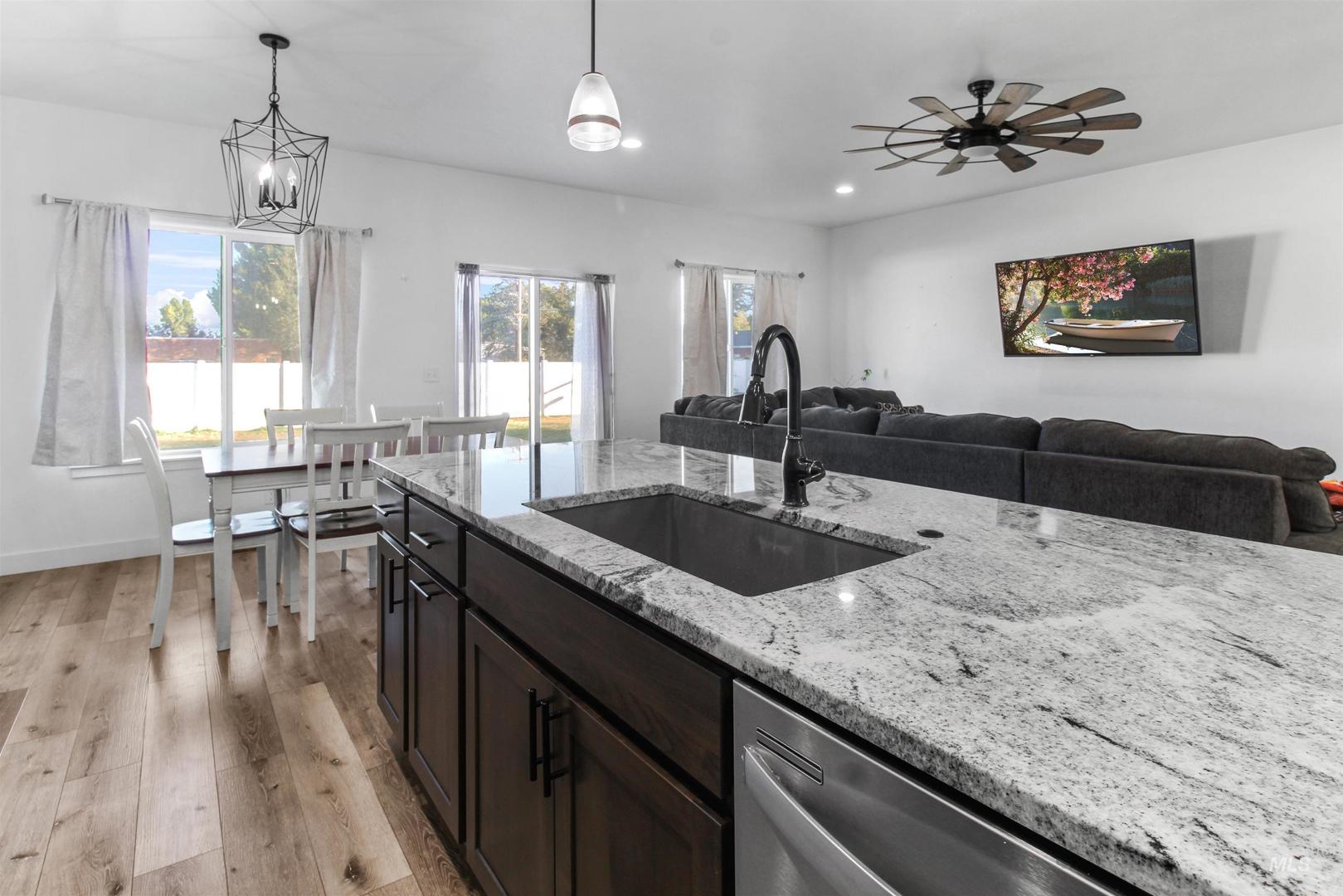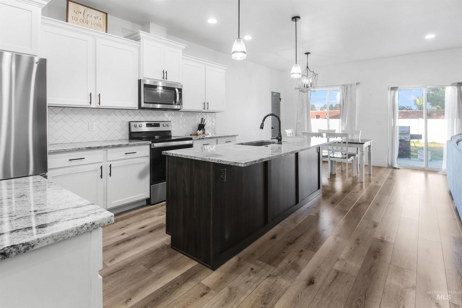 Welcome to this beautiful 4-bedroom, 2-bath home perfectly situated on a spacious corner lot in one of Burley’s most peaceful neighborhoods! Built in 2022, this modern home features an open floor plan with a large kitchen island, farmhouse sink, and stunning granite countertops — ideal for entertaining or everyday living. The primary suite offers double vanities and a walk-in closet for plenty of space and comfort. Enjoy low-maintenance vinyl fencing, automatic sprinklers, and a two-car garage. Located within walking distance to schools, the City Pool, and the Rec Center — this home blends convenience, comfort, and charm. Don’t miss your chance to own this move-in-ready gem in the heart of Burley! Landscaping virtually enhanced.