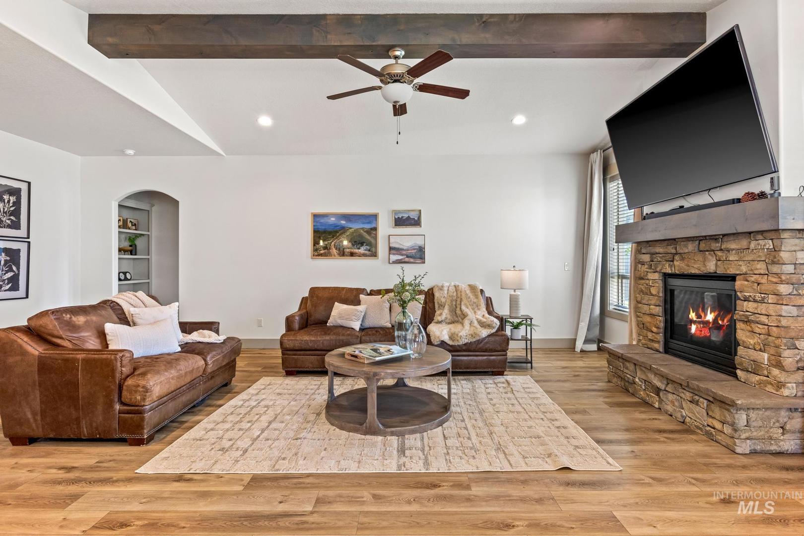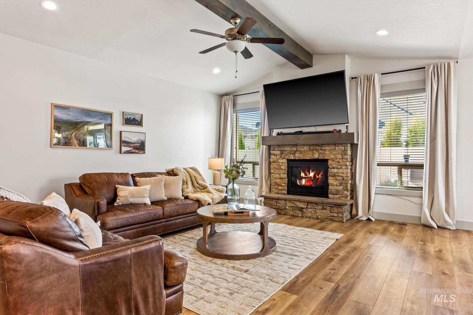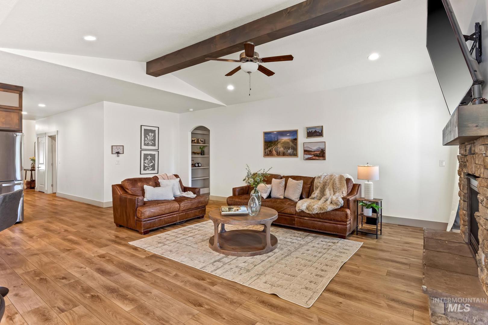 Thoughtfully crafted with high-end finishes and exceptional design, this 3 bed, 2 bath home features an open-concept layout with a warm gas fireplace and a chef’s kitchen complete with Bosch appliances, quartz countertops, and rich stained cabinetry. The owner’s suite offers a spa-like retreat with a zero-entry tiled shower, dual vanities, and a spacious walk-in closet that connects to the laundry room. A large boat bay and expansive yard space add function and flexibility to this beautifully livable home.