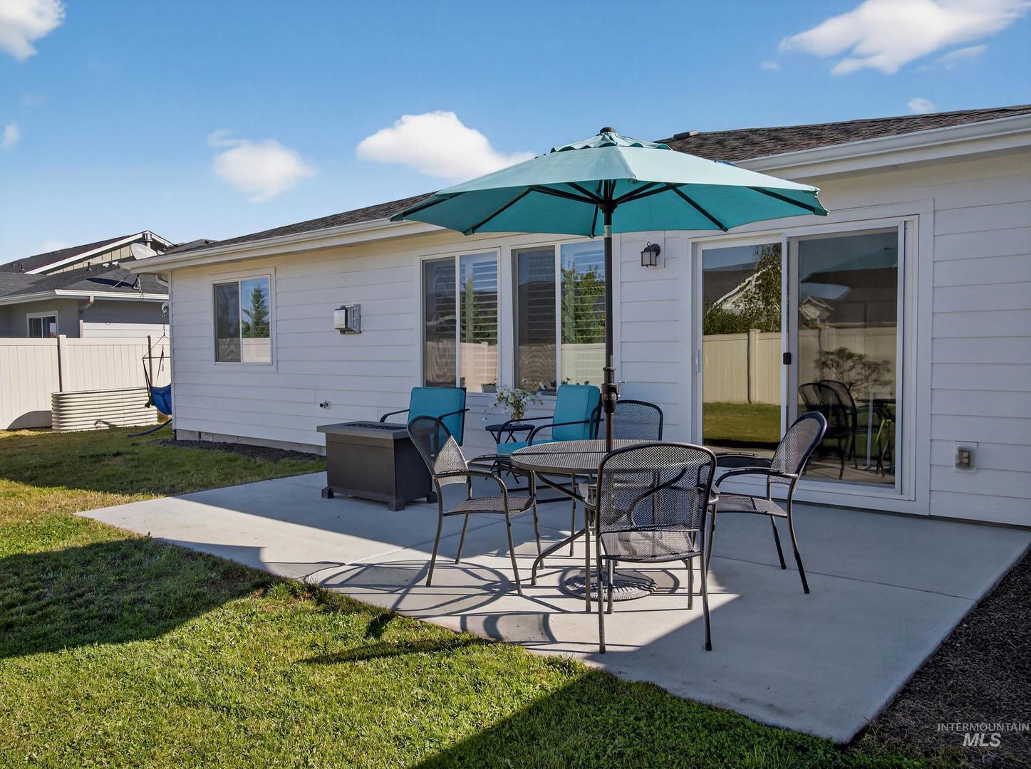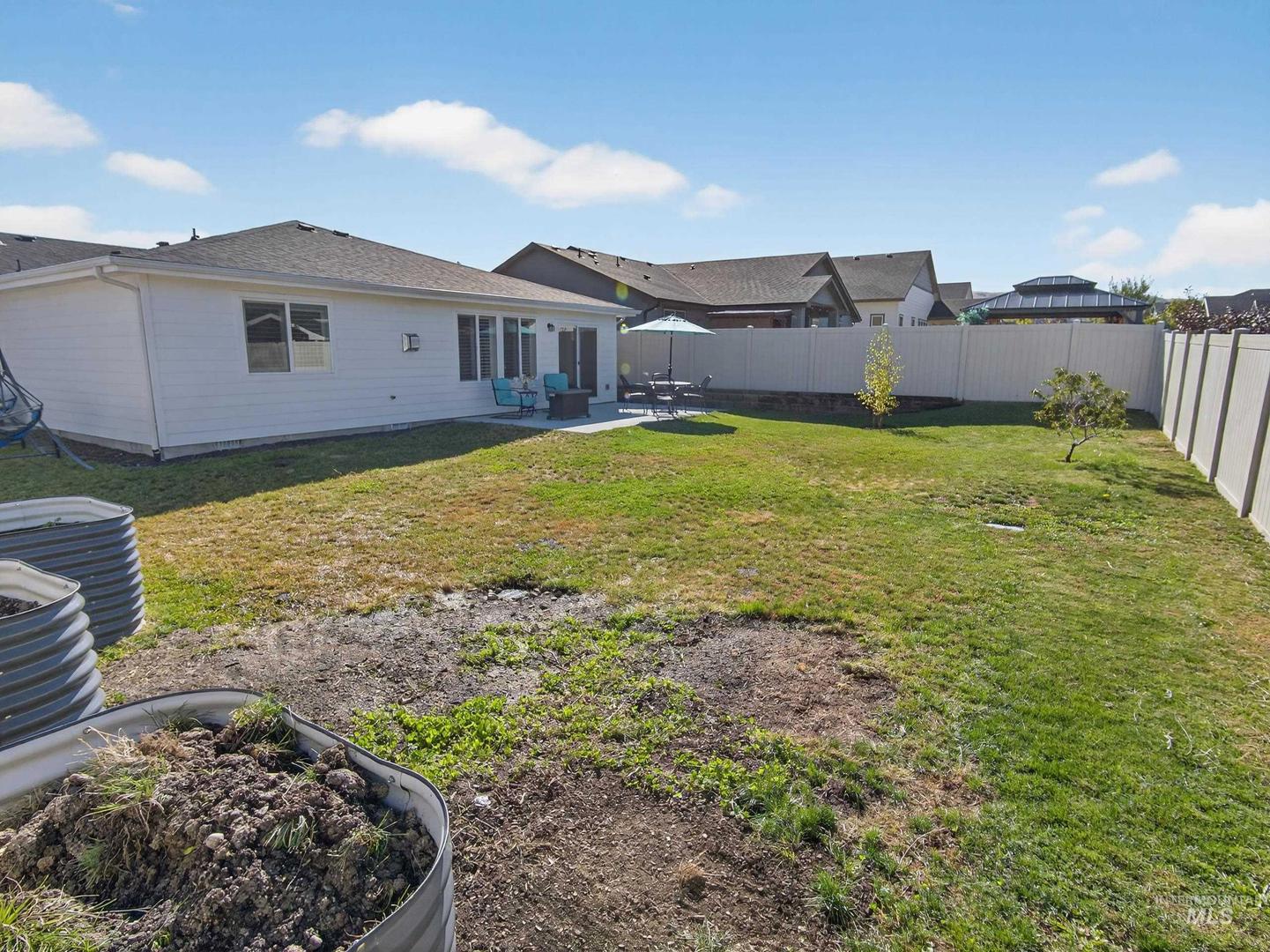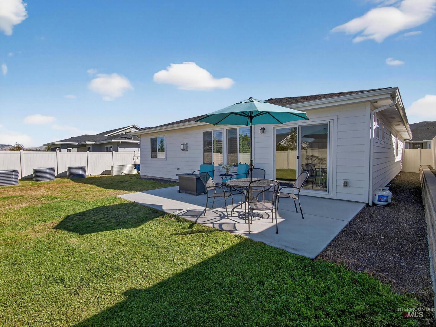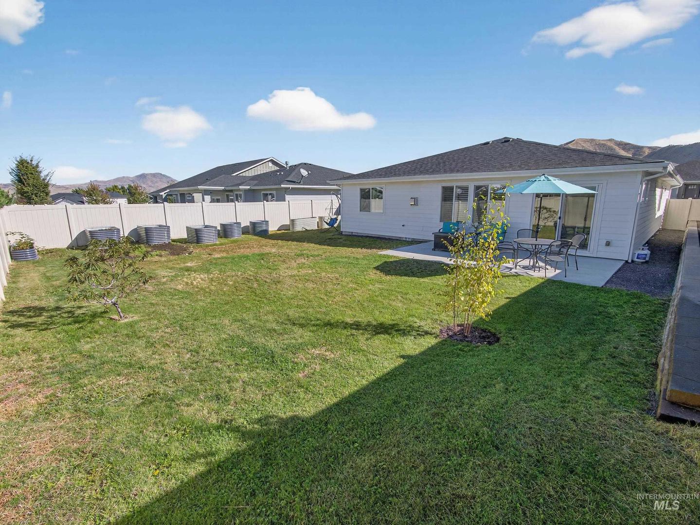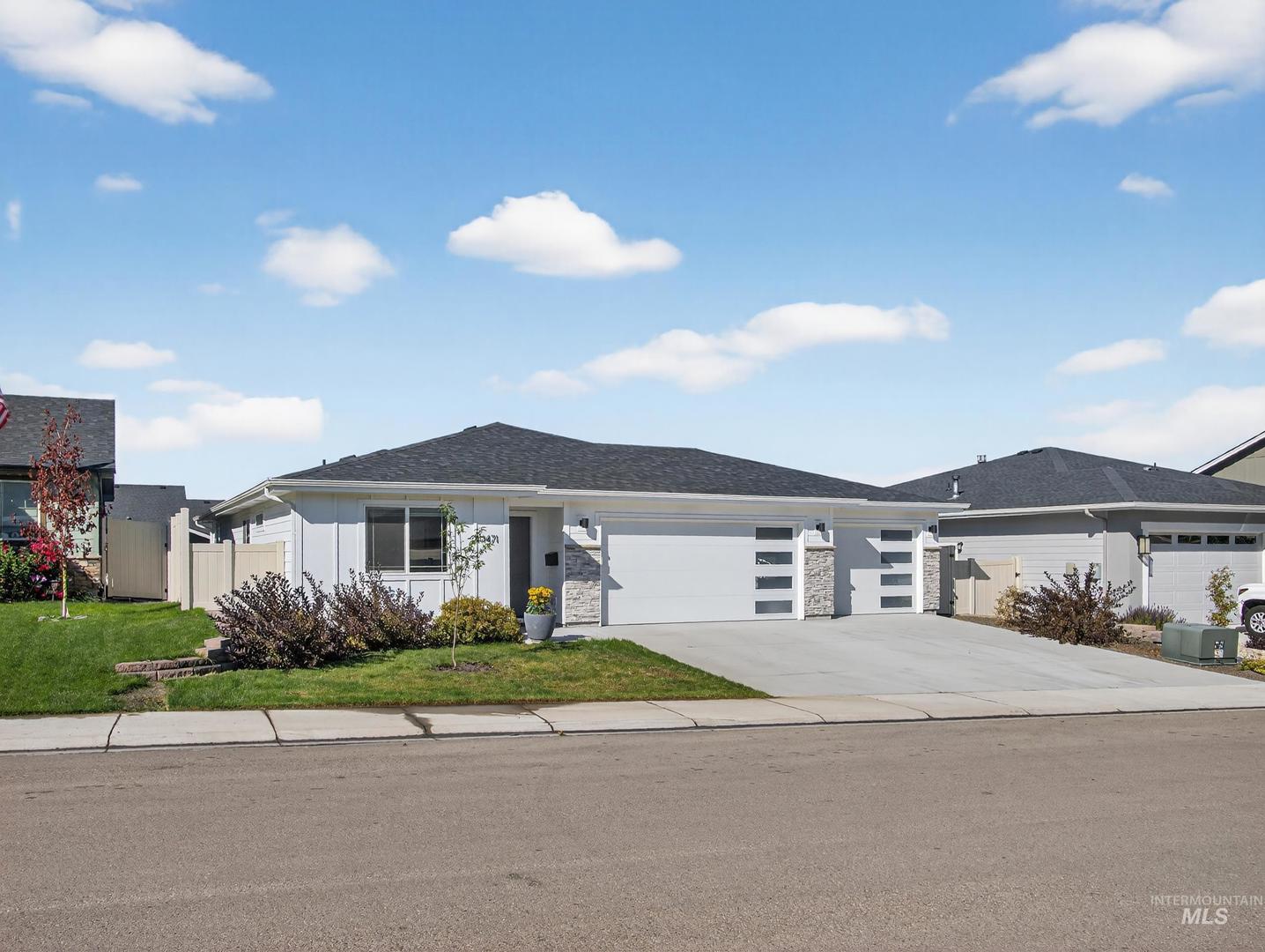 Experience modern comfort and style in this beautifully maintained single-level home in the highly sought-after Highland Subdivision. Featuring 3 bedrooms, 2 bathrooms, and an open-concept design with vaulted ceilings and large windows that fill the home with natural light. The kitchen is a showstopper, showcasing custom cabinetry with ample storage, quartz countertops, a full-tile backsplash, stainless steel appliances and a spacious island—perfect for entertaining. The private primary suite offers a relaxing retreat with a walk-in shower with glass doors, dual vanity, and a large walk-in closet. Additional upgrades include luxury plank flooring, over $6,000 in custom Norman window treatments (including plantation shutters), a reverse osmosis system, and a cozy gas fireplace. Step outside to enjoy the extended 12-foot patio, overlooking beautifully maintained raised garden beds—ideal for outdoor living. The 3-car garage includes a dedicated freezer outlet, Christmas light outlet on the patio, and top-of-the-line LG washer and dryer. The yard is fully fenced and landscaped, with pressurized irrigation and full sprinklers. Residents of the Highland community enjoy resort-style amenities—including a heated pool, pickleball and basketball courts, fiber-optic internet, and scenic walking trails.