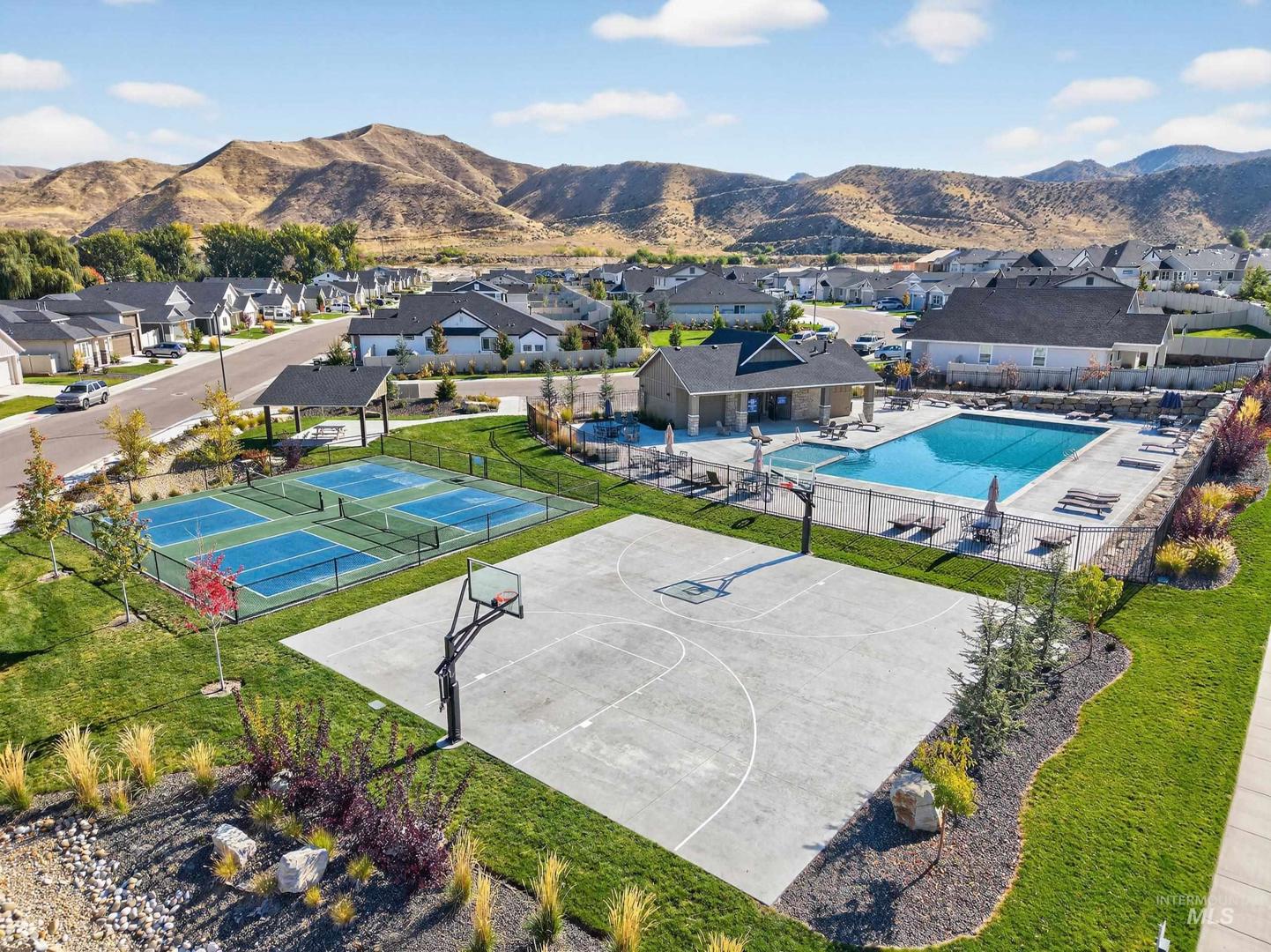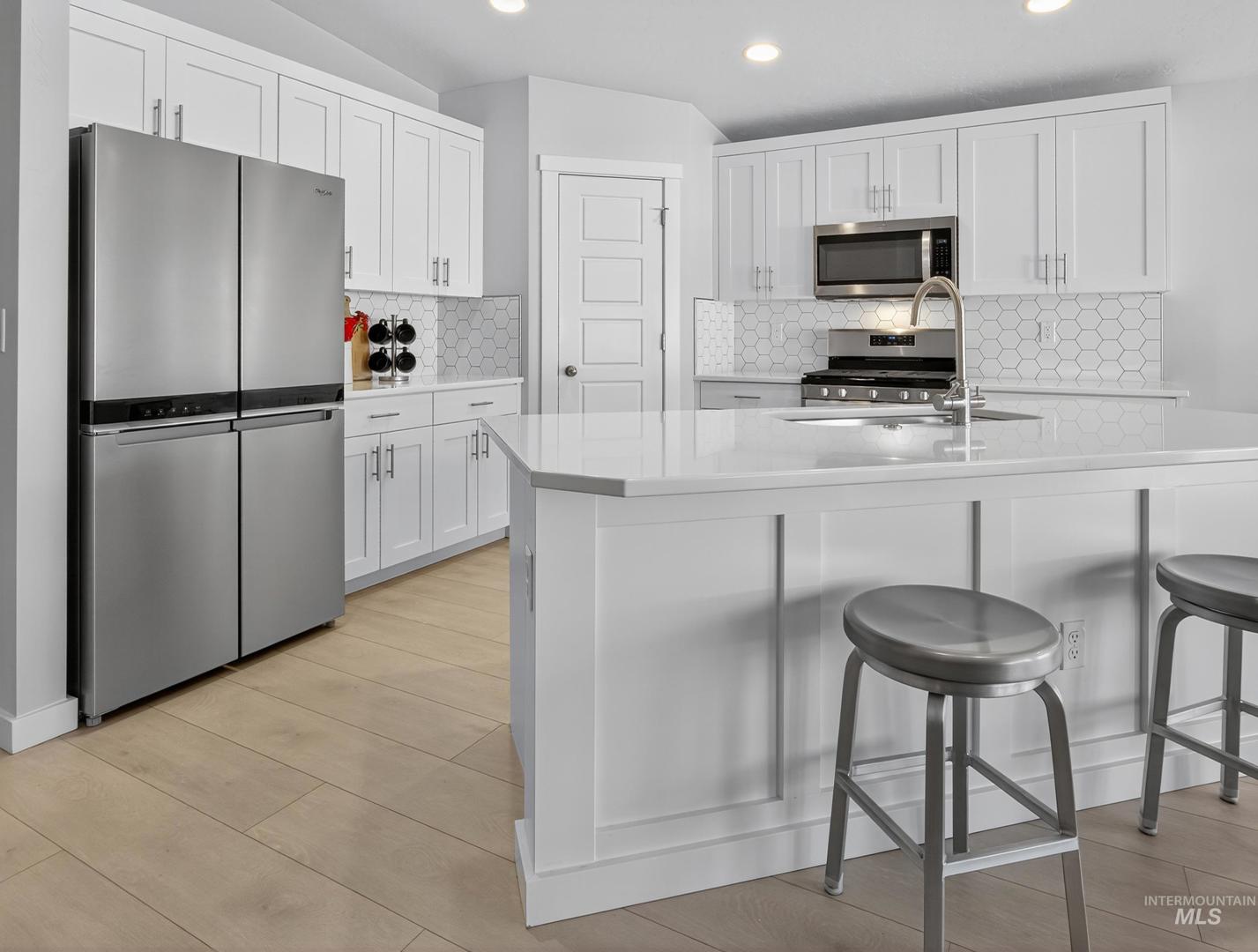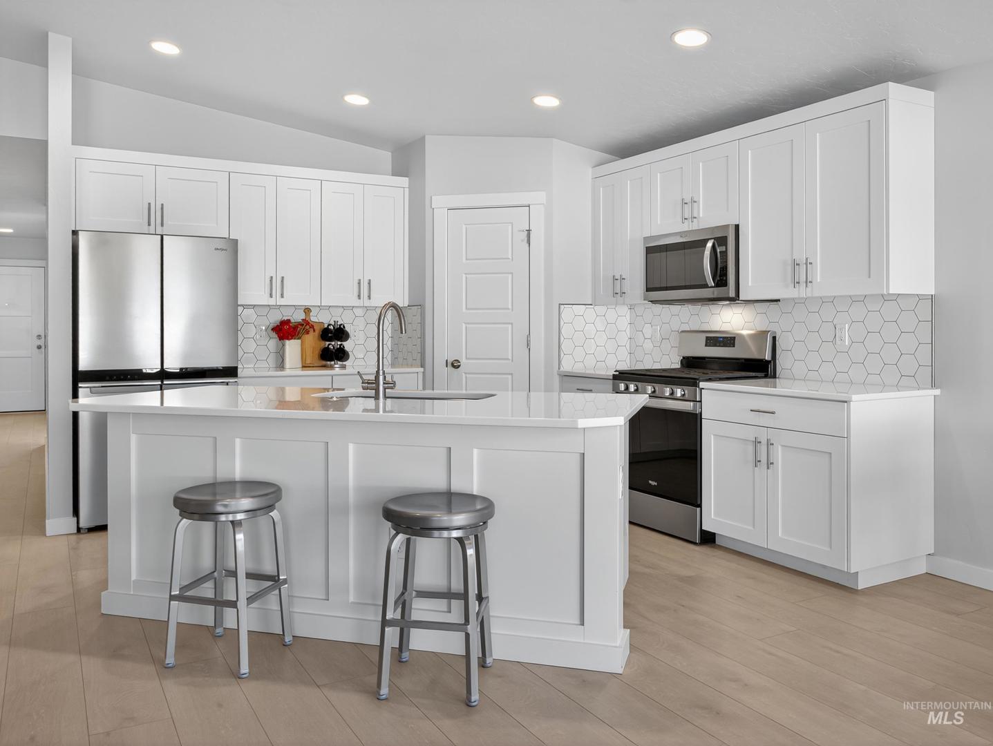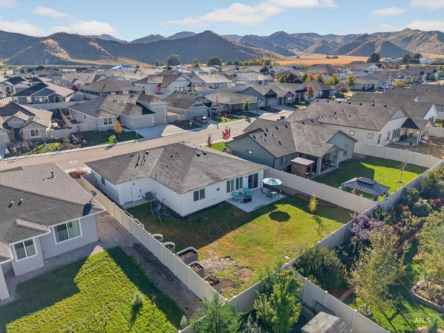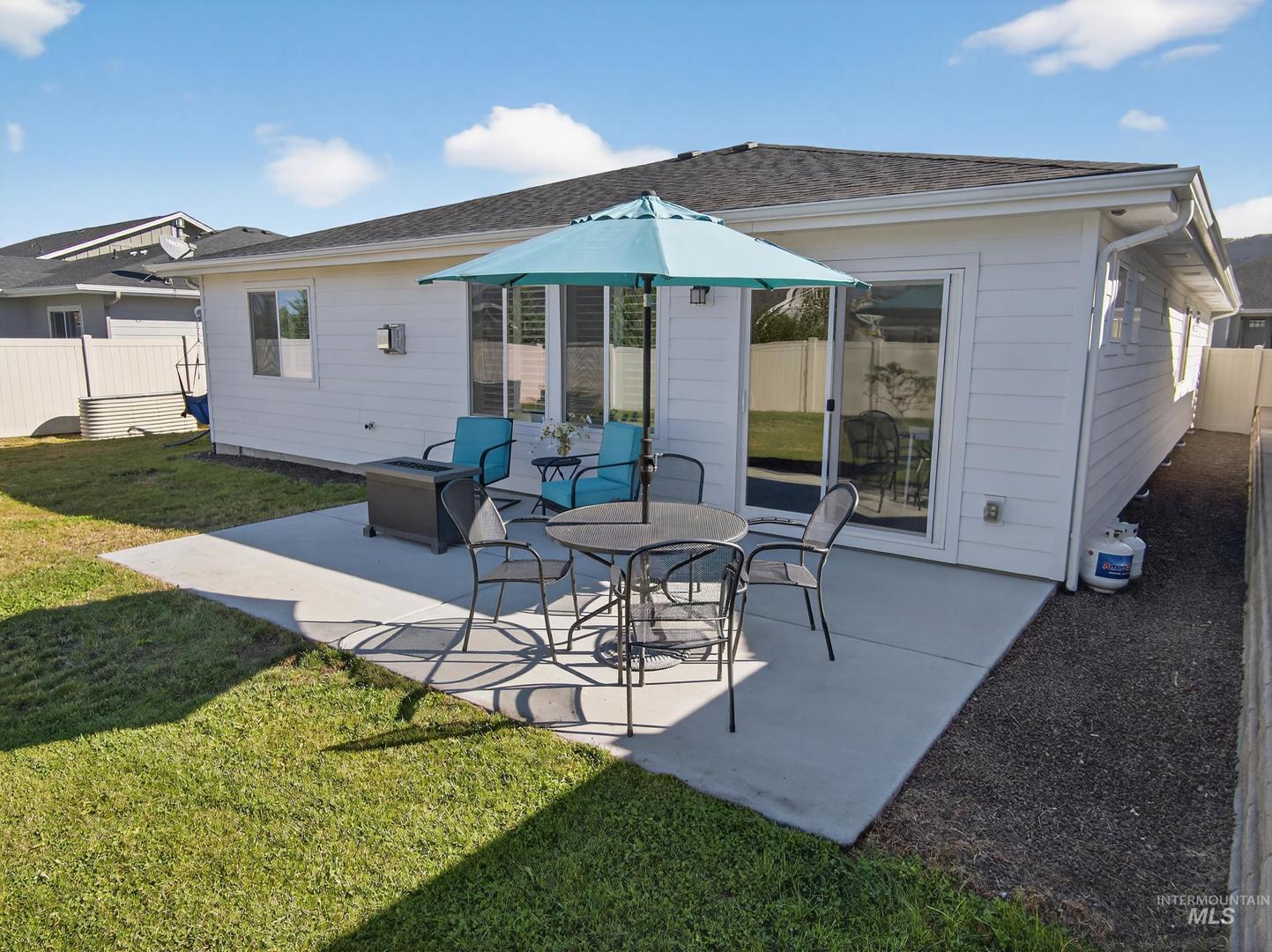 Experience modern comfort and style in this beautifully maintained single-level home in the highly sought-after Highland Subdivision. Featuring 3 bedrooms, 2 bathrooms, and an open-concept design with vaulted ceilings and large windows that fill the home with natural light. The kitchen is a showstopper, showcasing custom cabinetry with ample storage, quartz countertops, a full-tile backsplash, stainless steel appliances and a spacious island—perfect for entertaining. The private primary suite offers a relaxing retreat with a walk-in shower with glass doors, dual vanity, and a large walk-in closet. Additional upgrades include luxury plank flooring, over $6,000 in custom Norman window treatments (including plantation shutters), a reverse osmosis system, and a cozy gas fireplace. Step outside to enjoy the extended 12-foot patio, overlooking beautifully maintained raised garden beds—ideal for outdoor living. The 3-car garage includes a dedicated freezer outlet, Christmas light outlet on the patio, and top-of-the-line LG washer and dryer. The yard is fully fenced and landscaped, with pressurized irrigation and full sprinklers. Residents of the Highland community enjoy resort-style amenities—including a heated pool, pickleball and basketball courts, fiber-optic internet, and scenic walking trails.