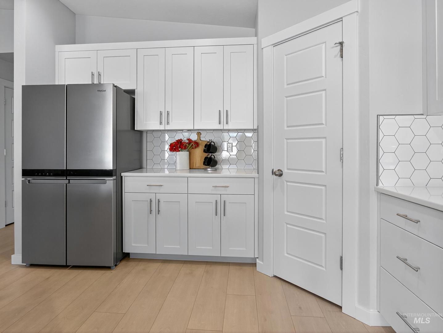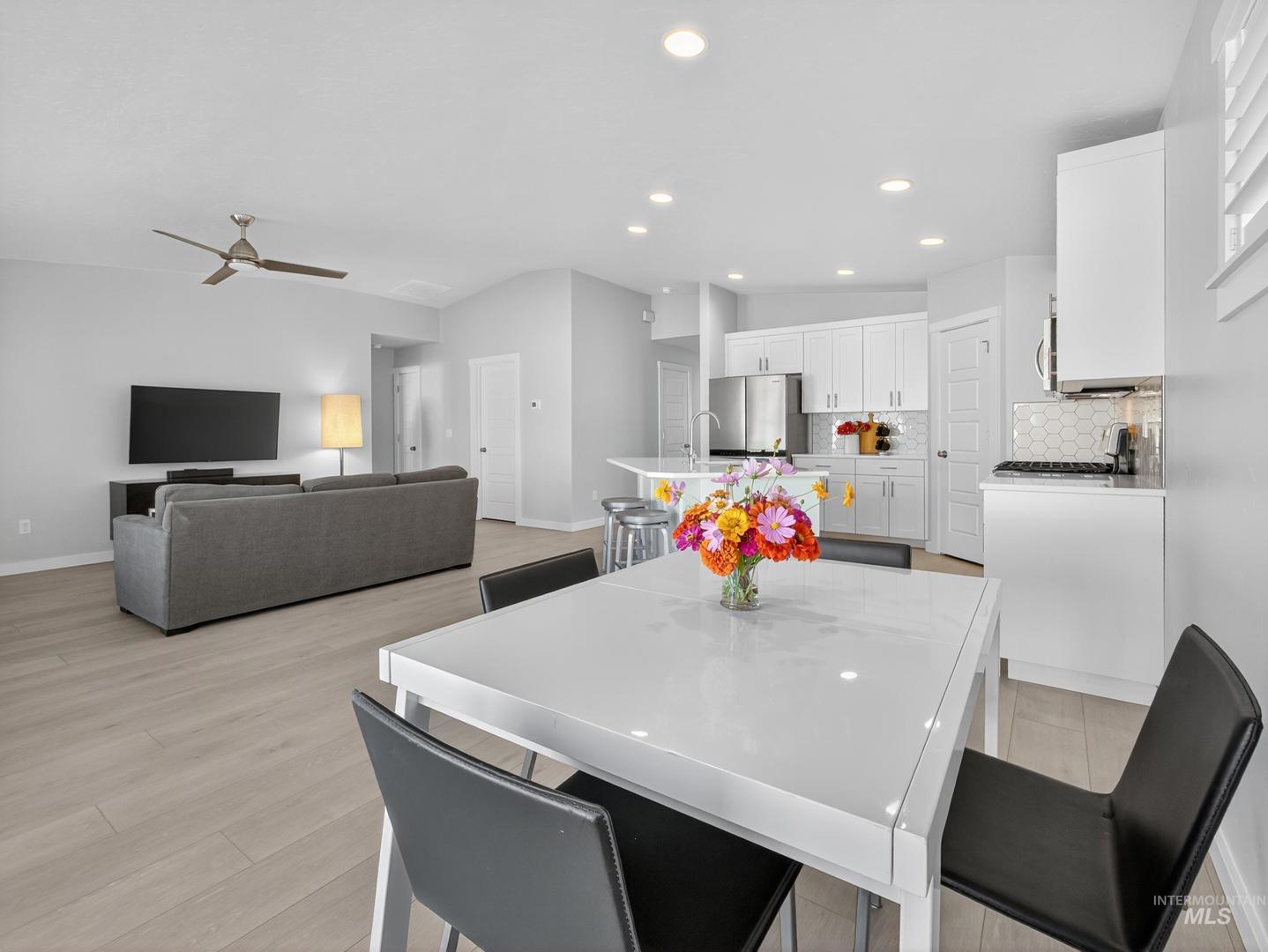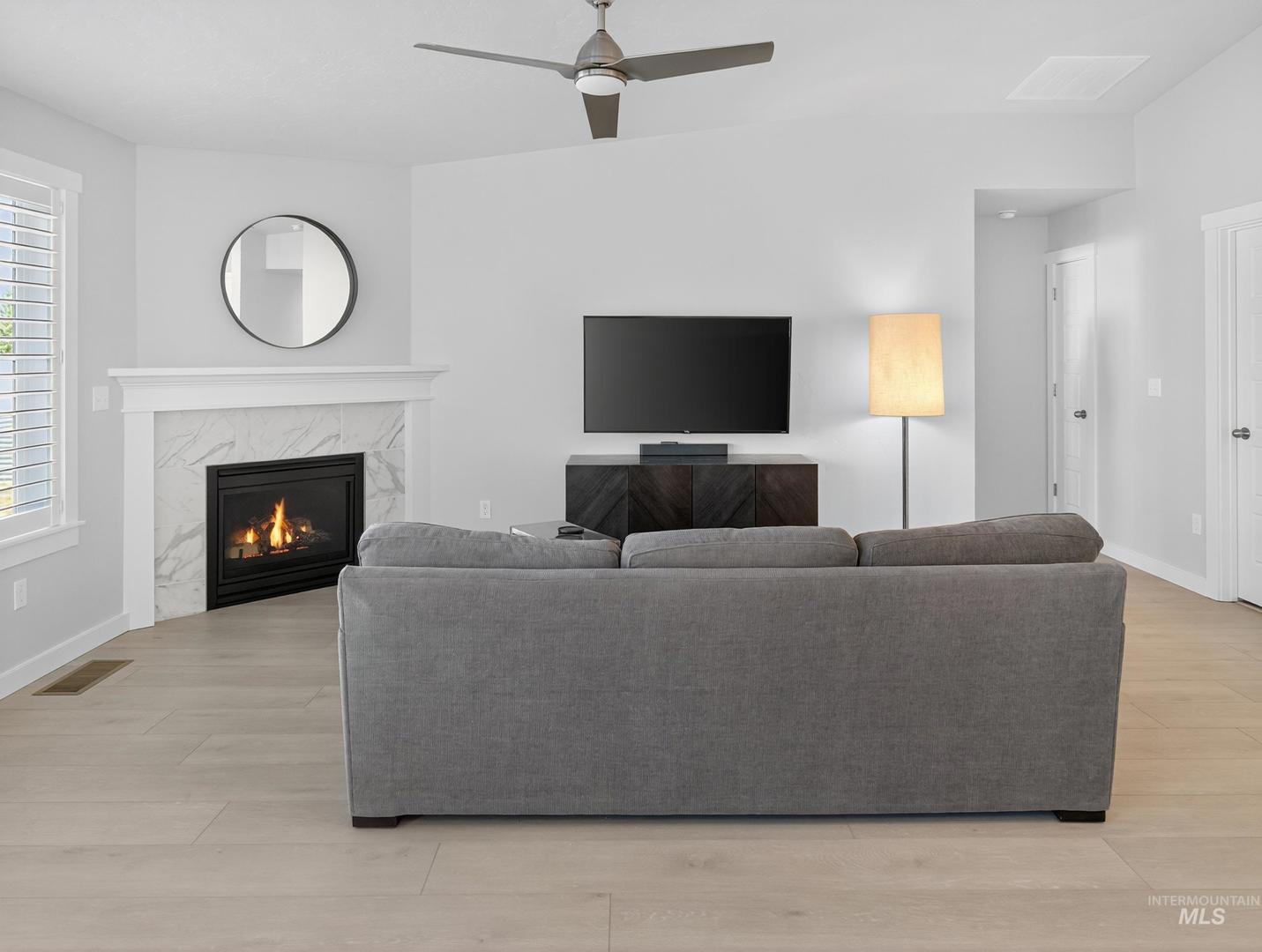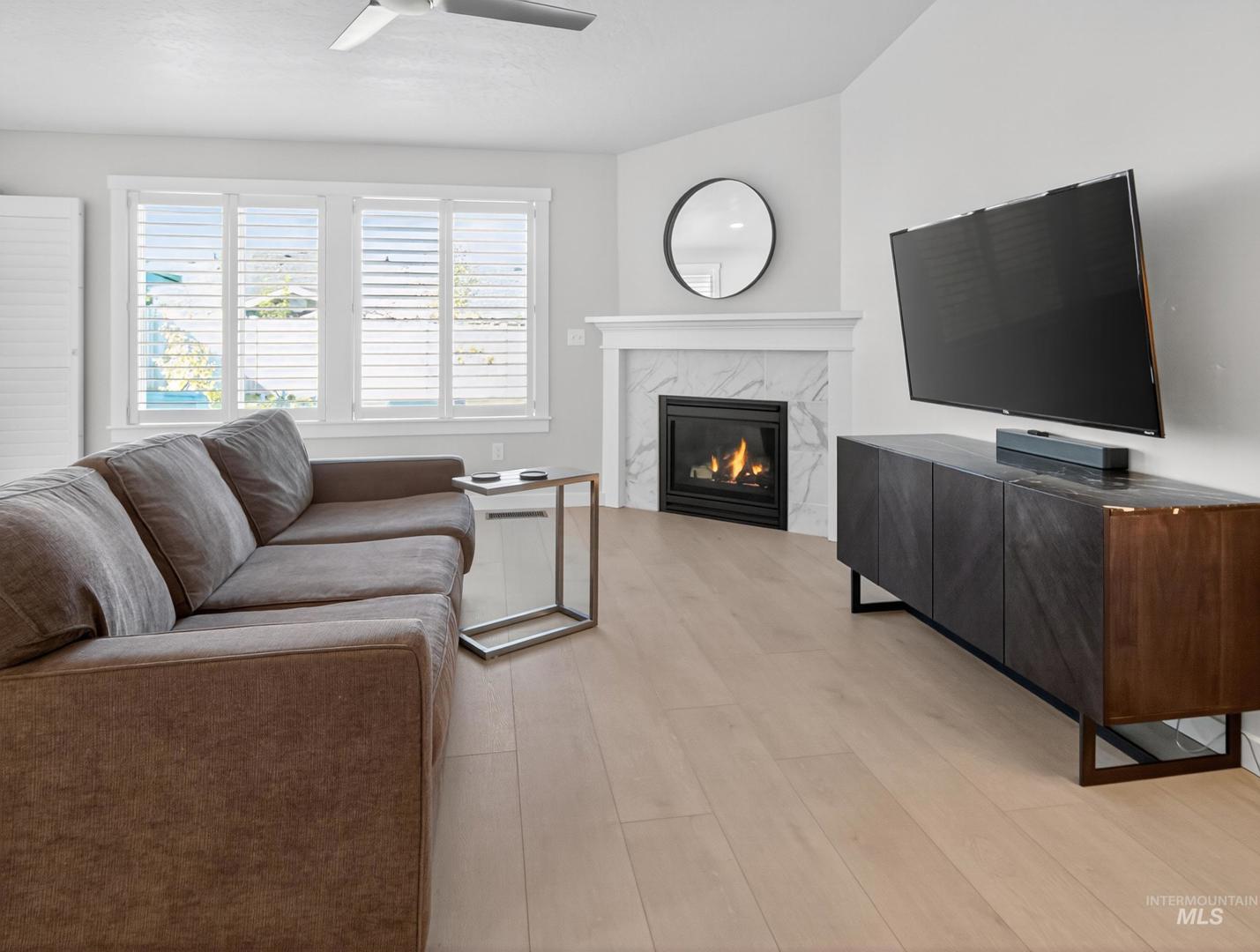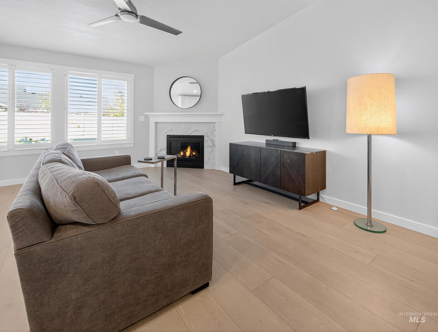 Experience modern comfort and style in this beautifully maintained single-level home in the highly sought-after Highland Subdivision. Featuring 3 bedrooms, 2 bathrooms, and an open-concept design with vaulted ceilings and large windows that fill the home with natural light. The kitchen is a showstopper, showcasing custom cabinetry with ample storage, quartz countertops, a full-tile backsplash, stainless steel appliances and a spacious island—perfect for entertaining. The private primary suite offers a relaxing retreat with a walk-in shower with glass doors, dual vanity, and a large walk-in closet. Additional upgrades include luxury plank flooring, over $6,000 in custom Norman window treatments (including plantation shutters), a reverse osmosis system, and a cozy gas fireplace. Step outside to enjoy the extended 12-foot patio, overlooking beautifully maintained raised garden beds—ideal for outdoor living. The 3-car garage includes a dedicated freezer outlet, Christmas light outlet on the patio, and top-of-the-line LG washer and dryer. The yard is fully fenced and landscaped, with pressurized irrigation and full sprinklers. Residents of the Highland community enjoy resort-style amenities—including a heated pool, pickleball and basketball courts, fiber-optic internet, and scenic walking trails.