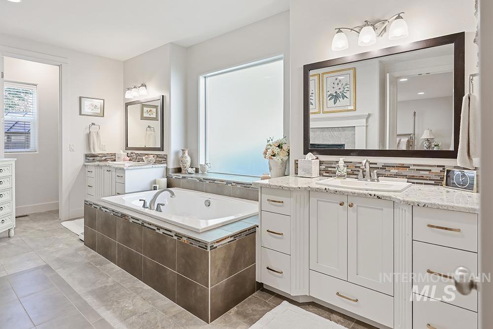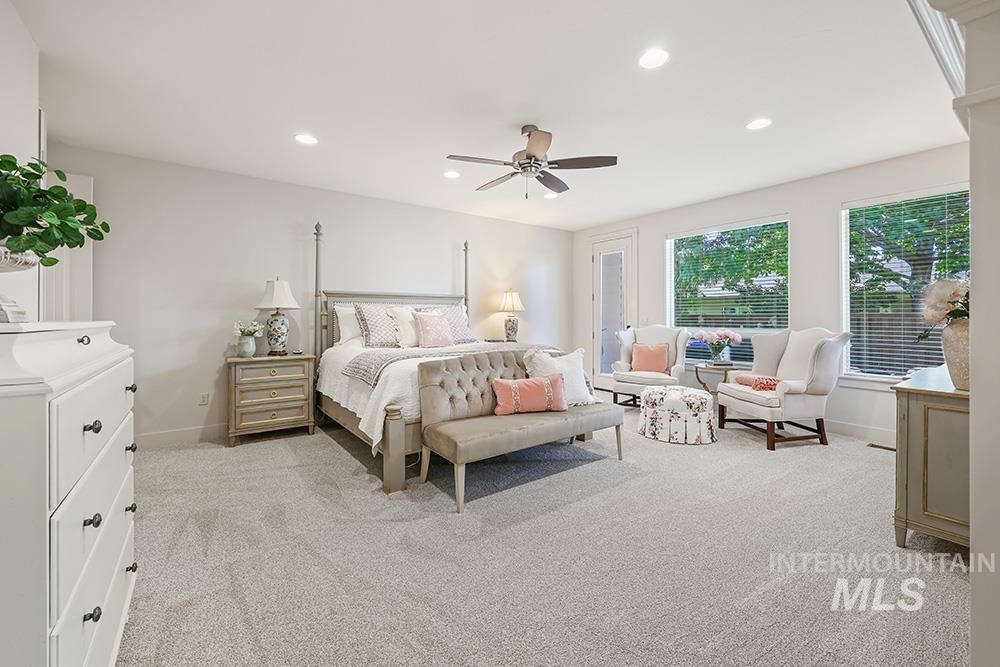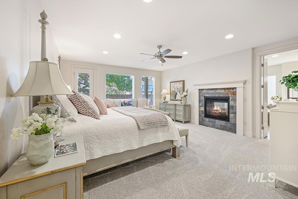 A refined Boise Hunter Home in Saguaro Canyon, one of NE Meridian’s most desirable communities, where lifestyle, convenience, & comfort converge. This sought-after neighborhood offers miles of paved paths, parks, playgrounds, and a pool, just minutes from Eagle Island State Park, shopping, dining, and the prestigious Ambrose School. Showcasing quality craftsmanship, the home has been elevated by $100k+ in upgrades, most notably an extraordinary landscaping transformation creating a private backyard oasis for gardening, entertaining & relaxation. Raised garden beds, greenhouse, new curbing, fencing, automated watering, hanging baskets, & expanded patios (one with automatic sunshade) provide year-round enjoyment. Inside, fresh paint, new luxury carpet, & updated lighting make the home feel polished and new. A rounded foyer with marble tile & gold chandelier sets the tone, while French doors open to a sitting room or potential bedroom. Hardwood floors flow into the great room with tall ceilings & fireplace, open to the kitchen with granite countertops, Shaker cabinetry, walk-in pantry, double ovens, gas range, and central island. The main-level primary features a dual-sided fireplace shared with its spa-like bath, while upstairs a large bonus, 3 bedrooms & bath create private quarters. Every detail is thoughtfully designed, blending luxury living with vibrant community amenities.