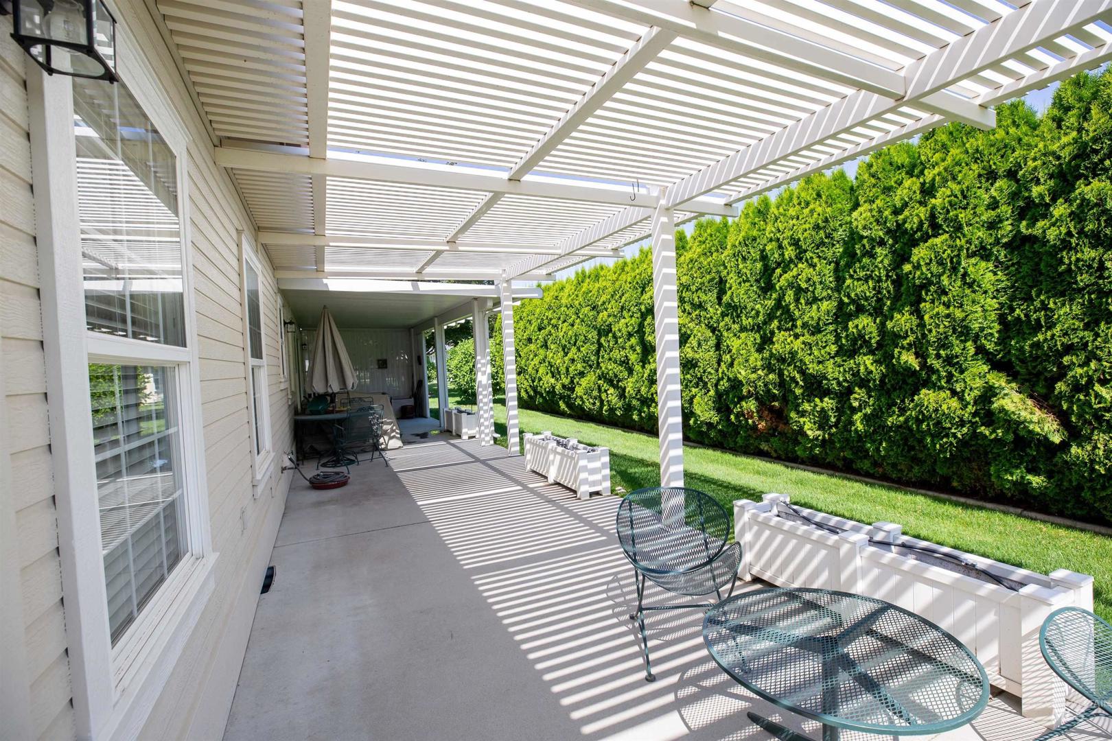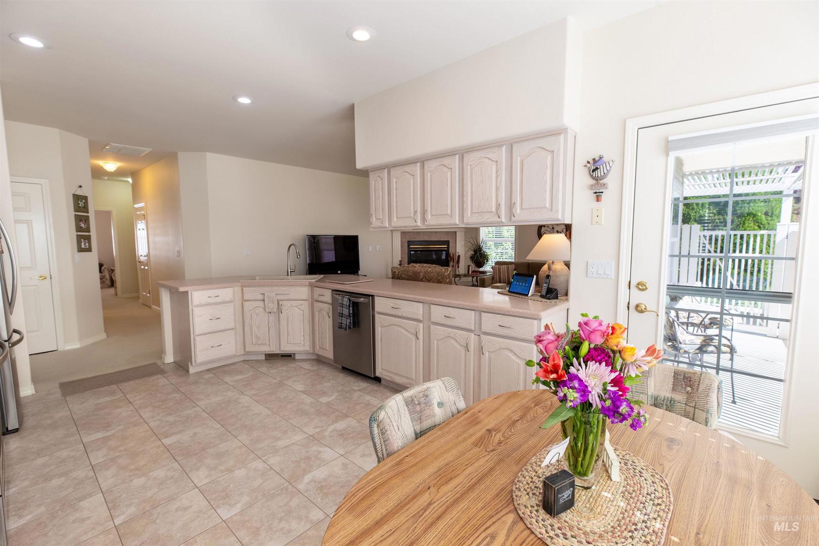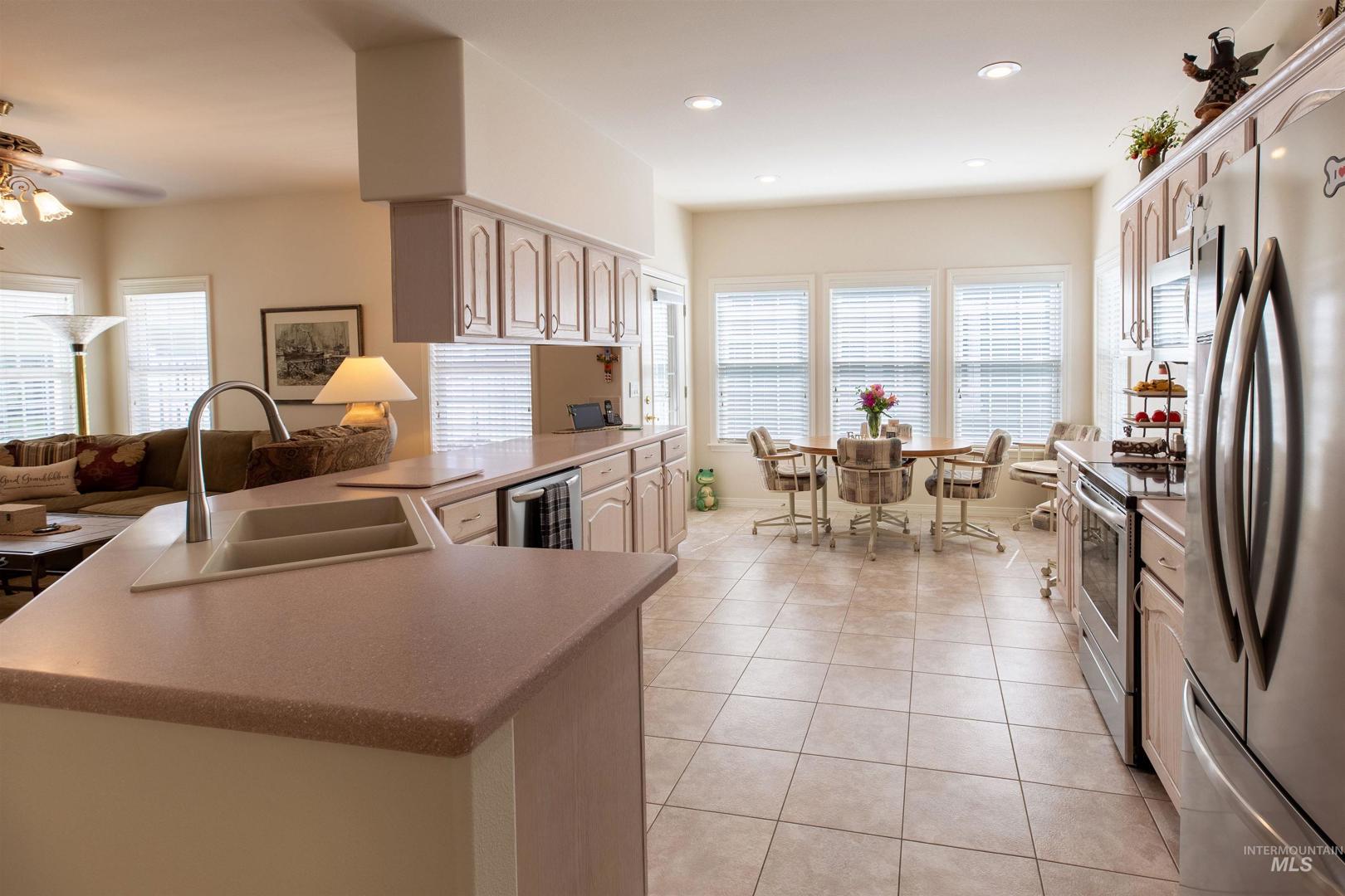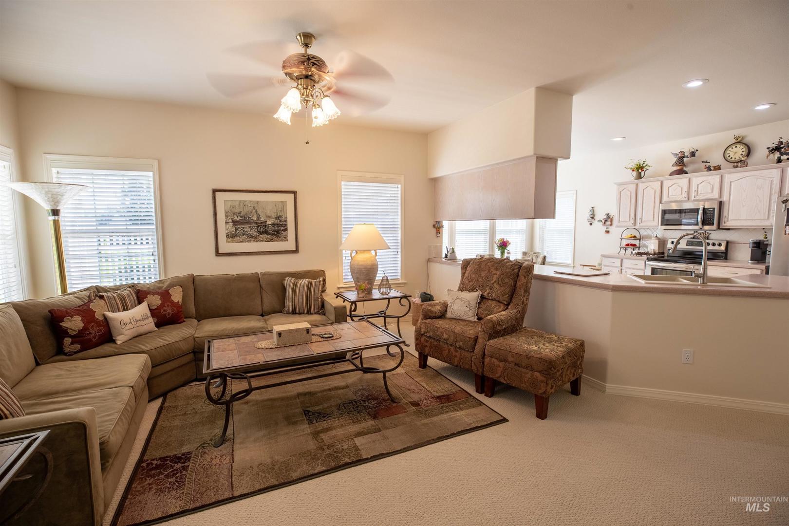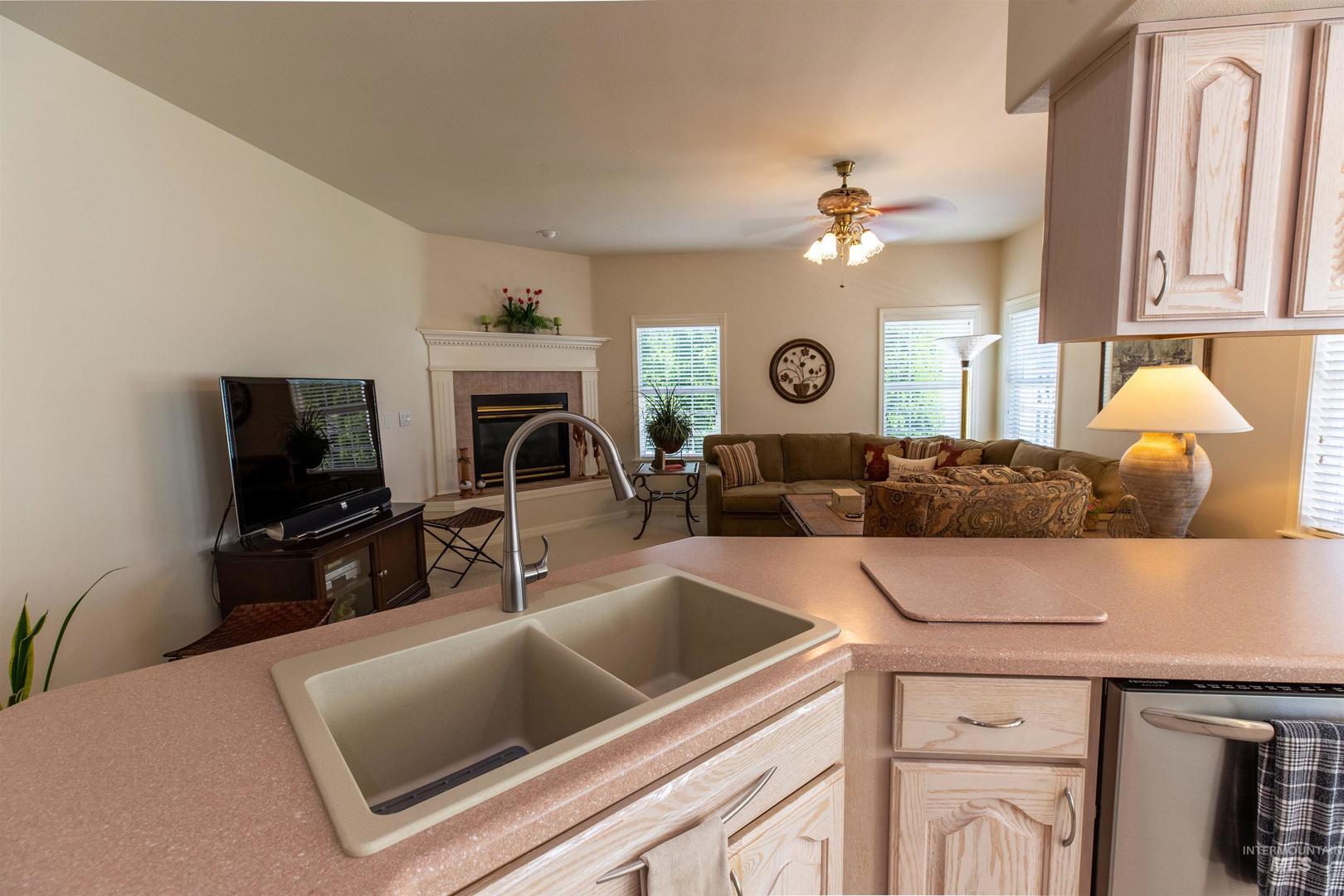 IMPECCABLY maintained & super clean! You`ll feel the differnce: light, bright, clean & refreshing! Coveted 55 & Up, gated neighborhood w/beautiful golf course, club house and community swimming pool just down the street. This 2 bed, 2 bath home lives LARGE! First the HUGE kitchen with corian countertops, newer appliances, tons of cabinetry, breakfast nook & pantry. Primary bedroom adorned w/large walk-in closet, tiled with dual vanity & easy step-in shower. Convenient access to a private patio. Large family & living rooms w/most furniture included if you`d like! Family Rm opens to covered, private patio w/4 raised planters w/sprinklers. Other amenities include 2nd bathrm w/tile, ceiling fans, 2" vinyl blinds & cozy fireplace. Newer HVAC w/service contract, all plumbing pipes replaced 2022, Roof replaced appx 2015. Finished garage w/pull down storage, water softener & did we mention, yard maintenance is included for easy, care-free living?! Pride of ownership for the entire neighborhood-Peaceful & Beautiful!