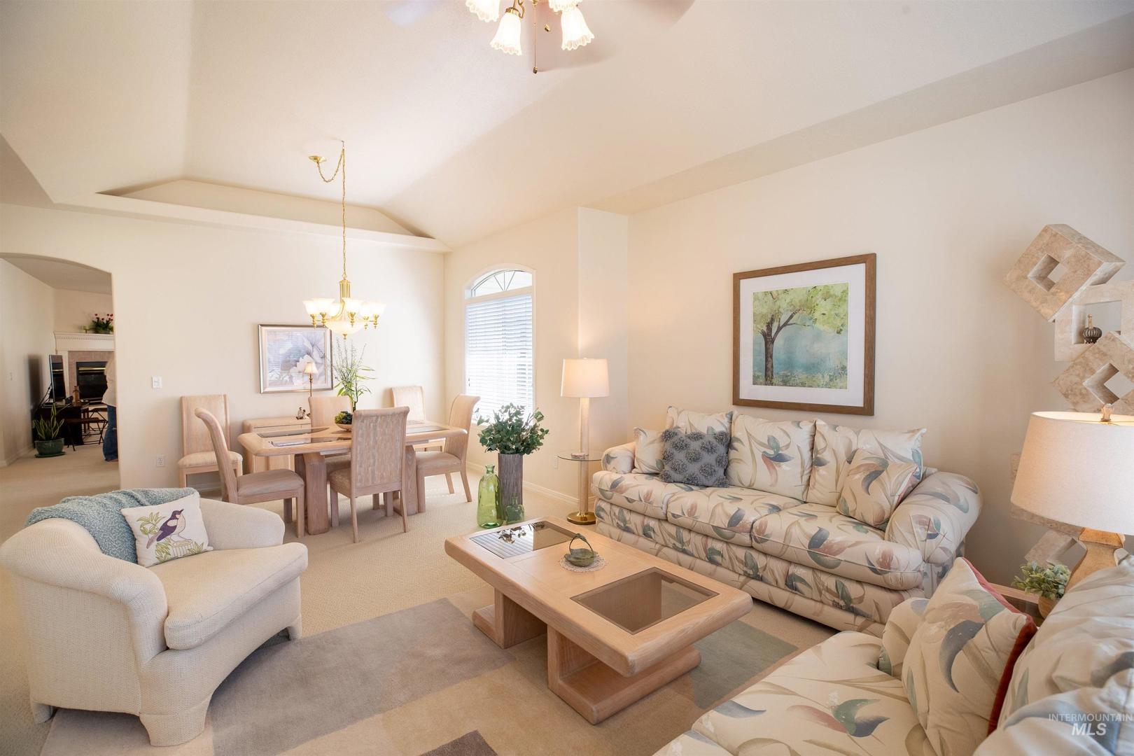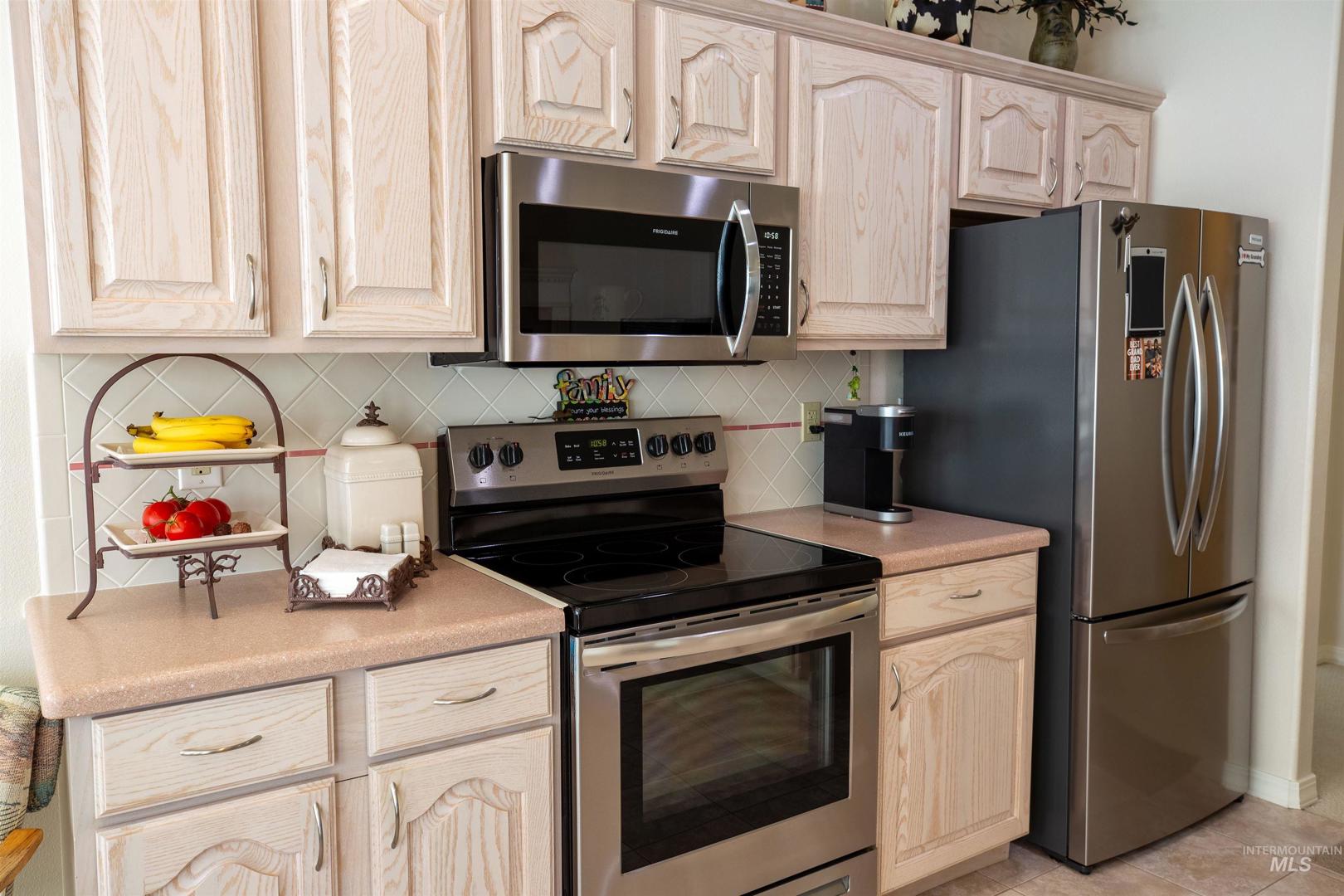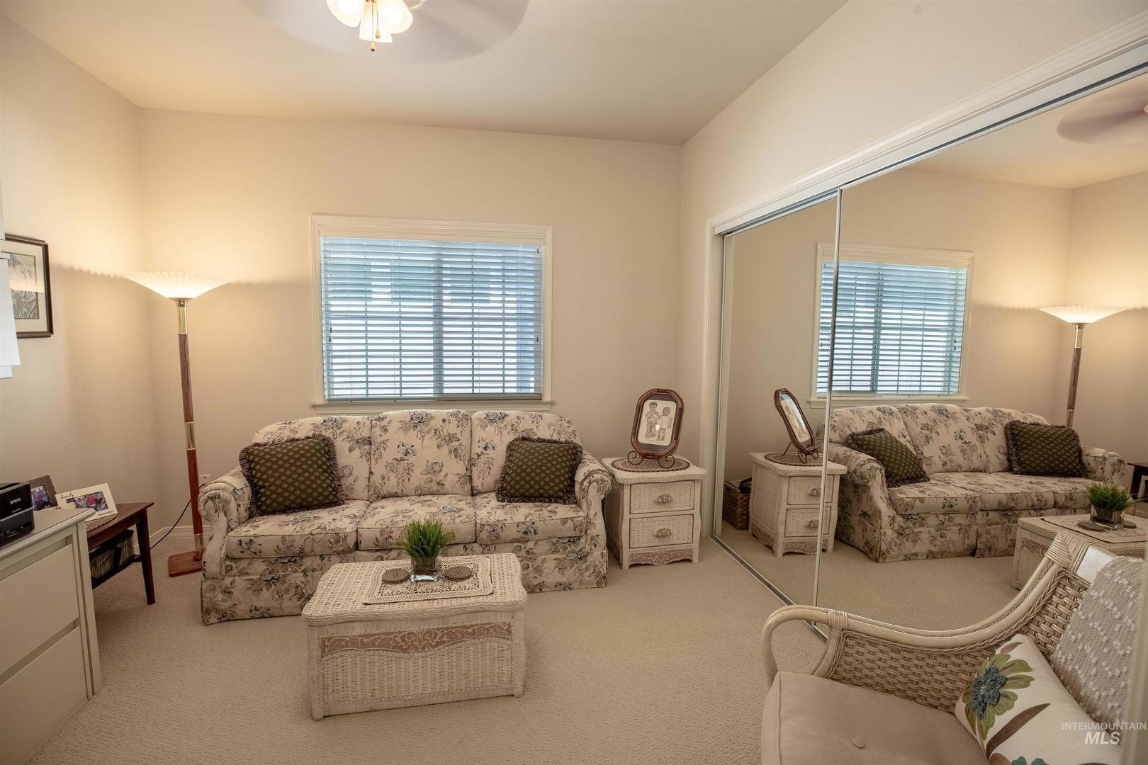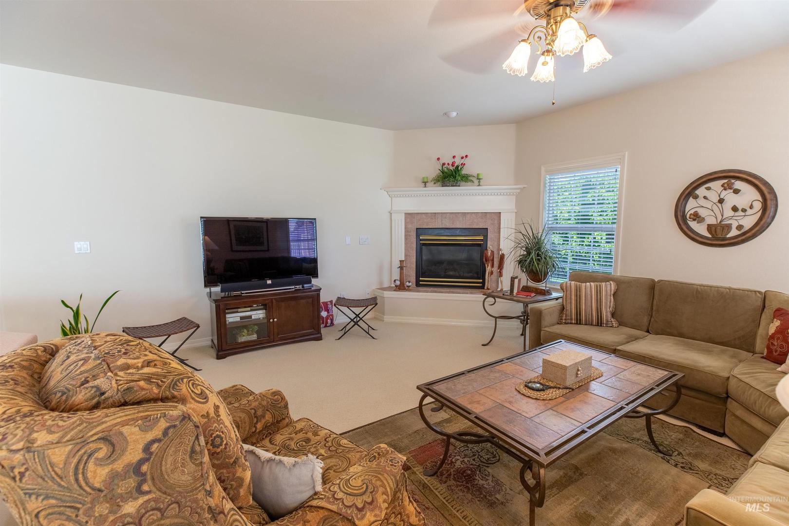 IMPECCABLY maintained & super clean! You`ll feel the differnce: light, bright, clean & refreshing! Coveted 55 & Up, gated neighborhood w/beautiful golf course, club house and community swimming pool just down the street. This 2 bed, 2 bath home lives LARGE! First the HUGE kitchen with corian countertops, newer appliances, tons of cabinetry, breakfast nook & pantry. Primary bedroom adorned w/large walk-in closet, tiled with dual vanity & easy step-in shower. Convenient access to a private patio. Large family & living rooms w/most furniture included if you`d like! Family Rm opens to covered, private patio w/4 raised planters w/sprinklers. Other amenities include 2nd bathrm w/tile, ceiling fans, 2" vinyl blinds & cozy fireplace. Newer HVAC w/service contract, all plumbing pipes replaced 2022, Roof replaced appx 2015. Finished garage w/pull down storage, water softener & did we mention, yard maintenance is included for easy, care-free living?! Pride of ownership for the entire neighborhood-Peaceful & Beautiful!