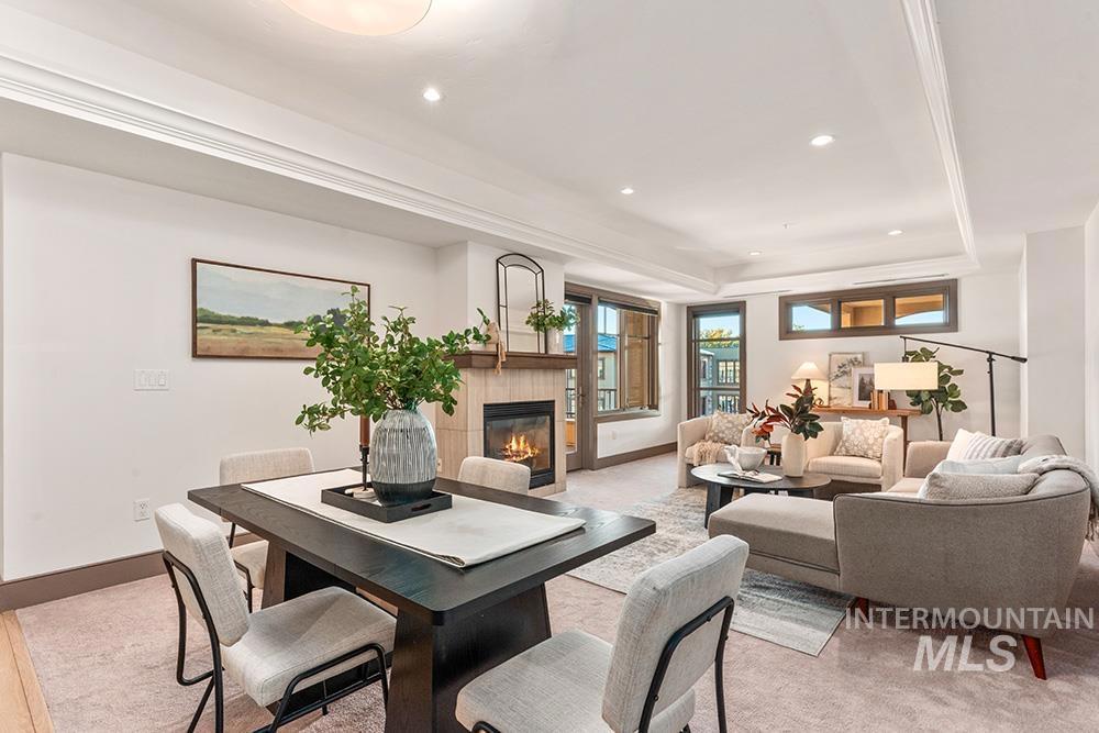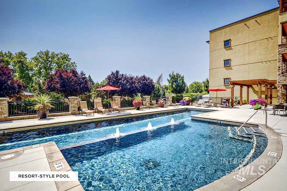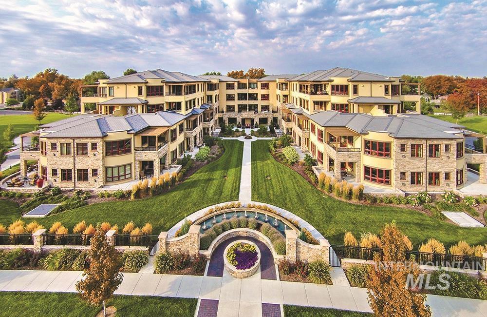 Set just above the city lights with a front-row seat to Boise’s skyline & the mountains beyond, this luxury condominium captures the essence of refined living. Perched on premier Crescent Rim, the residence offers fine finishes, effortless sophistication & a resort-style setting. Two reserved parking spaces in the enclosed garage provide convenient elevator access to the single-level condominium. Inside, a sense of calm & craftsmanship unfolds. Hardwood floors & freshly painted walls extend from entry into great room. Rich wood cabinetry, modern granite countertops, high-end, beautifully finished cabinet-front appliances & a Wolf gas range anchor the chef’s kitchen – an elegant space designed for both everyday comfort & elevated entertaining. The open living & dining areas feature tray ceilings with soft accent lighting, gas fireplace & doors that open to a covered balcony where the sounds of a water feature mingle with sweeping views of the foothills & downtown. The primary suite offers private access to the balcony, a spa-style en-suite bath with dual vanities, soaking tub & a frameless rain shower. A secondary bedroom & full bath offer flexibility for guests. A convenient office niche is located off of the entry. Residents enjoy an array of resort-style amenities, including an impressive pool, hot tub, club room, fitness center & reservable guest suites for visitors.