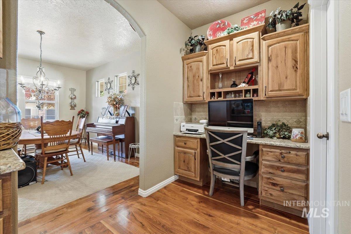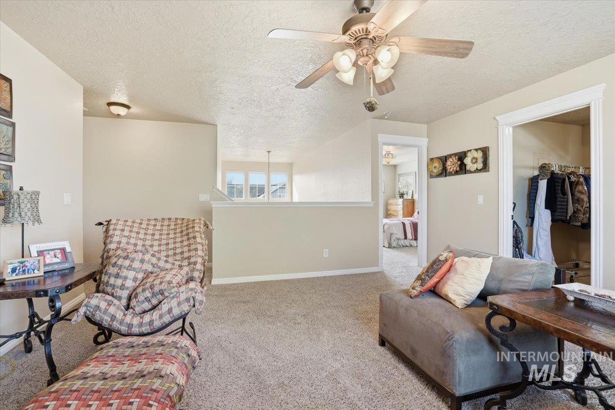 This stunning custom-built home that blends elegance, comfort, and versatility. Featuring two spacious master suites, this residence is perfect for multi-generational living or luxurious guest accommodations. The gourmet kitchen boasts granite countertops, a large island, and custom cabinetry that elevates everyday cooking and entertaining. Upstairs, a cozy loft with its own fireplace offers a warm retreat, while the master suite includes a fantastic flex space ideal for crafts, a home office, a quiet sick room, or a private sanctuary. With an upstairs laundry room for added convenience and a location close to The Village at Meridian and Settlers Park this home delivers exceptional living in a well established neighborhood of custom homes.