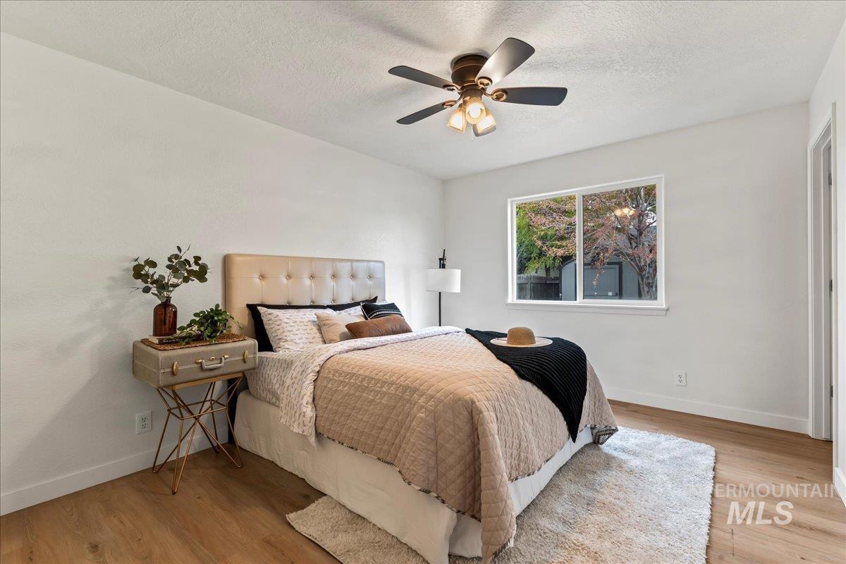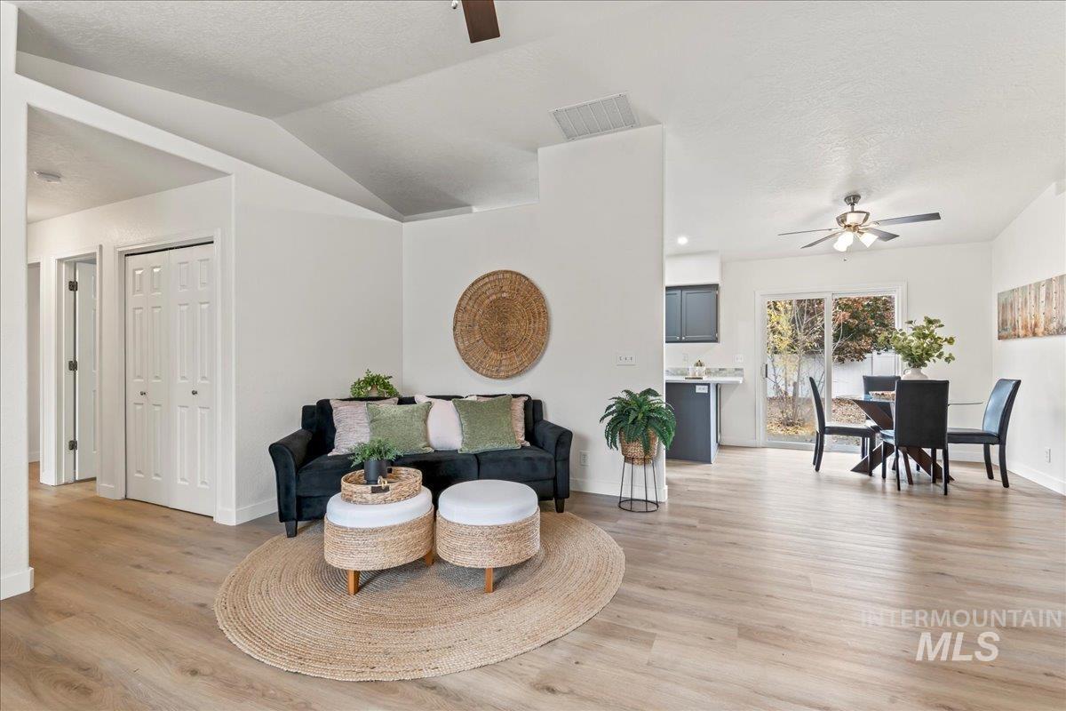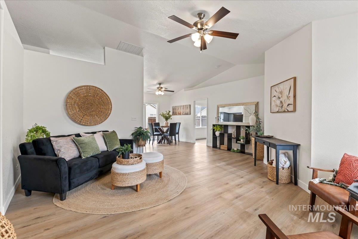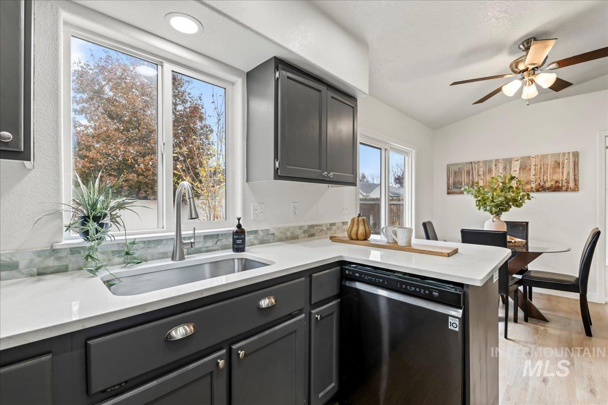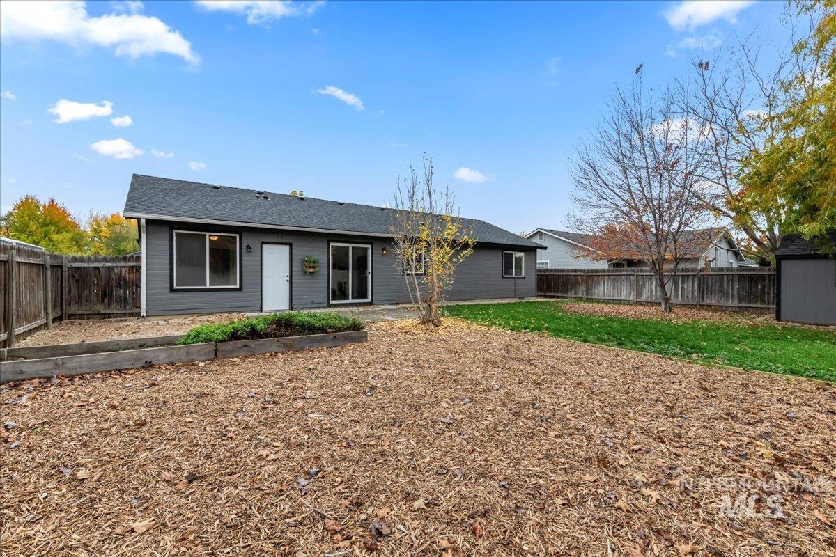Located in a desirable Meridian neighborhood just 2 miles from The Village and minutes to I-84, this beautifully updated single-level home offers 4 bedrooms, 2 baths, and a bright open layout. Every detail has been refreshed with luxury vinyl plank flooring, fresh interior paint, and quartz countertops that bring a modern, clean feel throughout. The great room features vaulted ceilings and abundant natural light, connecting seamlessly to a spacious kitchen with island, breakfast bar, pantry, and stainless-steel appliances—all included. The primary suite offers a walk-in closet and private bath with walk-in shower and quartz surfaces. Three additional bedrooms and a full guest bath provide plenty of room for family and friends. The fully fenced backyard includes auto sprinklers, pressurized irrigation, and mature landscaping. Attached two-car garage with a backyard storage shed for tools, bikes, or garden equipment. Convenient location with easy access to Eagle Road, Ten Mile, downtown Meridian, and nearby parks. Short commute to Boise or Nampa, with shopping, restaurants, and entertainment close by. This home combines comfort, quality updates, new roof within the last five years, and convenience in one ideal Meridian setting.