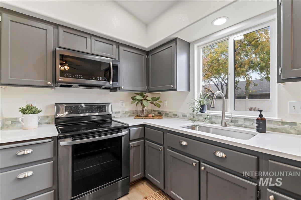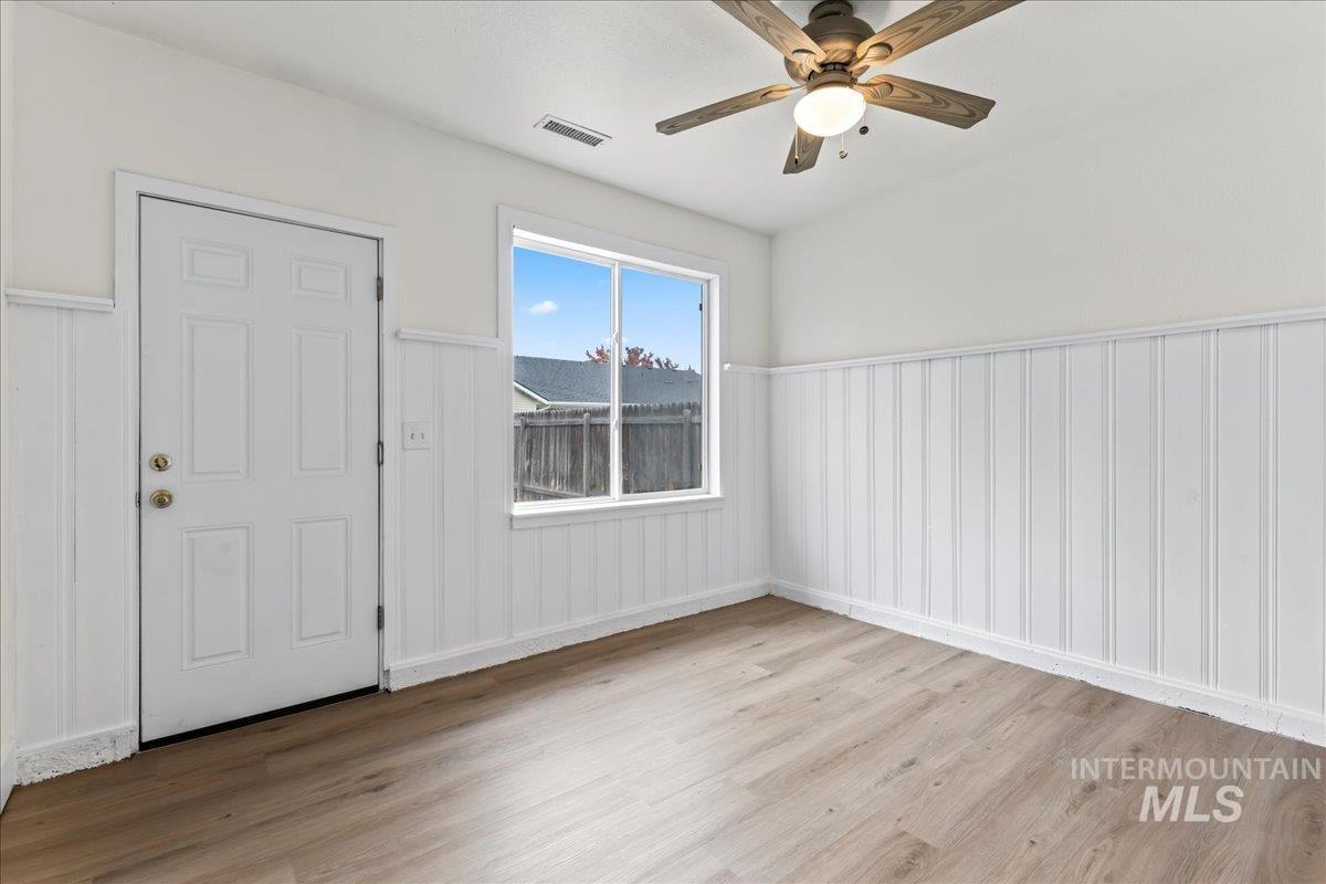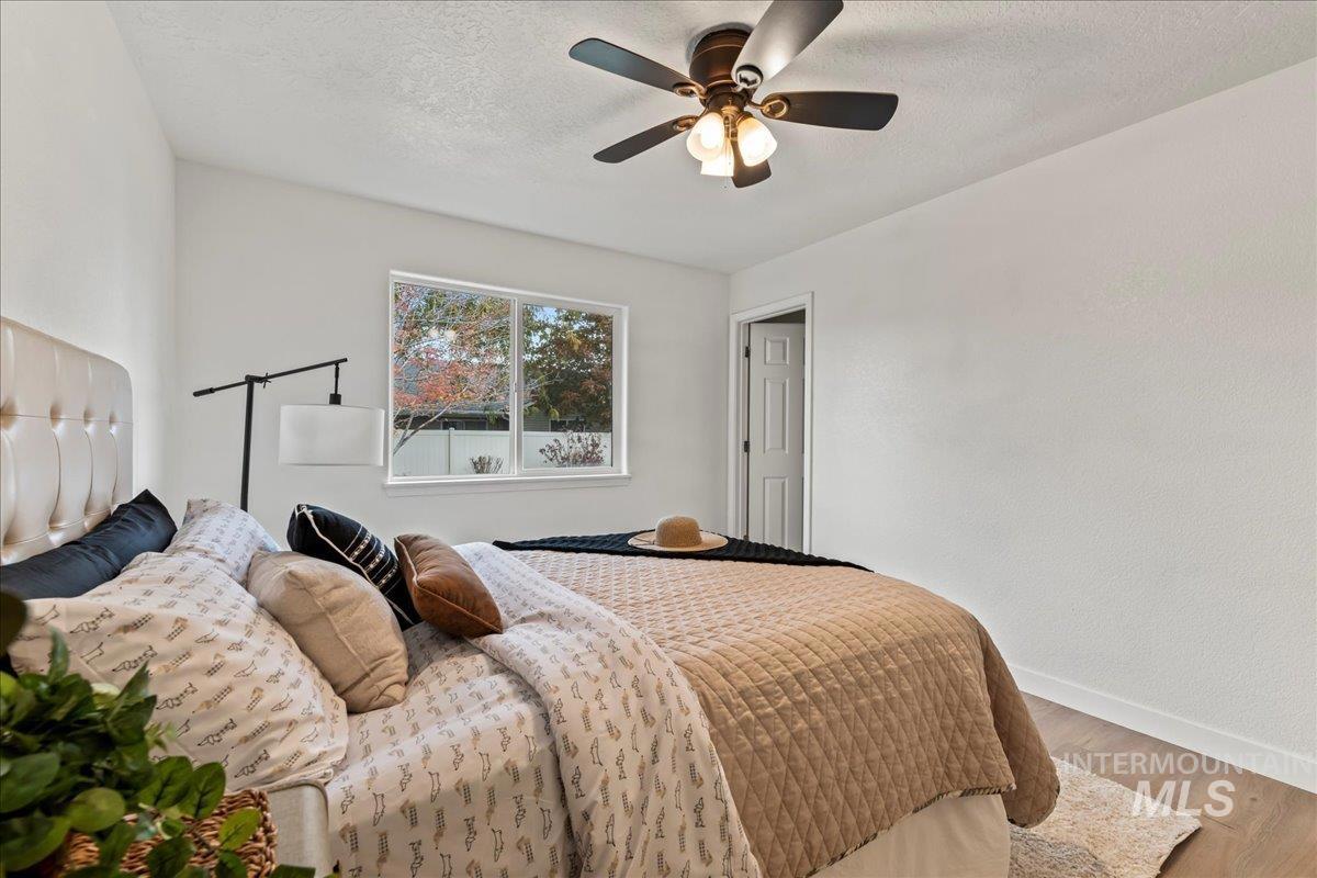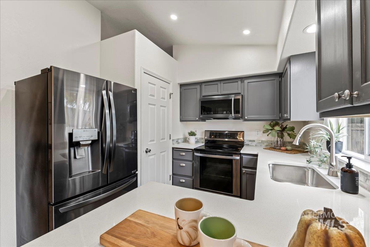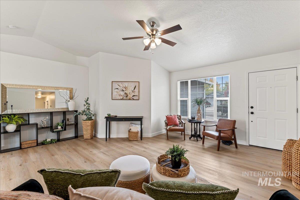 Located in a desirable Meridian neighborhood just 2 miles from The Village and minutes to I-84, this beautifully updated single-level home offers 4 bedrooms, 2 baths, and a bright open layout. Every detail has been refreshed with luxury vinyl plank flooring, fresh interior paint, and quartz countertops that bring a modern, clean feel throughout. The great room features vaulted ceilings and abundant natural light, connecting seamlessly to a spacious kitchen with island, breakfast bar, pantry, and stainless-steel appliances—all included. The primary suite offers a walk-in closet and private bath with walk-in shower and quartz surfaces. Three additional bedrooms and a full guest bath provide plenty of room for family and friends. The fully fenced backyard includes auto sprinklers, pressurized irrigation, and mature landscaping. Attached two-car garage with a backyard storage shed for tools, bikes, or garden equipment. Convenient location with easy access to Eagle Road, Ten Mile, downtown Meridian, and nearby parks. Short commute to Boise or Nampa, with shopping, restaurants, and entertainment close by. This home combines comfort, quality updates, new roof within the last five years, and convenience in one ideal Meridian setting.