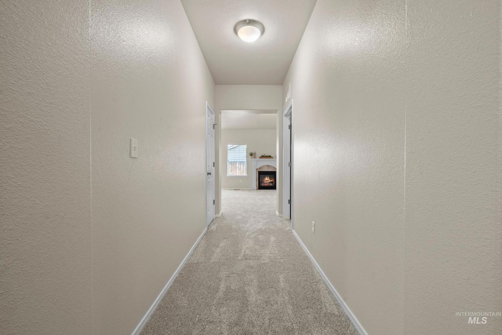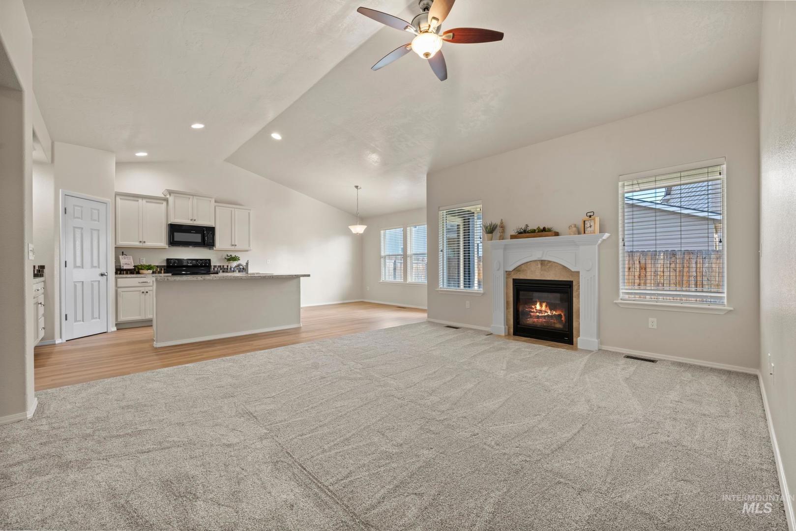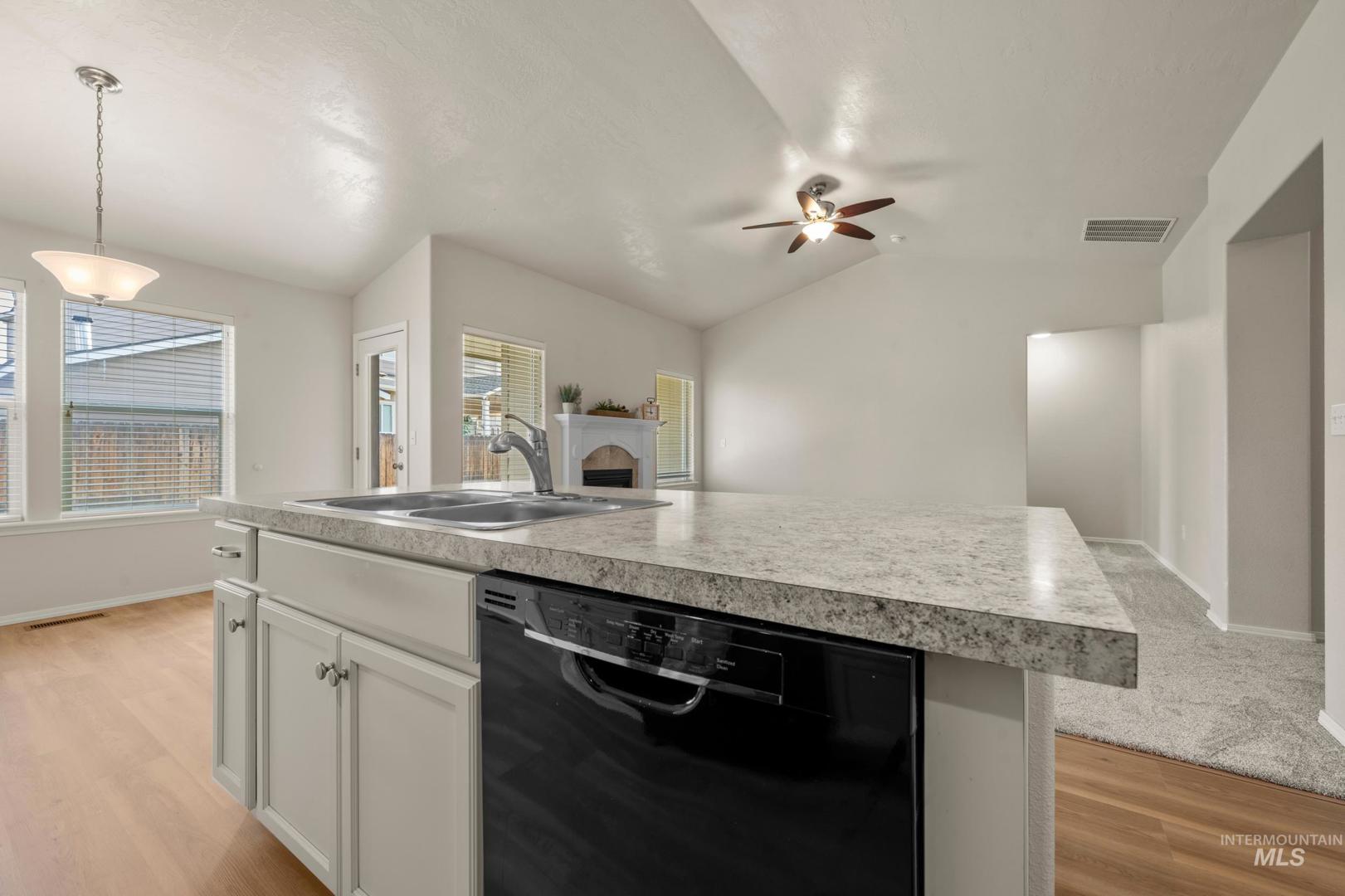 This delightful single-level split design home is even better than new! It boasts fresh carpet and laminate wood flooring in the kitchen, entryway, landscaping, water softener and blinds. Enter this charming residence through a spacious entryway that leads to a large living room with a vaulted ceiling and a cozy gas fireplace. The open kitchen features a pantry and an island, perfect for cooking and entertaining. The private master suite includes dual vanities and a walk-in closet. The laundry room is equipped with a sink and a hanging rod for convenience. Situated in a convenient location, this home is close to all the new amenities that Ten Mile has to offer. Come and explore this lovely home today! It features brand new carpet and kitchen/dining room flooring that has just been installed, along with a newer water heater!