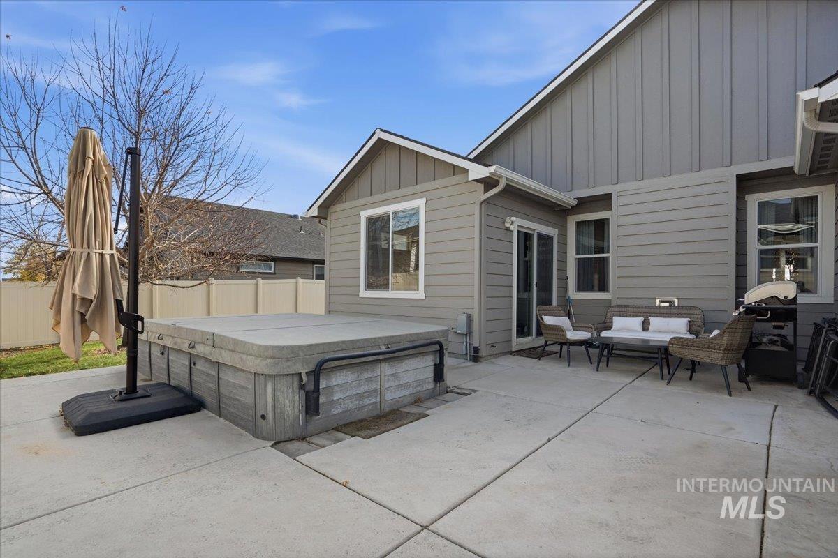 This beautifully maintained 3-bedroom, 2-bath home in the peaceful city of Star, offers a large kitchen featuring extensive counter space, upgraded cabinetry, a raised breakfast bar, and stainless steel appliances. The expansive living room with cozy fireplace and adjoining dining area create an ideal space for relaxing or entertaining. The split floorplan offers privacy, with a spacious master suite that includes a dual vanity bathroom, separate tub and shower, and an oversized walk-in closet. Additional highlights include a large walk-in pantry, vaulted ceilings, a 4` garage extension for extra storage, and a backyard swim spa perfect for year-round enjoyment.