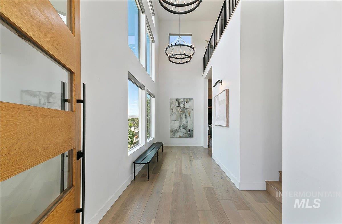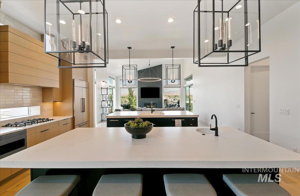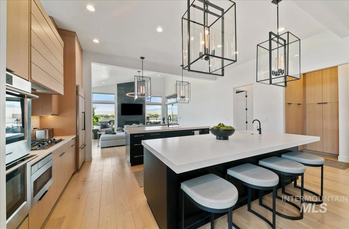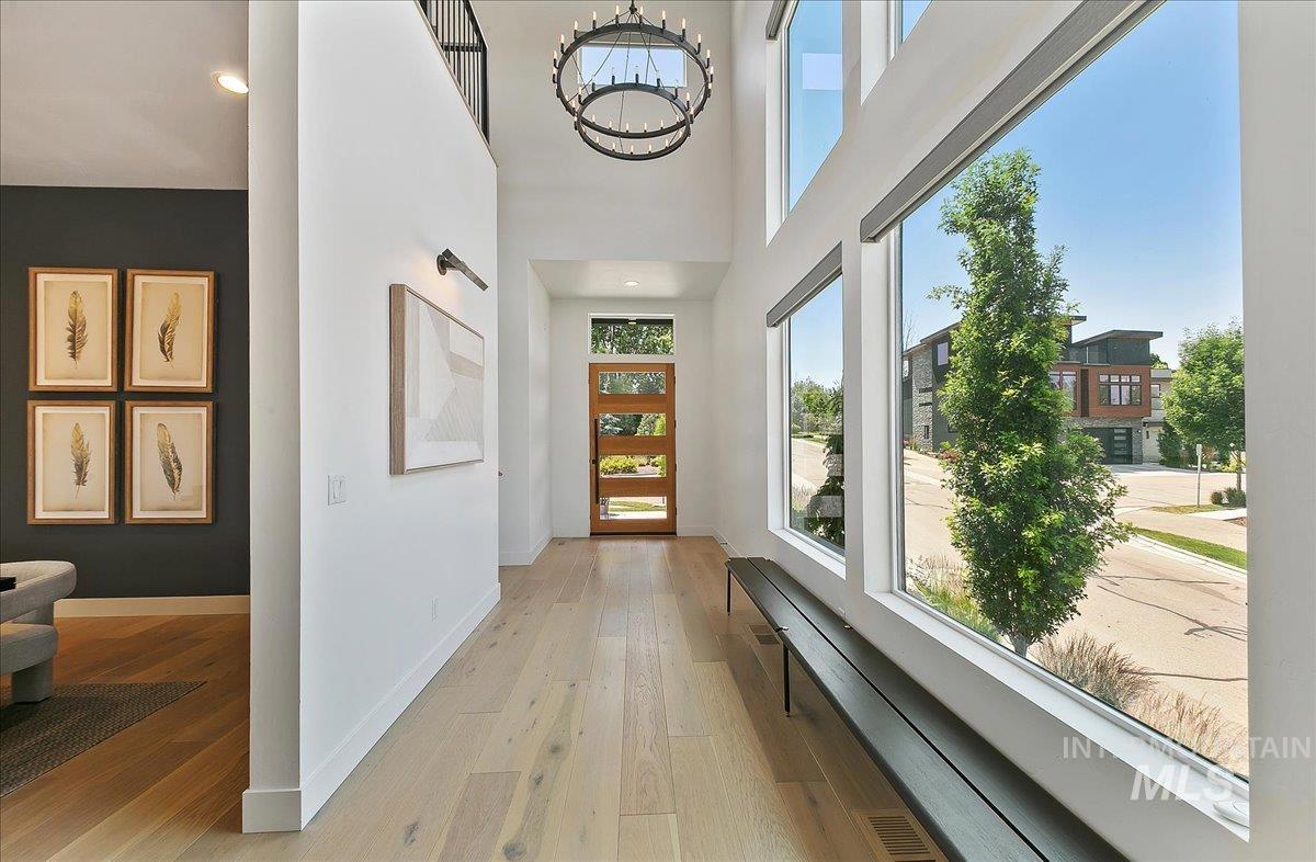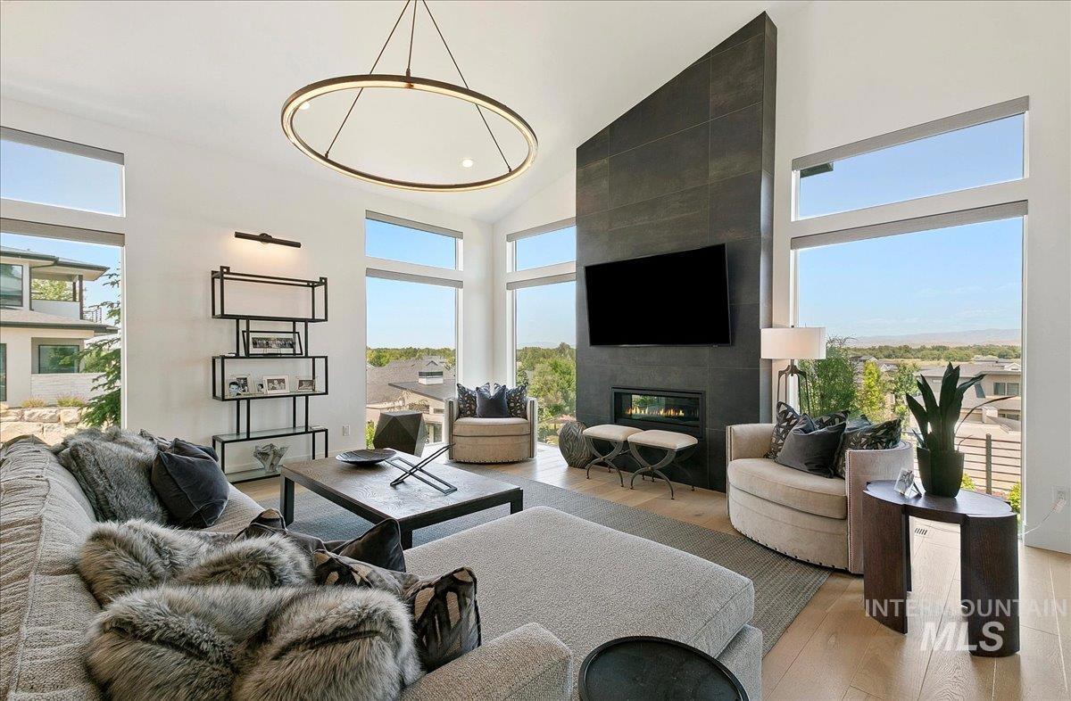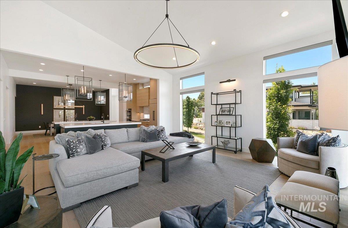 Experience elevated living in this striking modern masterpiece, ideally located in the prestigious gated community of Lakemoor. Built for entertaining and a lock and leave lifestyle, every inch of this home has been meticulously curated with high-end finishes and statement design. Soaring ceilings and expansive floor-to-ceiling windows flood the home with natural light while framing panoramic views of Eagle and the Boise Foothills. The gourmet kitchen is a showstopper -- featuring rift sawn white oak custom cabinetry, sleek quartz countertops, two expansive islands, premium appliance package and coffee bar w/ beverage & wine refrigerator. Additional features include wide-plank white oak hardwood flooring, Restoration Hardware lighting, automated window treatments, epoxy garage floors and cabinets and Timber Tech decking. Lakemoor residents enjoy resort-style amenities including pools, sports courts, walking trails and greenbelt access—all just minutes from Downtown Eagle, restaurants & entertainment.