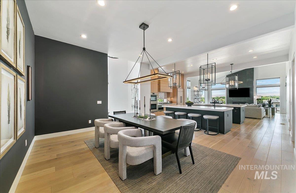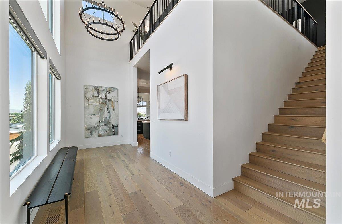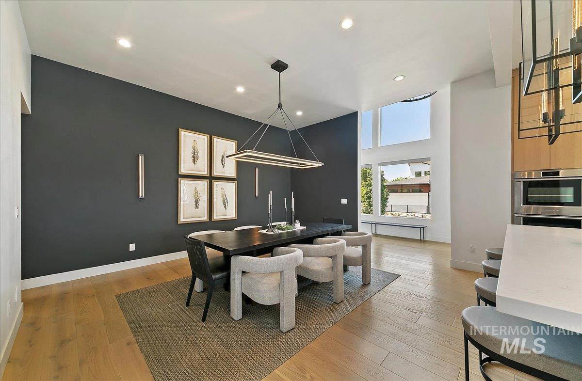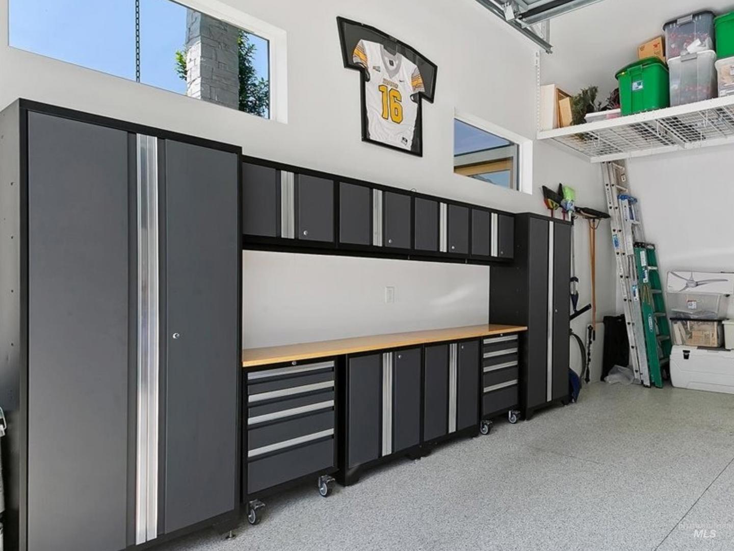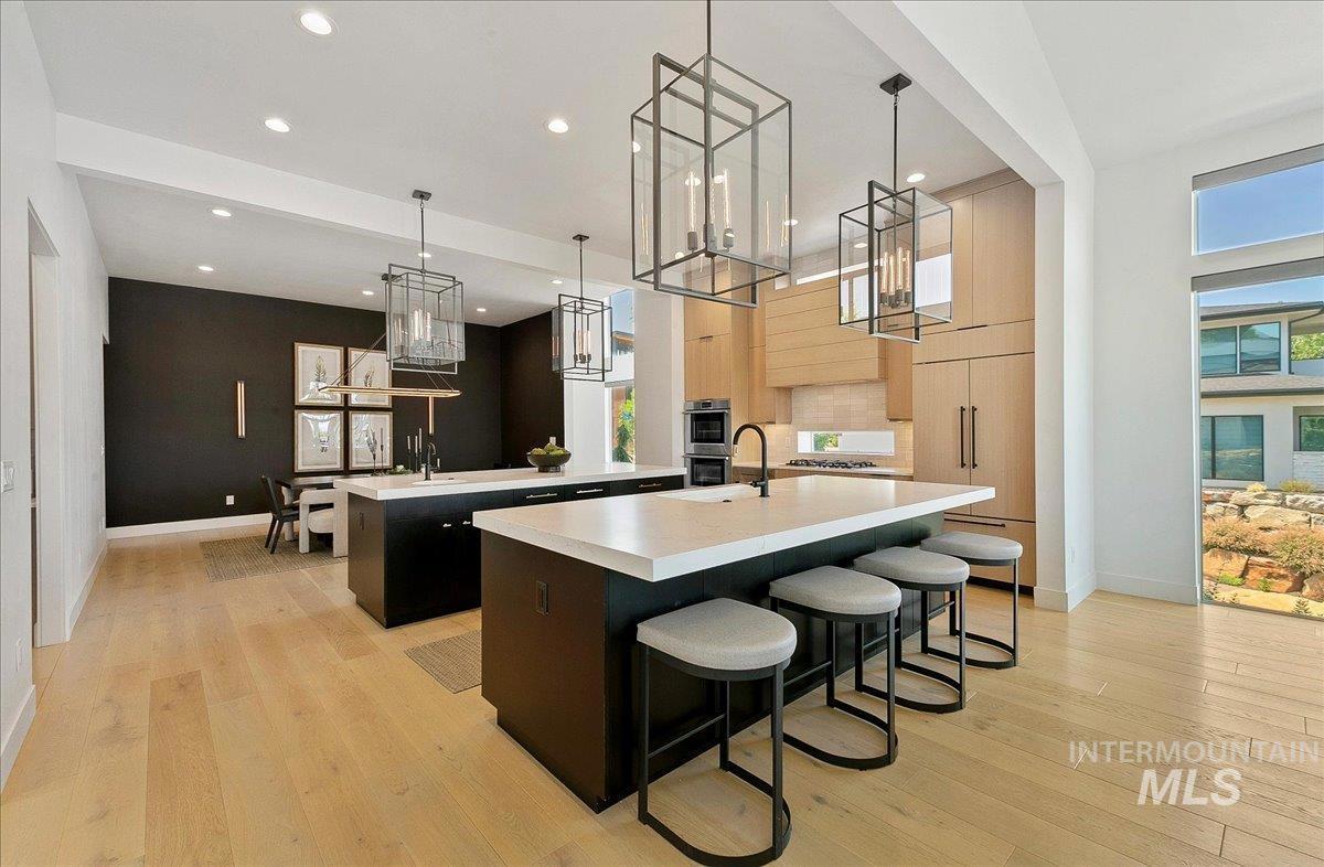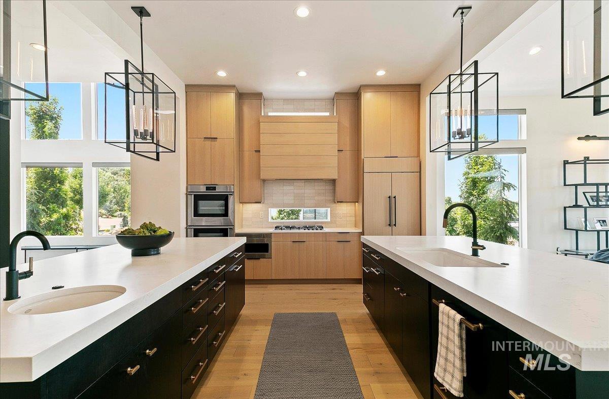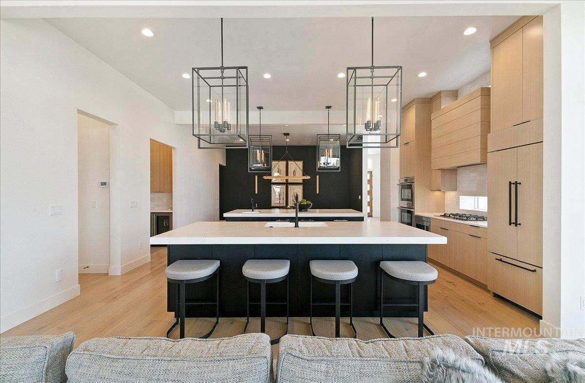 Experience elevated living in this striking modern masterpiece, ideally located in the prestigious gated community of Lakemoor. Built for entertaining and a lock and leave lifestyle, every inch of this home has been meticulously curated with high-end finishes and statement design. Soaring ceilings and expansive floor-to-ceiling windows flood the home with natural light while framing panoramic views of Eagle and the Boise Foothills. The gourmet kitchen is a showstopper -- featuring rift sawn white oak custom cabinetry, sleek quartz countertops, two expansive islands, premium appliance package and coffee bar w/ beverage & wine refrigerator. Additional features include wide-plank white oak hardwood flooring, Restoration Hardware lighting, automated window treatments, epoxy garage floors and cabinets and Timber Tech decking. Lakemoor residents enjoy resort-style amenities including pools, sports courts, walking trails and greenbelt access—all just minutes from Downtown Eagle, restaurants & entertainment.