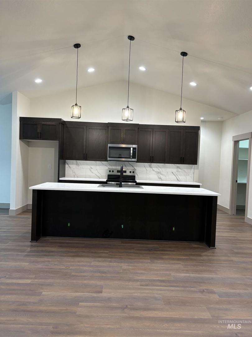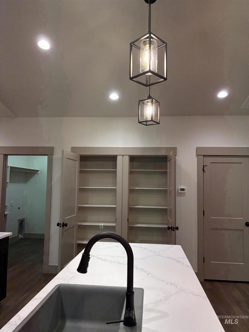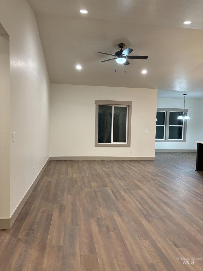 Come check out this four bedroom two bath home! The fourth bedroom can also be an office. The open floor plan features vaulted ceiling, natural lighting, luxury vinyl flooring throughout home, with the exception of carpet in three bedrooms. The kitchen features quartz counter tops, an island and in addition to the electric range there is gas plumbed into the range area. The house will come with the electric range though. Behind the house is a nice yard, garden bed area and an orchard area both have irrigation. All guttering is attached to French drains. Garage is an extra large two car garage with both doors being 12 foot wide doors.