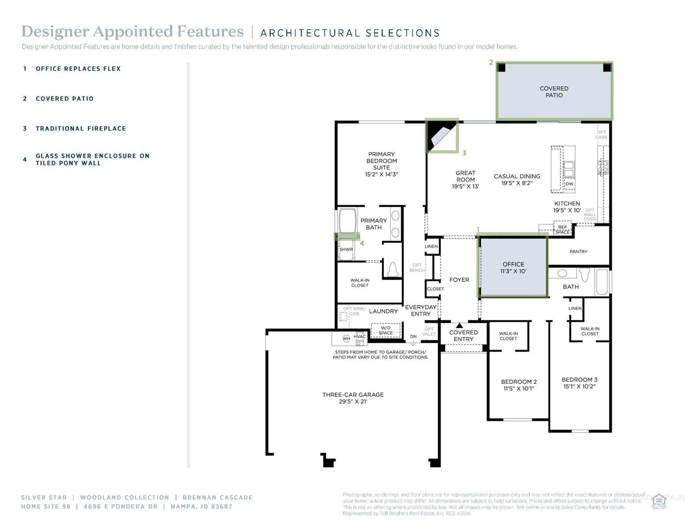 "The Brennan". This amazing home offers an open kitchen and living space with lots of counter space and storage and an island with breakfast bar seating. The spacious primary suite offers a luxurious bathroom with separate tile shower and soaker tub, dual sink vanity, and walk in closet. This home also offers 2 large secondary bedrooms with walk in closets, home office and a covered back patio. 3 car garage. Front and rear landscape included. BTVAI