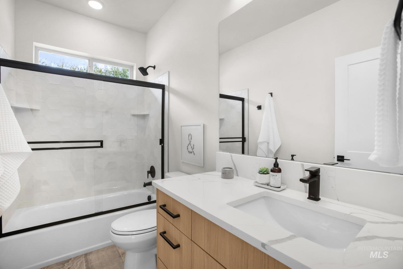 Discover elevated living in this beautifully crafted 3 bedroom, 2 bath home with a dedicated office. The open concept kitchen features quartz countertops, a gas range, and luxury vinyl plank flooring, flowing into a bright living area with a cozy fireplace and custom built in cabinetry. Two spacious guest bedrooms share a stylish bathroom with quartz counters and a tiled shower bath combination, while the primary suite offers a private retreat with dual vanities, a fully tiled step in shower, and high end finishes throughout. Buyers may have the opportunity to personalize select paint, flooring, or finish options depending on construction stage, making now the perfect time to customize. Ideally located on a generous lot near freeway access, Albertsons Marketplace, the YMCA, and Meridian shopping and dining. HOA covers front and back lawn care, offering true maintenance free living in this turn key home.