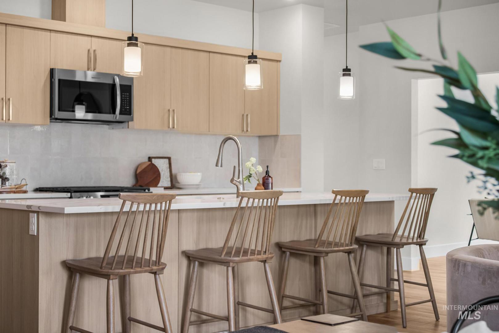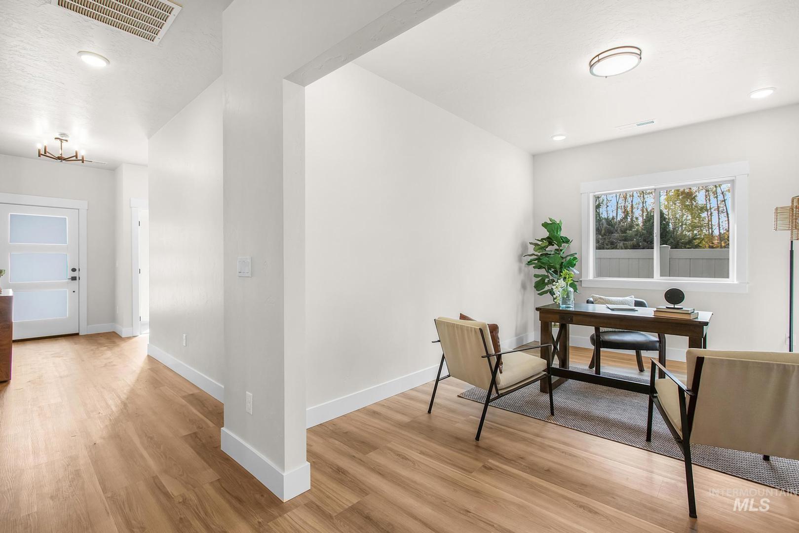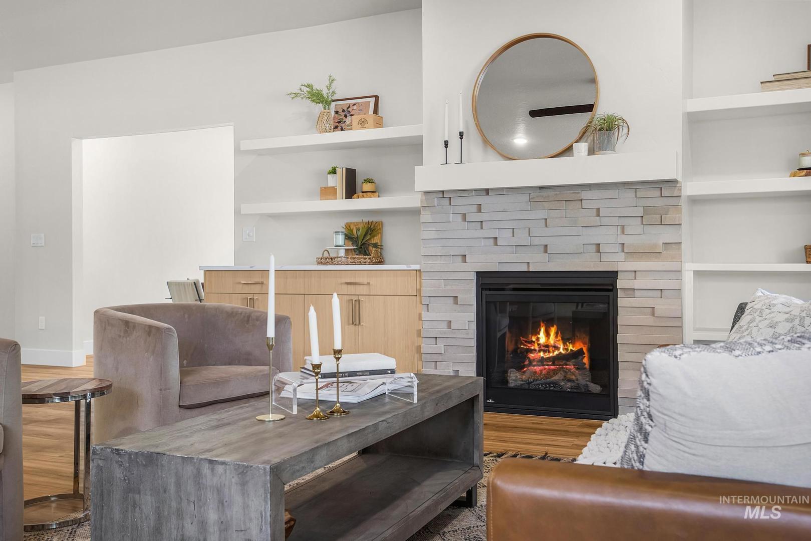 Biggest Lot in the community! Discover elevated living in this beautifully crafted 3 bedroom, 2 bath home with a dedicated office. The open concept kitchen features quartz countertops, a gas range, and luxury vinyl plank flooring, flowing into a bright living area with a cozy fireplace and custom built in cabinetry. Two spacious guest bedrooms share a stylish bathroom with quartz counters and a tiled shower bath combination, while the primary suite offers a private retreat with dual vanities, a fully tiled step in shower, and high end finishes throughout. Buyers may have the opportunity to personalize select paint, flooring, or finish options depending on construction stage, making now the perfect time to customize. Ideally located on a generous lot near freeway access, Albertsons Marketplace, the YMCA, and Meridian shopping and dining. HOA covers front and back lawn care, offering true maintenance free living in this turn key home.