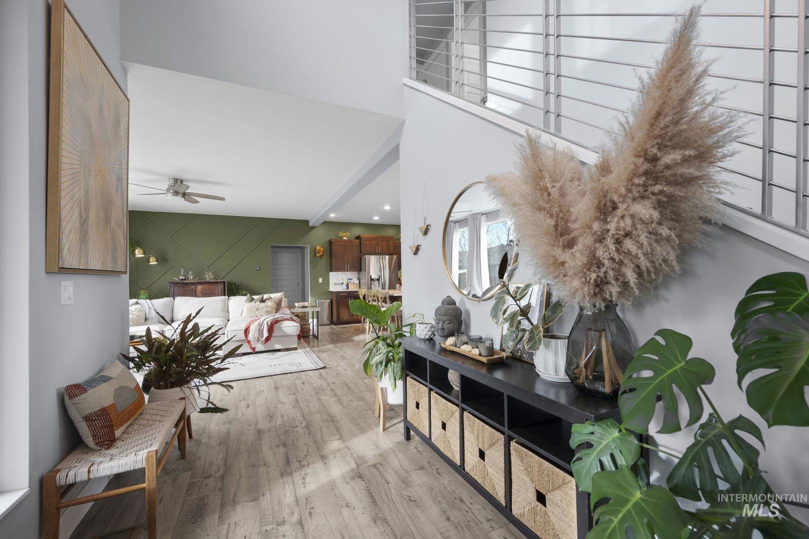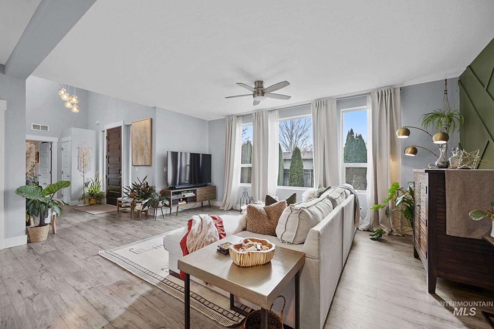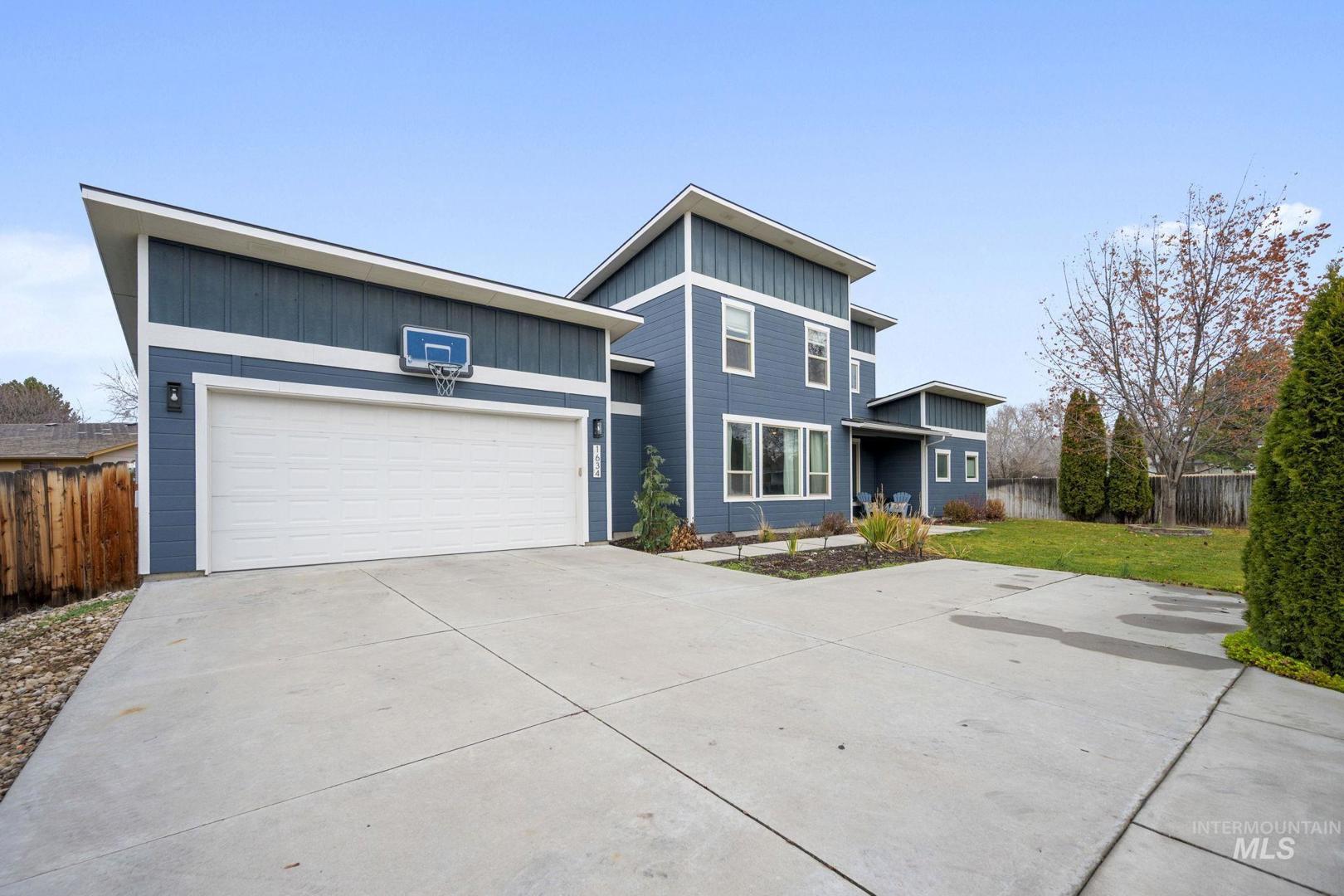 Excellent location, modern design, and a rare, private ¼ acre lot. No CCRs or HOA dues. This well-maintained home truly has it all. Spacious primary suite is conveniently located on the main level, while two additional bedrooms and a large loft upstairs provide flexible living space for guests, work, or play. Open concept layout flows seamlessly to a fully fenced backyard featuring a generous covered patio and firepit, making it ideal for both indoor and outdoor entertaining. The property is fully landscaped with automatic sprinklers. Backyard storage shed helps keep the two-car garage free for vehicles and gear. The 130-foot private, concrete driveway offers abundant extra parking perfect for RVs, trailers, or guests. Enjoy quick access to everything Boise has to offer- just 6 minutes to downtown and the airport, 10 minutes to Micron, and close to I-84, shopping, dining, parks, the Greenbelt, BSU, and Lucky Peak.
