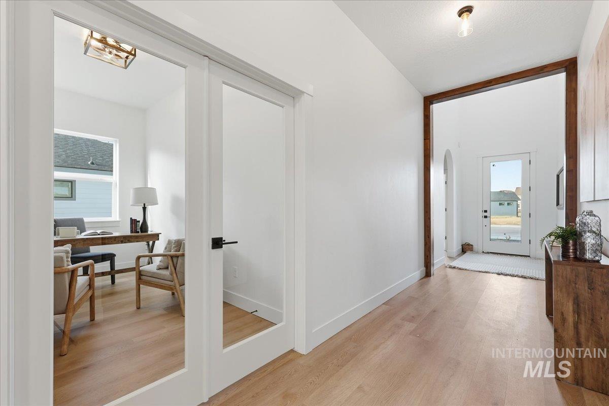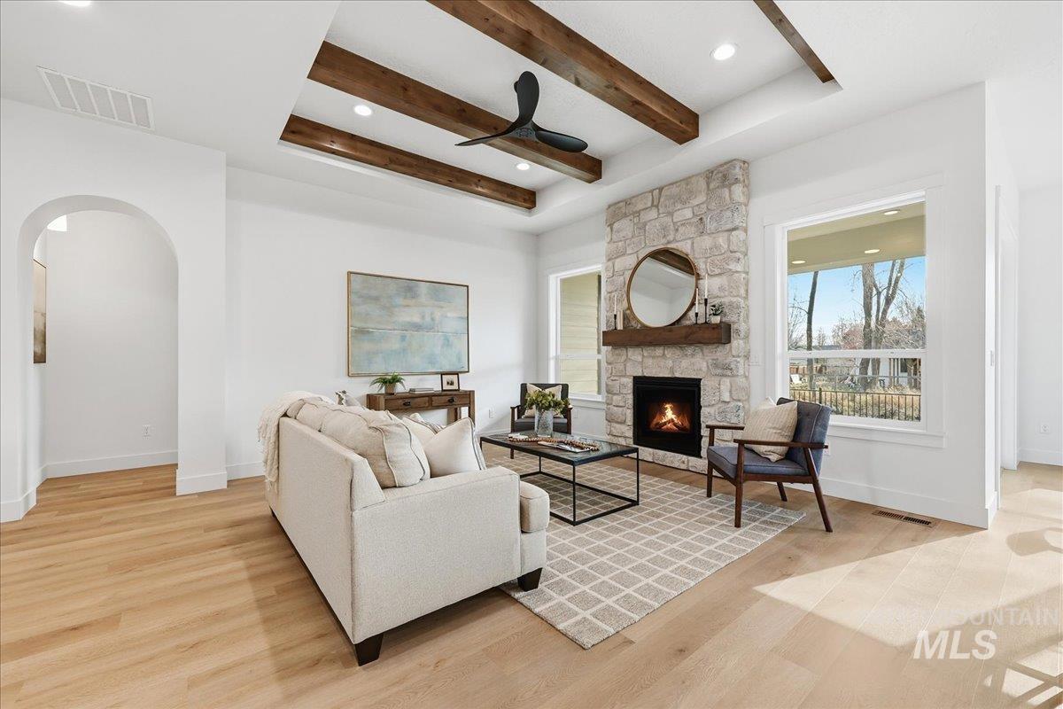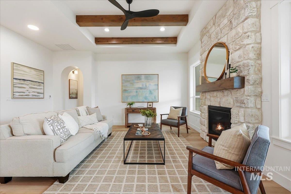 Beautifully crafted single-level home showcasing the quality and attention to detail behind the Greystone Home`s name. This thoughtfully designed floor plan offers 3 bedrooms, 2 bathrooms, plus a dedicated office, perfect for today’s lifestyle. Step inside to tall ceilings in the entry hallway and an abundance of natural light throughout. The great room is warm and inviting with beautiful wood beams accenting the ceiling, and has a cozy fireplace for the cooler days. The kitchen is both functional and stylish, featuring granite countertops, a built-in oven, and carefully selected finishes that elevate the space. The primary suite is a true retreat with private patio access, a recessed ceiling with accent lighting, a luxurious soaker tub, walk-in shower, and generous his-and-hers walk-in closets with convenient access to the laundry room. The oversized laundry room offers ample cabinetry, storage space, and a sink for added convenience. The fully insulated garage is finished with epoxy flooring and includes an impressive 27` boat bay—ideal for toys, storage, or extra workspace. Located in The Mill at Middleton, a brand-new subdivision featuring upgraded homes, this property offers small-town charm in the welcoming community of Middleton, Idaho. A must-see home combining quality, comfort, and thoughtful design.