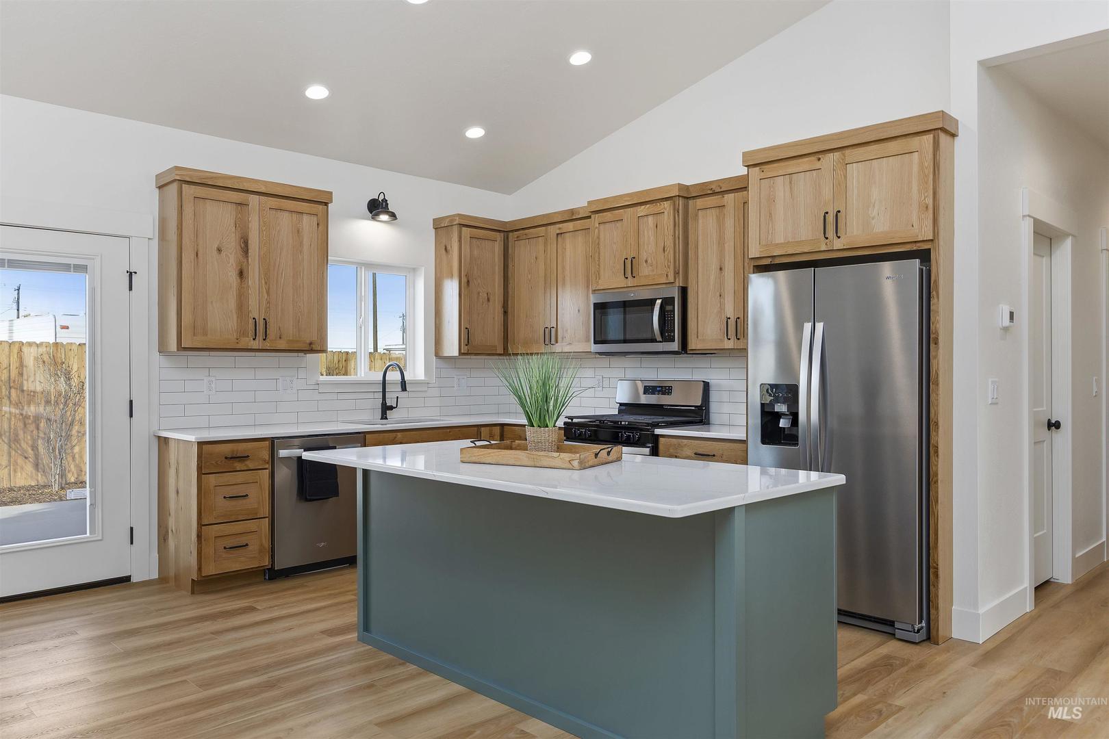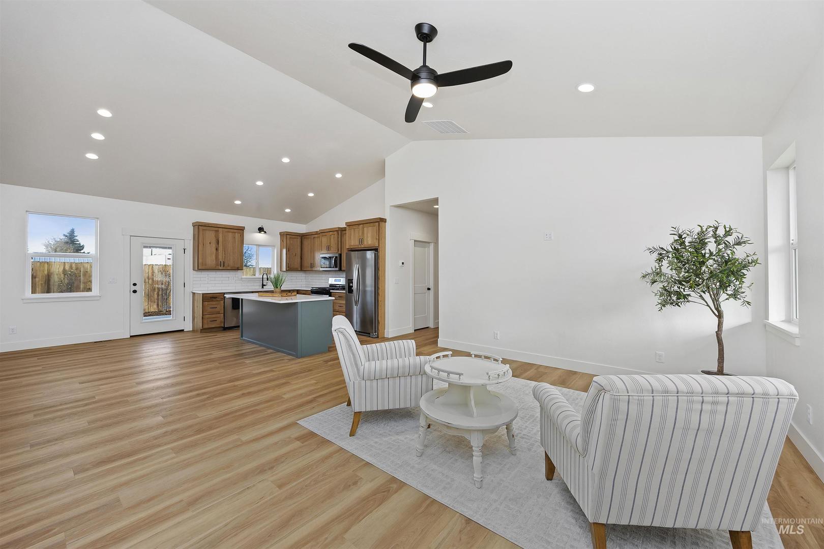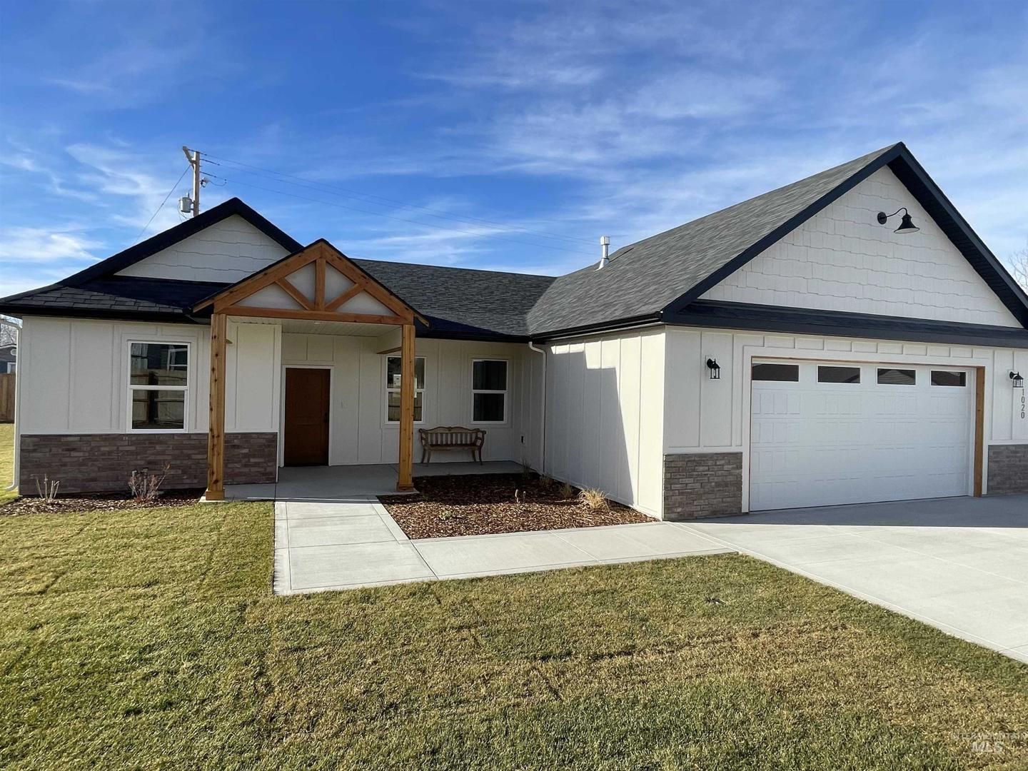 Welcome home! This beautifully crafted new construction cottage-style home is perfectly situated in a friendly, welcoming neighborhood. The heart of the home is the stunning custom white oak kitchen, complete with quartz countertops, stainless steel appliances, ample cabinetry, and a spacious walk-in pantry—ideal for entertaining and everyday life. The home also boasts a well-designed open floor layout with vaulted ceilings, a spacious laundry room, abundant added storage throughout, and generously sized bedrooms that provide both privacy and flexibility. Outside, you’ll find just as many extras. Enjoy a private driveway, oversized garage, and gravel RV parking with additional parking space. The spacious outdoor living area includes a paver patio with a portable fire pit, perfect for relaxing evenings. The yard is fully landscaped with trees, shrubs, and perennials in flower beds, supported by a full automatic sprinkler system and fence. The home’s exterior features board-and-batten siding, veneer brick and cedar accents on the front, showcasing exceptional curb appeal and durability.