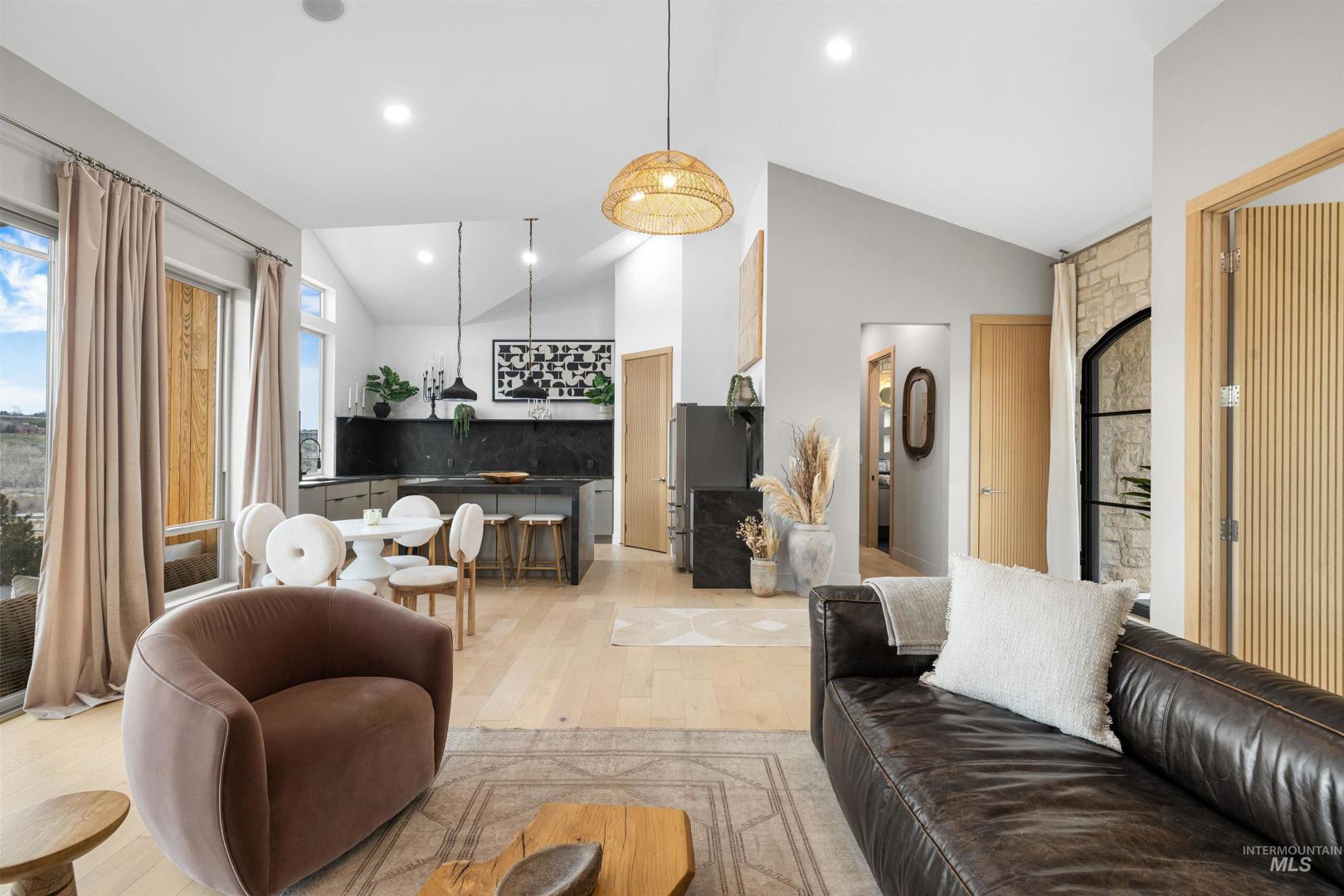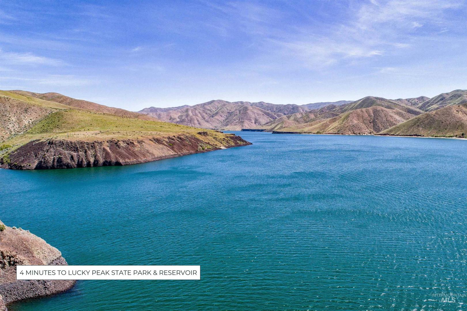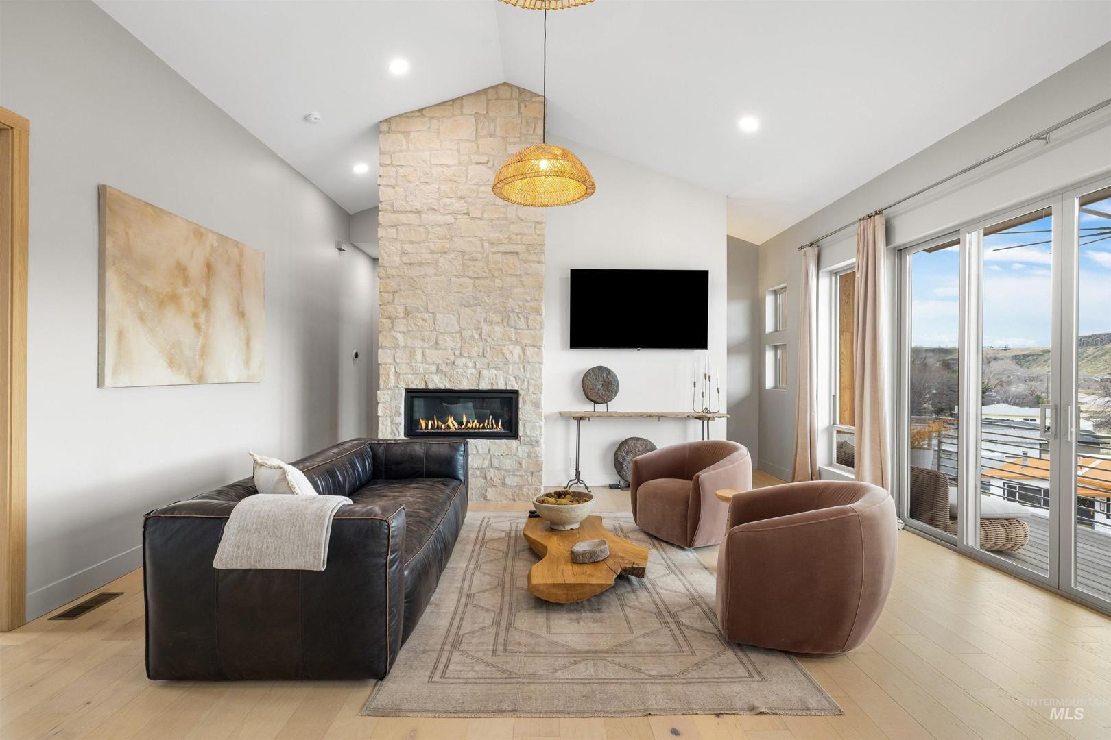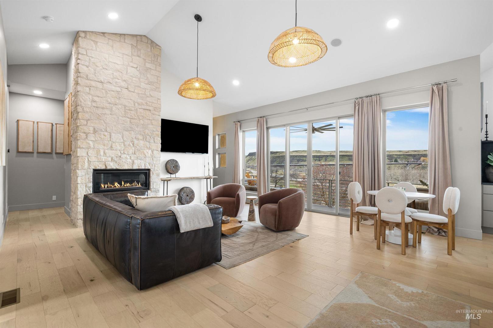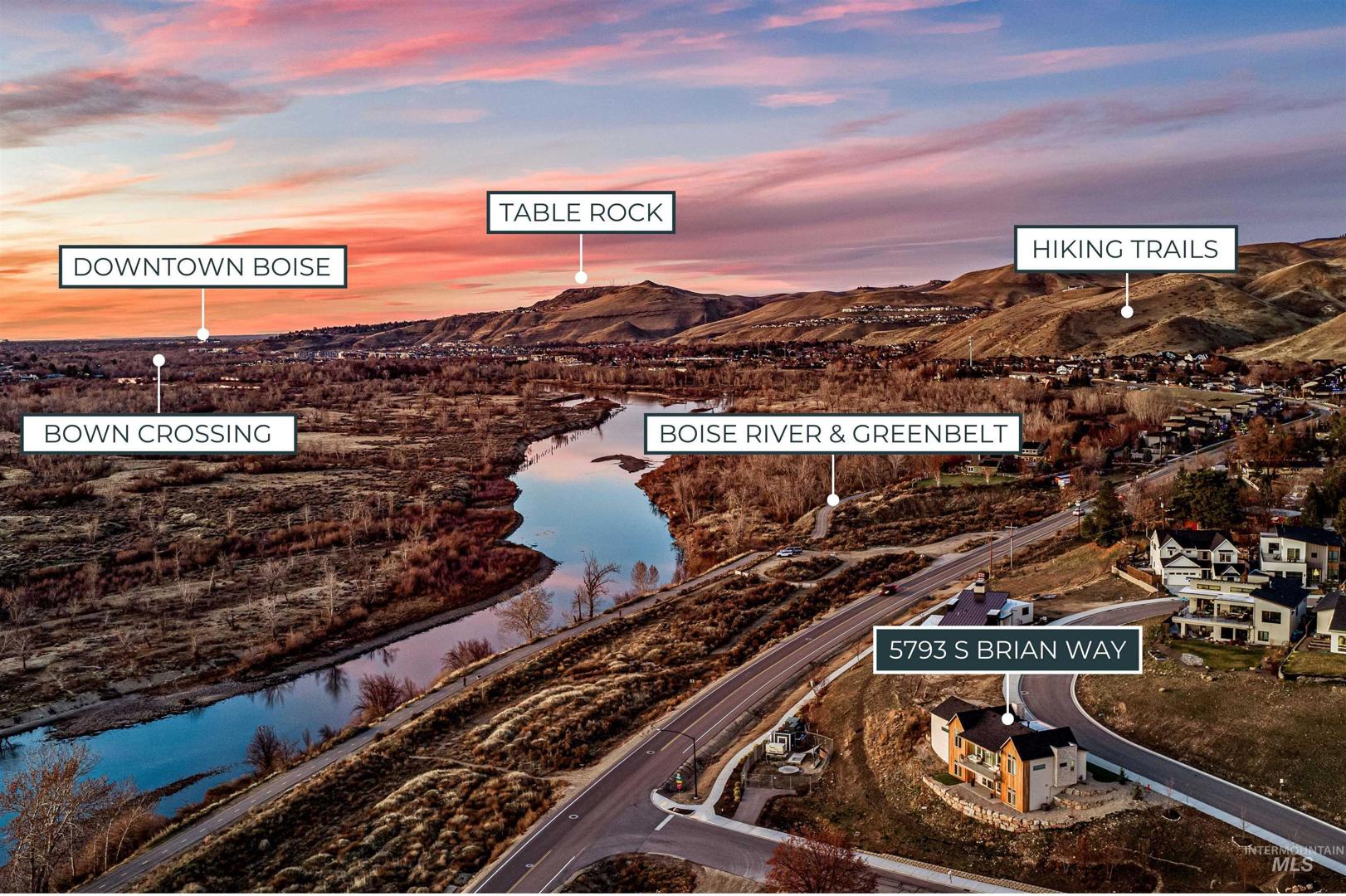 Set on the rim of East Boise off Warm Springs, this truly move-in-ready home showcases a stunning modern European design rarely seen in Boise. The open great room features a hand-laid stone fireplace and a full wall of sliding glass that captures views of the Boise River and foothills, creating a strong connection to the surrounding landscape. The striking kitchen includes a waterfall island, leather-finished quartz countertops, sleek cabinetry, slab backsplash with a gallery shelf, and a walk-in pantry. Vaulted ceilings enhance the open flow throughout the main level, which also includes a dedicated home office, powder bath with stone sink basin, mudroom, and a private primary suite. The primary suite captures river and Highway 21 bridge views and features heated Moroccan limestone tile flooring in the ensuite, a walk-in shower with dual showerheads, dual vanities, and a spacious walk-in closet with secondary laundry. The walkout lower level includes two king-sized bedrooms, a secondary living space, and a laundry room with a dedicated dog wash. Additional home highlights include an insulated two-car garage with EV charger, a rare heated driveway, low-maintenance turf landscaping, and designer lighting. With no possibility of direct rear neighbors, the property offers exceptional privacy near Lucky Peak, nearby trails, hot springs, and Bown Crossing dining and shops.
