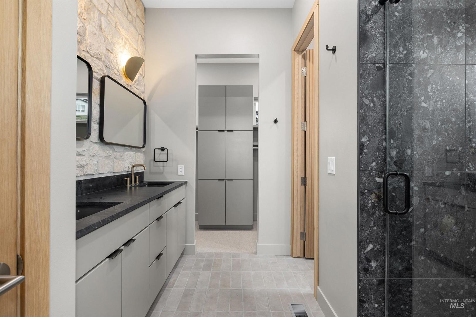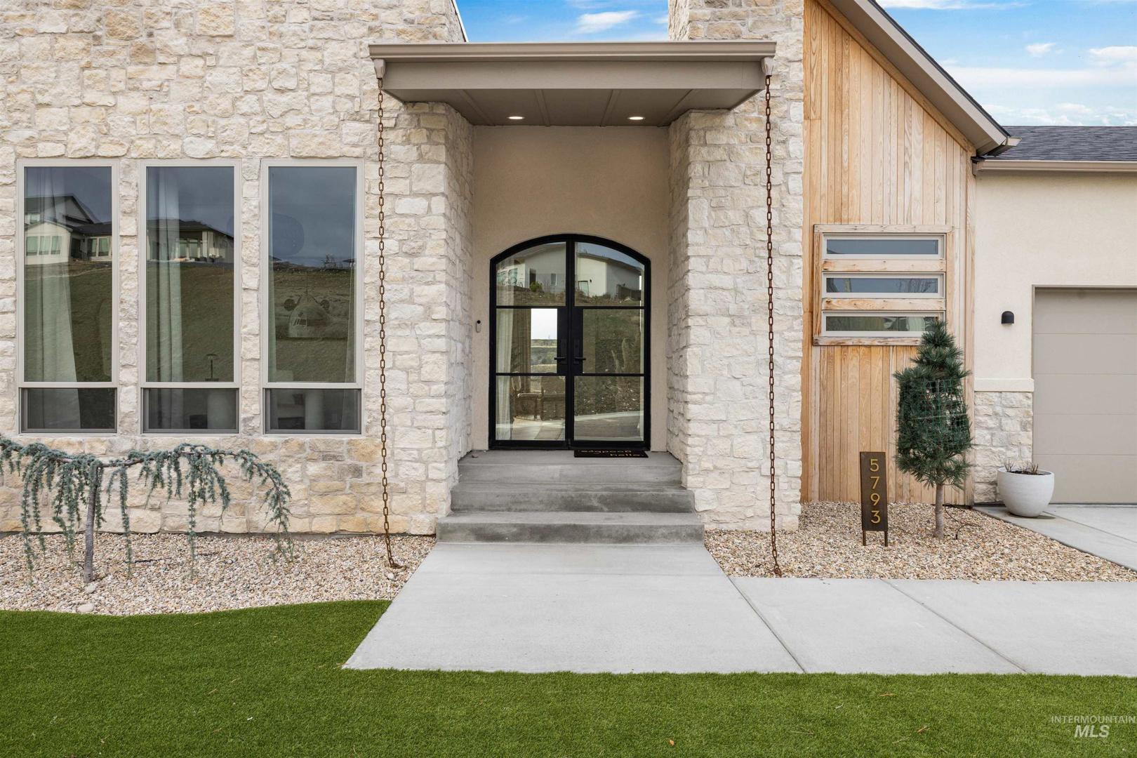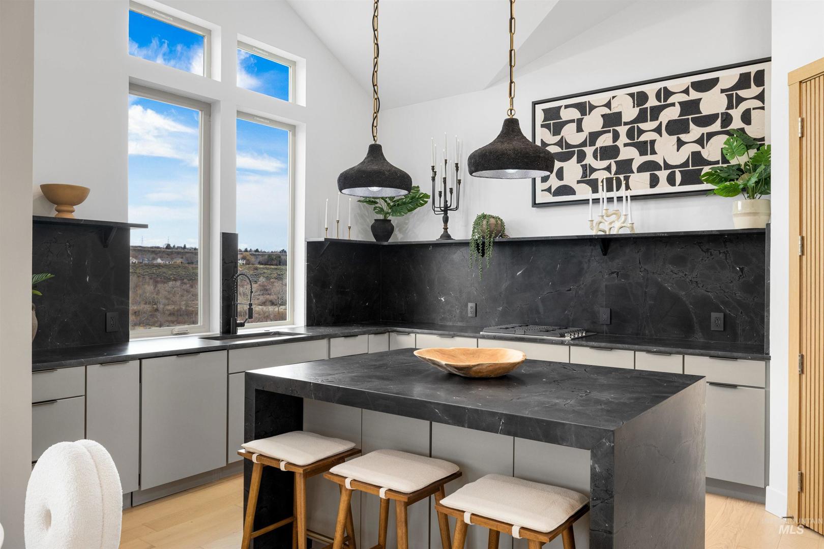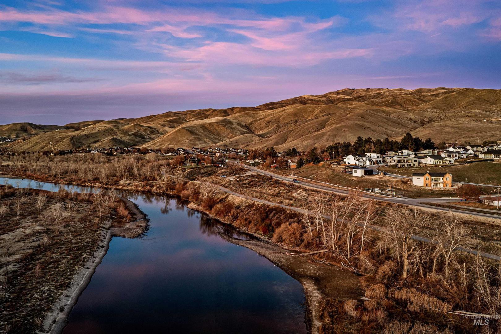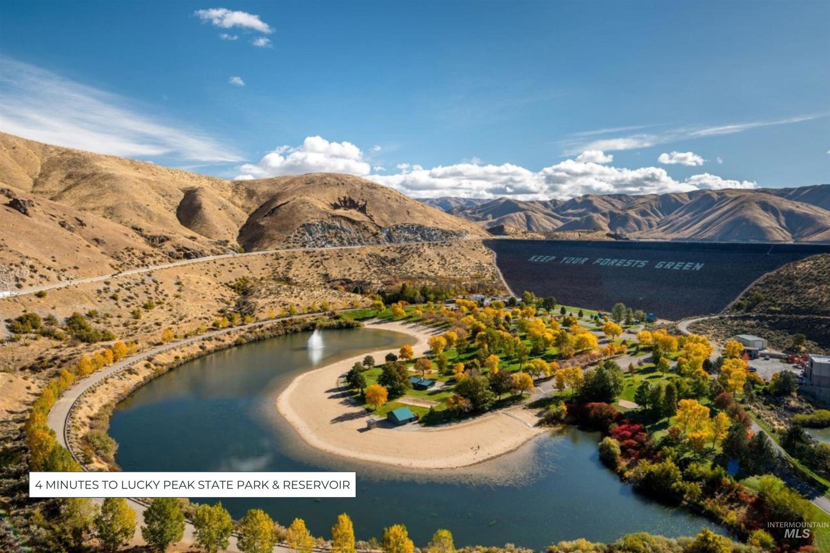 Set on the rim of East Boise off Warm Springs, this truly move-in-ready home showcases a stunning modern European design rarely seen in Boise. The open great room features a hand-laid stone fireplace and a full wall of sliding glass that captures views of the Boise River and foothills, creating a strong connection to the surrounding landscape. The striking kitchen includes a waterfall island, leather-finished quartz countertops, sleek cabinetry, slab backsplash with a gallery shelf, and a walk-in pantry. Vaulted ceilings enhance the open flow throughout the main level, which also includes a dedicated home office, powder bath with stone sink basin, mudroom, and a private primary suite. The primary suite captures river and Highway 21 bridge views and features heated Moroccan limestone tile flooring in the ensuite, a walk-in shower with dual showerheads, dual vanities, and a spacious walk-in closet with secondary laundry. The walkout lower level includes two king-sized bedrooms, a secondary living space, and a laundry room with a dedicated dog wash. Additional home highlights include an insulated two-car garage with EV charger, a rare heated driveway, low-maintenance turf landscaping, and designer lighting. With no possibility of direct rear neighbors, the property offers exceptional privacy near Lucky Peak, nearby trails, hot springs, and Bown Crossing dining and shops.