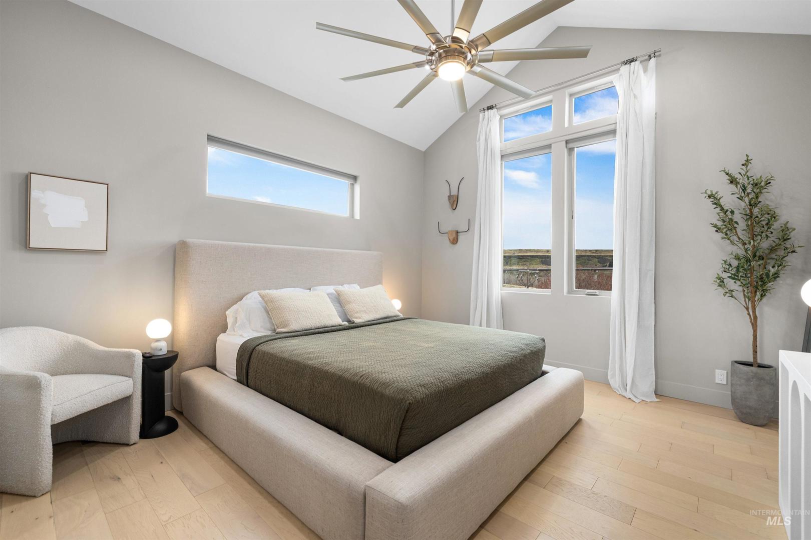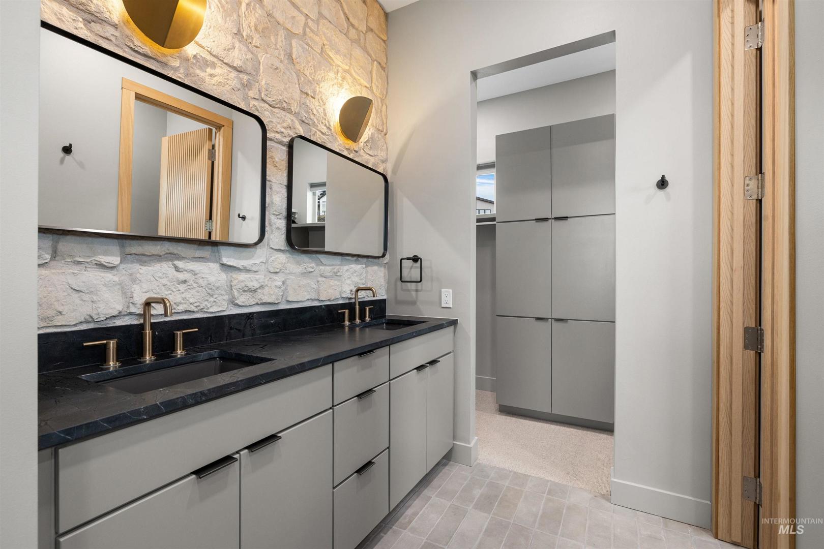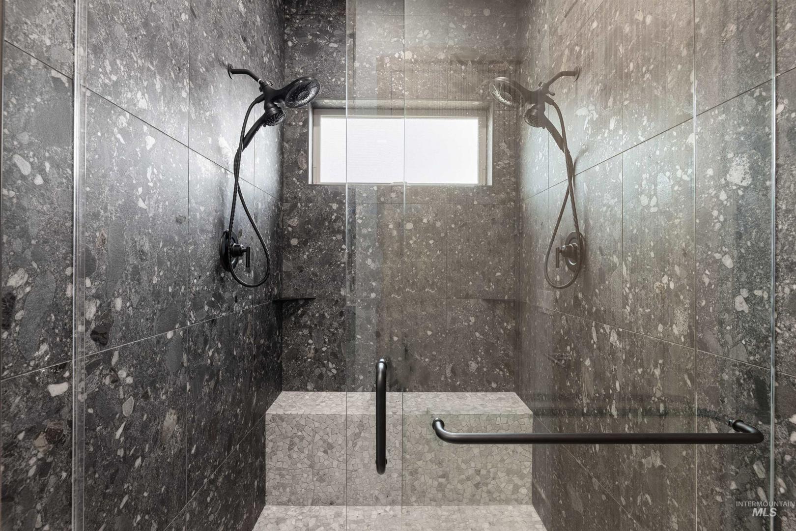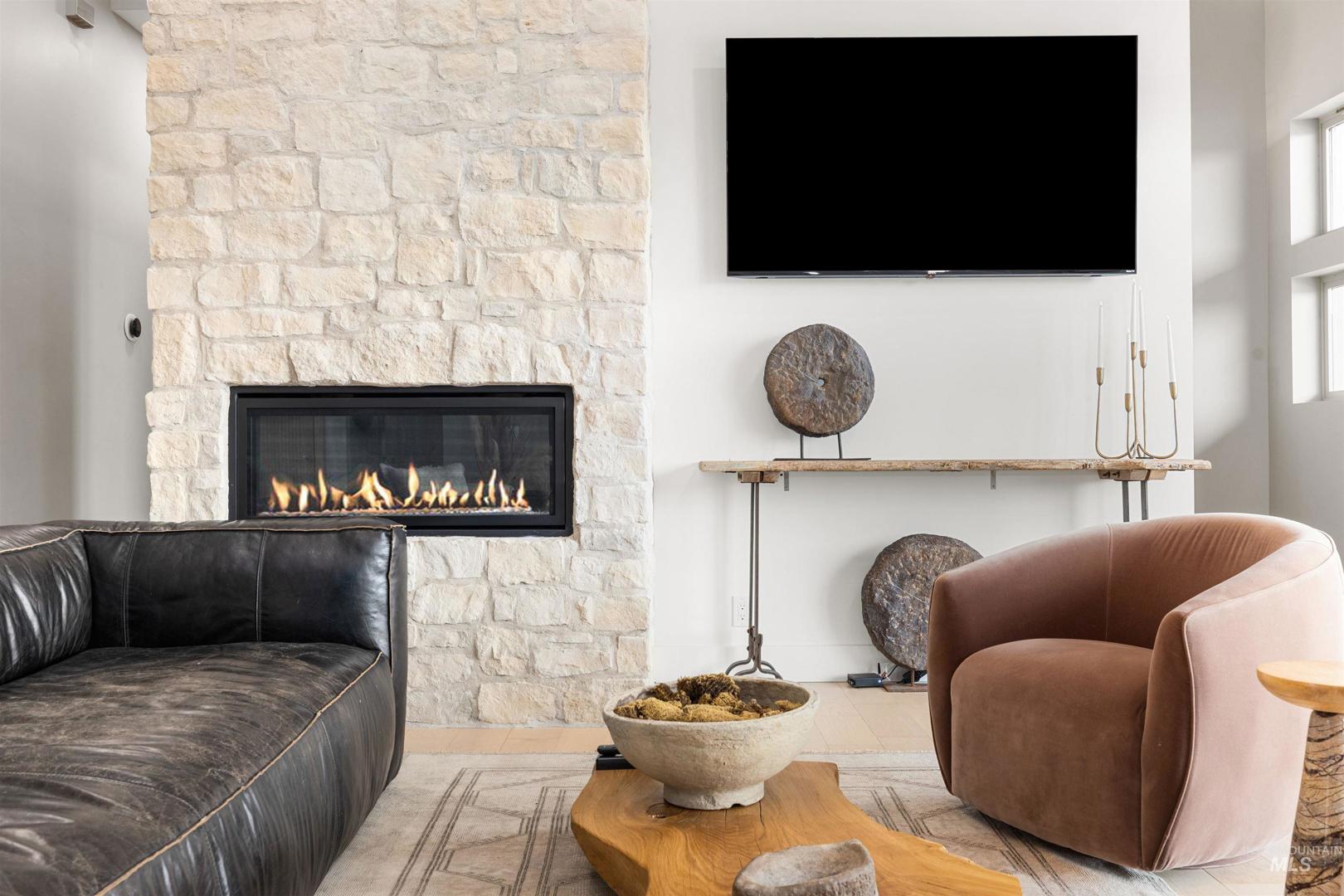 Set on the rim of East Boise off Warm Springs, this truly move-in-ready home showcases a stunning modern European design rarely seen in Boise. The open great room features a hand-laid stone fireplace and a full wall of sliding glass that captures views of the Boise River and foothills, creating a strong connection to the surrounding landscape. The striking kitchen includes a waterfall island, leather-finished quartz countertops, sleek cabinetry, slab backsplash with a gallery shelf, and a walk-in pantry. Vaulted ceilings enhance the open flow throughout the main level, which also includes a dedicated home office, powder bath with stone sink basin, mudroom, and a private primary suite. The primary suite captures river and Highway 21 bridge views and features heated Moroccan limestone tile flooring in the ensuite, a walk-in shower with dual showerheads, dual vanities, and a spacious walk-in closet with secondary laundry. The walkout lower level includes two king-sized bedrooms, a secondary living space, and a laundry room with a dedicated dog wash. Additional home highlights include an insulated two-car garage with EV charger, a rare heated driveway, low-maintenance turf landscaping, and designer lighting. With no possibility of direct rear neighbors, the property offers exceptional privacy near Lucky Peak, nearby trails, hot springs, and Bown Crossing dining and shops.