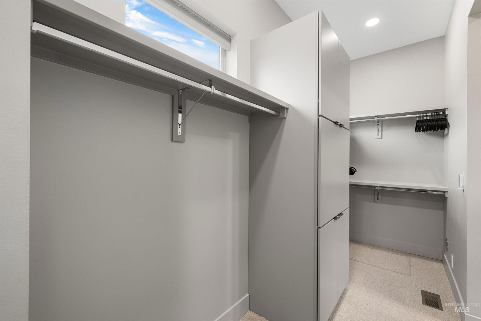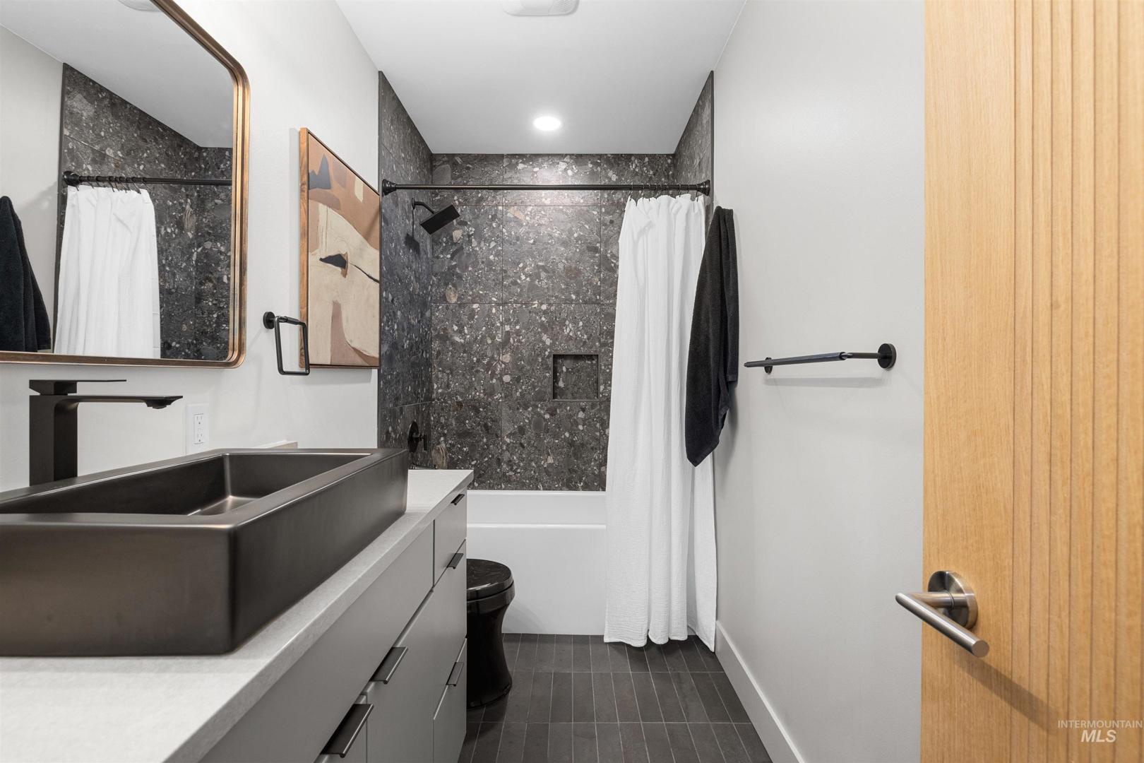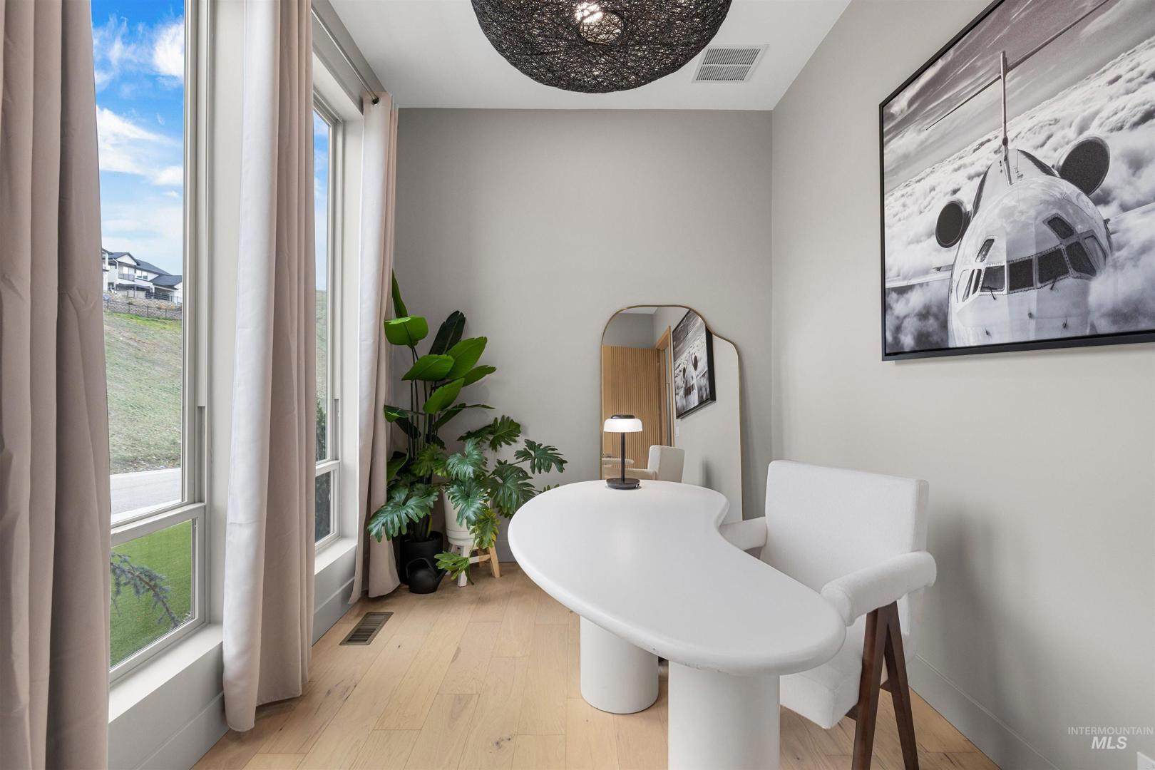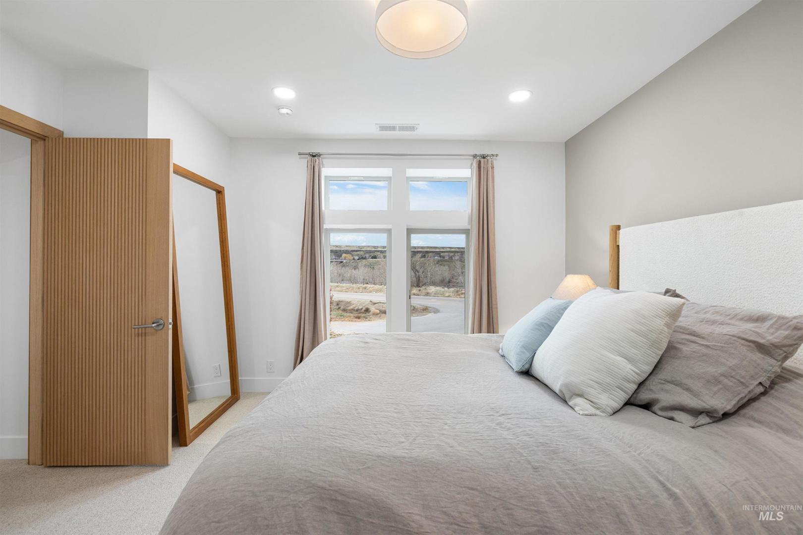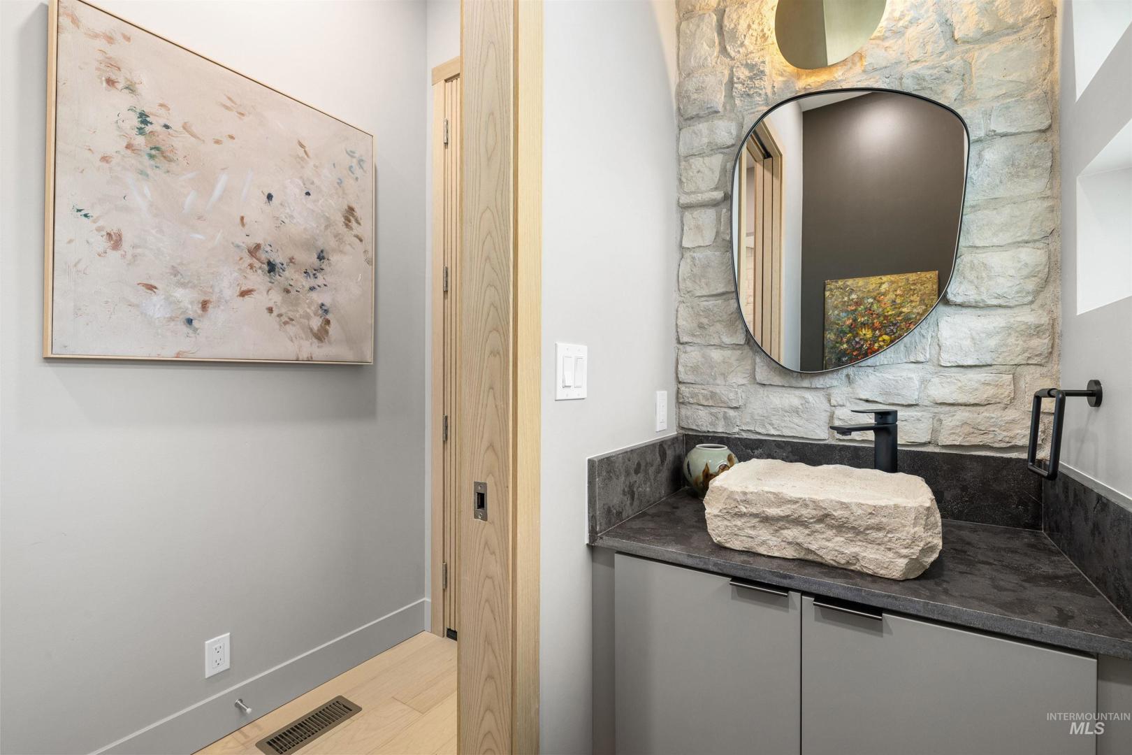 Set on the rim of East Boise off Warm Springs, this truly move-in-ready home showcases a stunning modern European design rarely seen in Boise. The open great room features a hand-laid stone fireplace and a full wall of sliding glass that captures views of the Boise River and foothills, creating a strong connection to the surrounding landscape. The striking kitchen includes a waterfall island, leather-finished quartz countertops, sleek cabinetry, slab backsplash with a gallery shelf, and a walk-in pantry. Vaulted ceilings enhance the open flow throughout the main level, which also includes a dedicated home office, powder bath with stone sink basin, mudroom, and a private primary suite. The primary suite captures river and Highway 21 bridge views and features heated Moroccan limestone tile flooring in the ensuite, a walk-in shower with dual showerheads, dual vanities, and a spacious walk-in closet with secondary laundry. The walkout lower level includes two king-sized bedrooms, a secondary living space, and a laundry room with a dedicated dog wash. Additional home highlights include an insulated two-car garage with EV charger, a rare heated driveway, low-maintenance turf landscaping, and designer lighting. With no possibility of direct rear neighbors, the property offers exceptional privacy near Lucky Peak, nearby trails, hot springs, and Bown Crossing dining and shops.