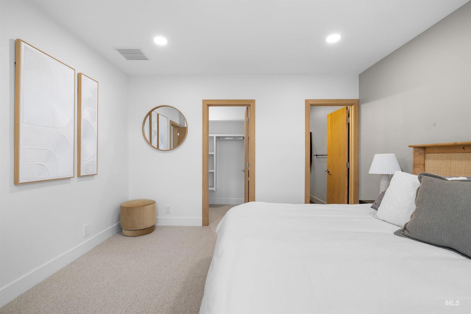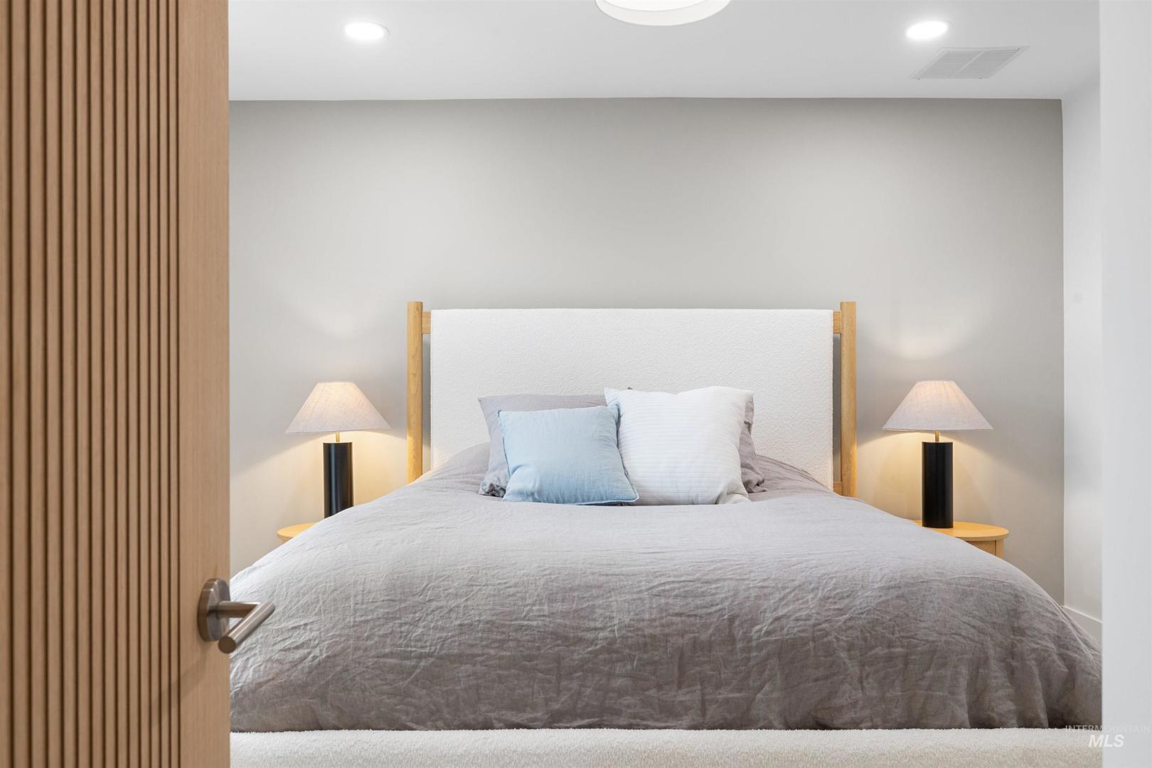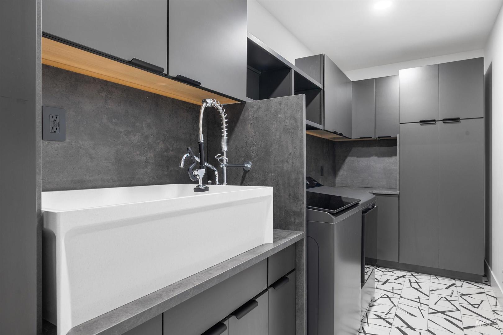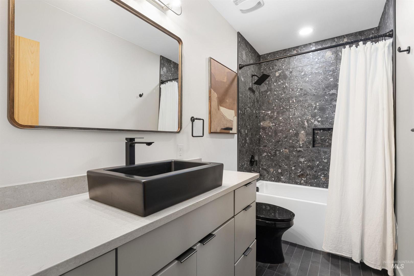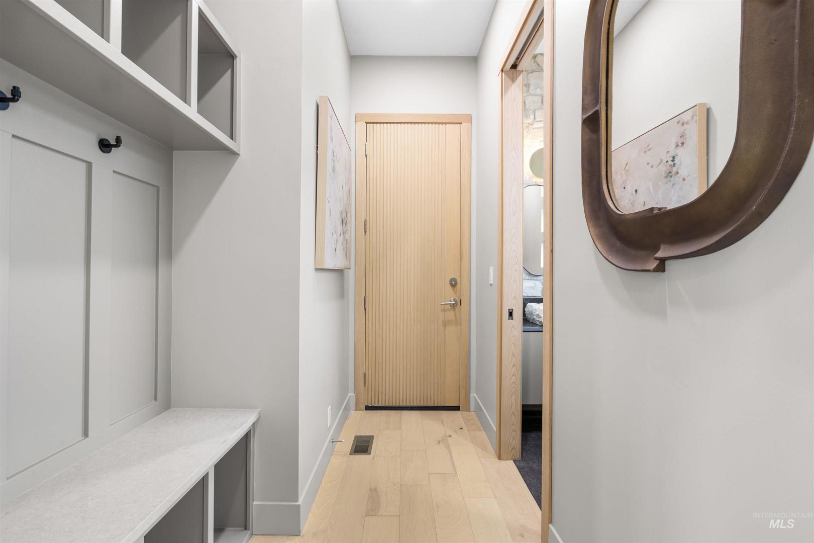 Set on the rim of East Boise off Warm Springs, this truly move-in-ready home showcases a stunning modern European design rarely seen in Boise. The open great room features a hand-laid stone fireplace and a full wall of sliding glass that captures views of the Boise River and foothills, creating a strong connection to the surrounding landscape. The striking kitchen includes a waterfall island, leather-finished quartz countertops, sleek cabinetry, slab backsplash with a gallery shelf, and a walk-in pantry. Vaulted ceilings enhance the open flow throughout the main level, which also includes a dedicated home office, powder bath with stone sink basin, mudroom, and a private primary suite. The primary suite captures river and Highway 21 bridge views and features heated Moroccan limestone tile flooring in the ensuite, a walk-in shower with dual showerheads, dual vanities, and a spacious walk-in closet with secondary laundry. The walkout lower level includes two king-sized bedrooms, a secondary living space, and a laundry room with a dedicated dog wash. Additional home highlights include an insulated two-car garage with EV charger, a rare heated driveway, low-maintenance turf landscaping, and designer lighting. With no possibility of direct rear neighbors, the property offers exceptional privacy near Lucky Peak, nearby trails, hot springs, and Bown Crossing dining and shops.