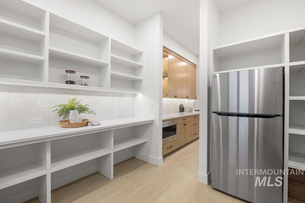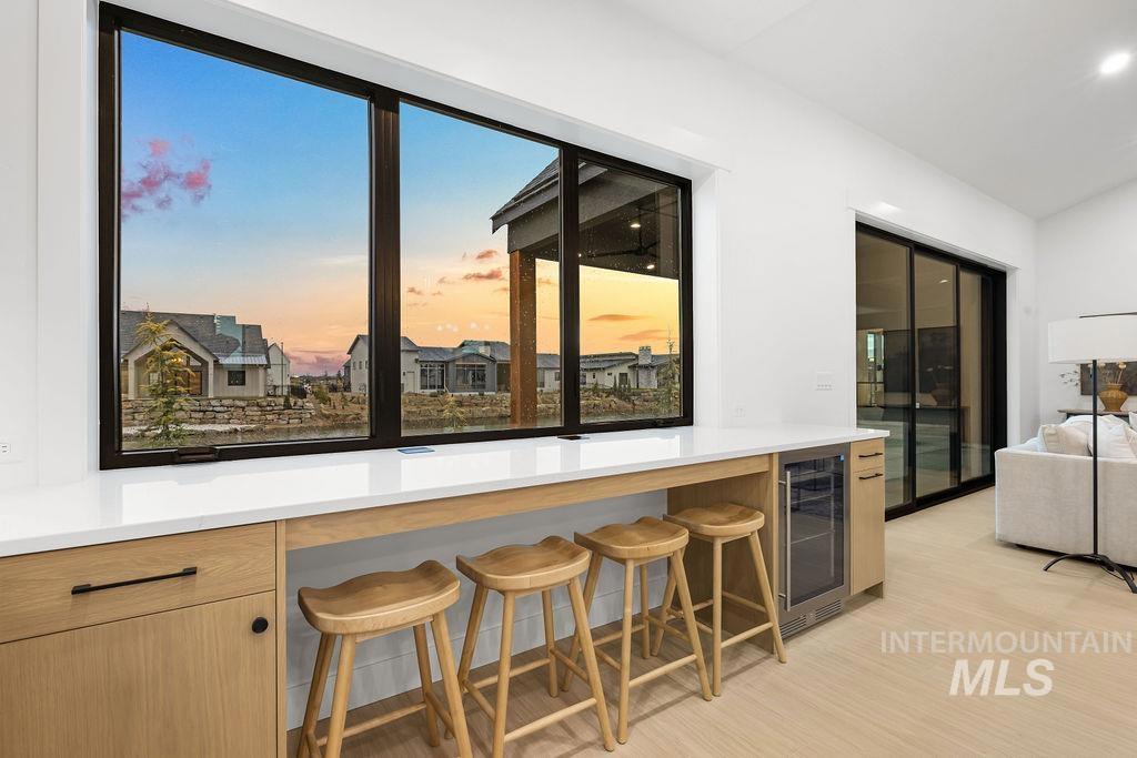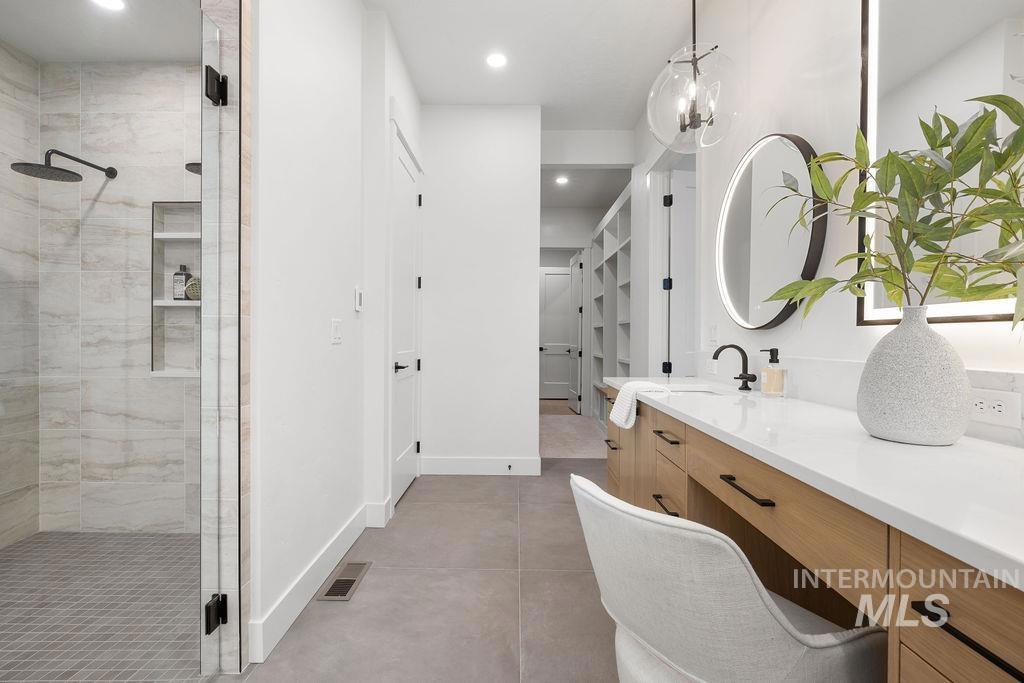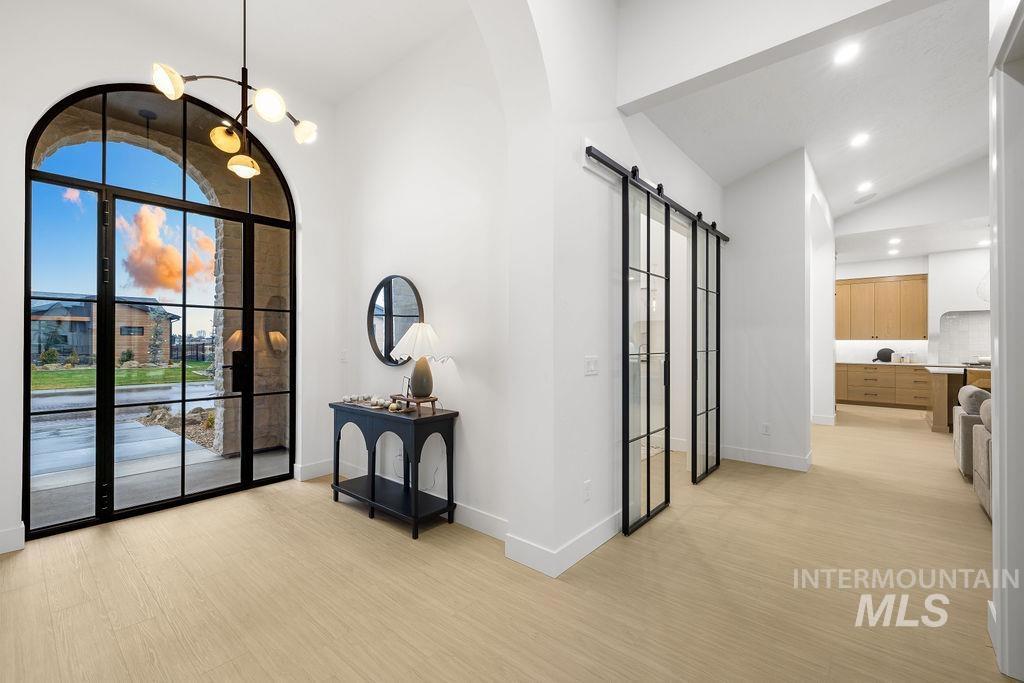 Time-less elegance in this mid-century modern home by Mendiola Custom Homes. The finest of materials and design have been used in this lovely single level home. Custom, well-placed lighting. In the great room, beamed, high ceiling. Double refrigerator/freezer in Kitchen. Large industrial size double oven/range. Designer fireplace. Natural light. Custom cabinetry. Spa like Master bathroom retreat with double sinks and shower heads. 3-car garage includes an RV bay! All this looking out across the beautiful, shared pond located between Star, Middleton, in Middleton`s up-scale subdivision, River Walk Crossing.