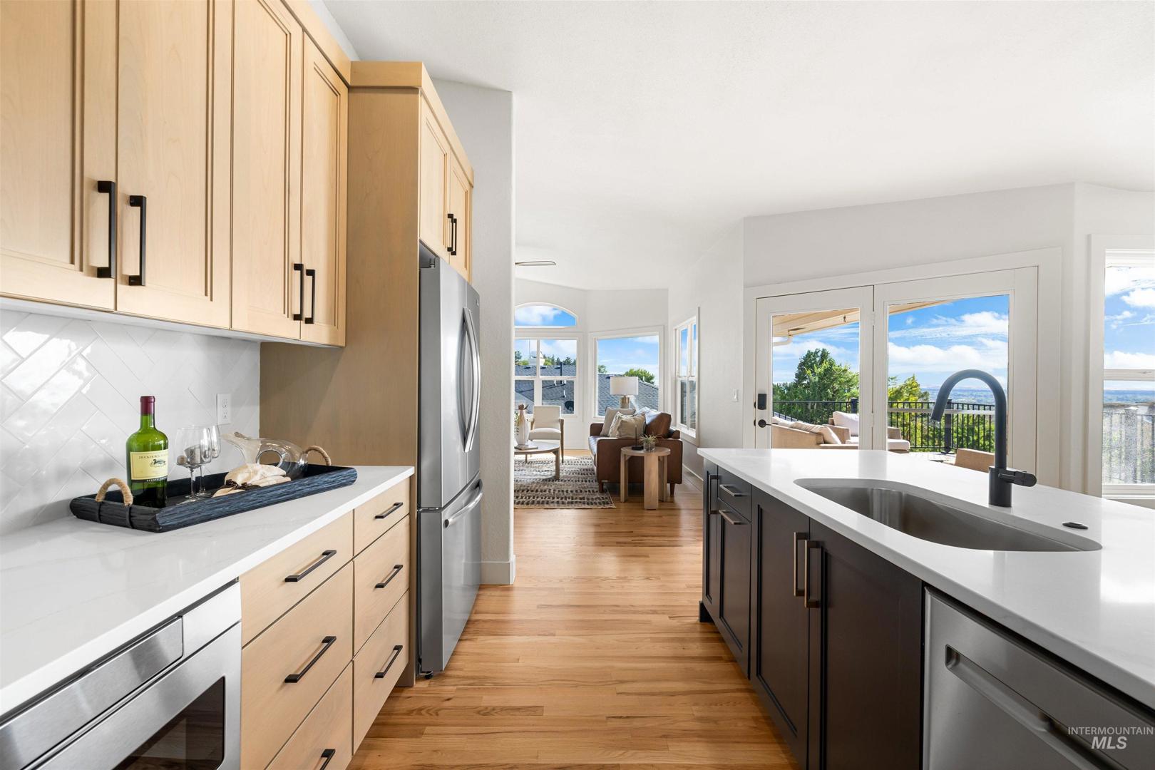 Tucked into the El PeLar neighborhood in the North Boise foothills, this beautifully renovated home combines modern upgrades with the charm of North Boise living. The main level features both formal & casual gathering spaces, with vaulted ceilings and separated by a striking floor-to-ceiling stone fireplace. The completely reimagined kitchen features new cabinetry, a quartz island, stylish tile backsplash, premium appliances, a dining area with stunning city views & access to the upper deck. Refinished hardwood floors and clean, designer finishes are carried throughout, creating a fresh and inviting atmosphere. The expansive main-level primary suite includes a walk-in closet, deck access, and a relaxing ensuite with dual vanities & soaking tub. Two guest bedrooms, a full bath, a home office, and a combination laundry & mud room with access to the three-car garage complete the main level. With everything you need placed on the main level, the home easily adapts to every stage of life. The walkout basement is filled with natural light and designed for flexibility, offering two oversized bedrooms, a full bath, a kitchenette, and a versatile living area, which gives plenty of space for everyone. Centrally located near trailheads, Crane Creek Country Club, Hyde Park, Bogus Basin, Downtown Boise, and top-rated schools, this home places the best of Boise at your doorstep.