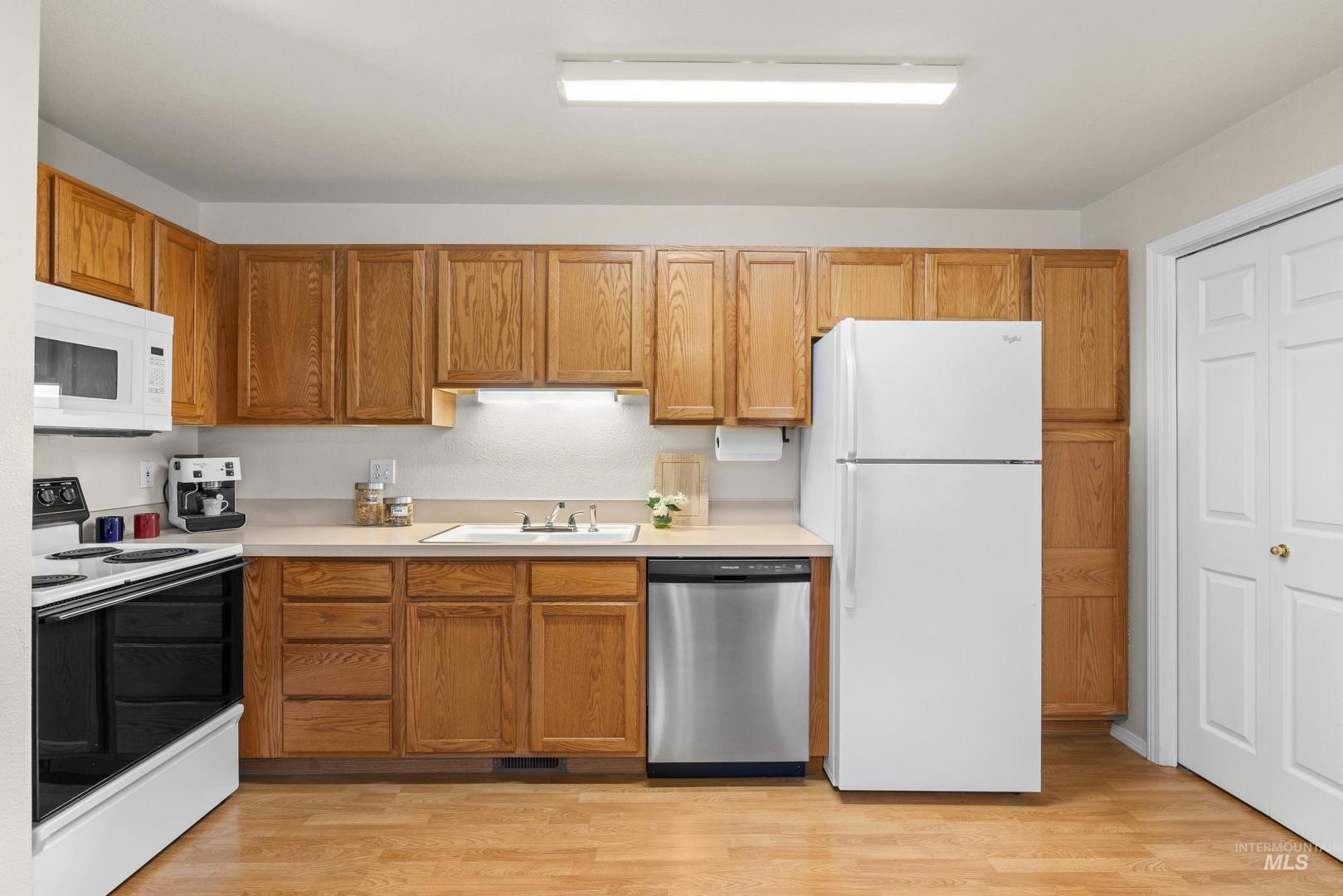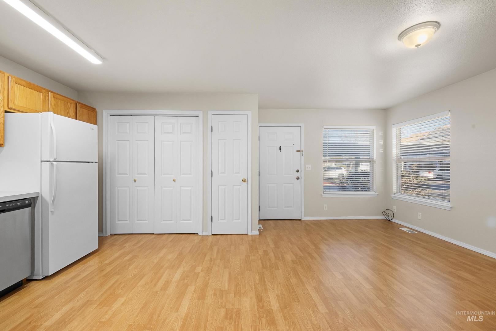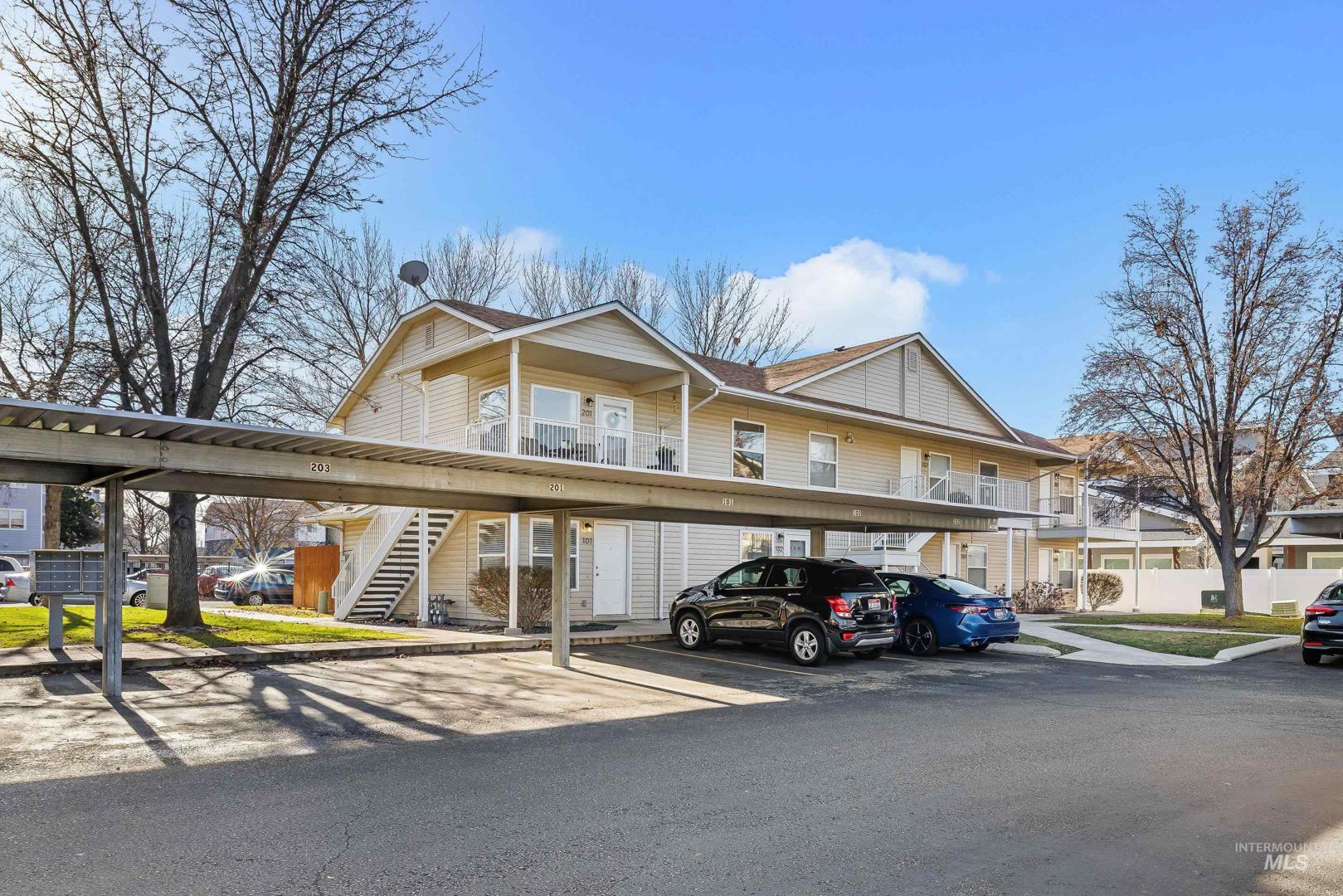 Welcome to your new home. Immediate occupancy available. This well-maintained charming ground level end unit condominium offers a generous 1 bedroom 1 bathroom floor plan for simple living. The open floor layout allows for flexibility in furniture placement and layout. Included are new Beko Brand stack washer and dryer purchased March 2028. New Microwave installed December 2025. Newer water heater 2018. HOA fees cover water, sewer, trash, and exterior maintenance. Private patio for added outdoor enjoyment and entertaining. The covered parking space is also located in close proximity to the front door adding additional convivence in transporting groceries and such. The central location allows for easy access to the freeway, shopping, and restaurants. Perfect for a lock and leave home if your lifestyle requires travel.