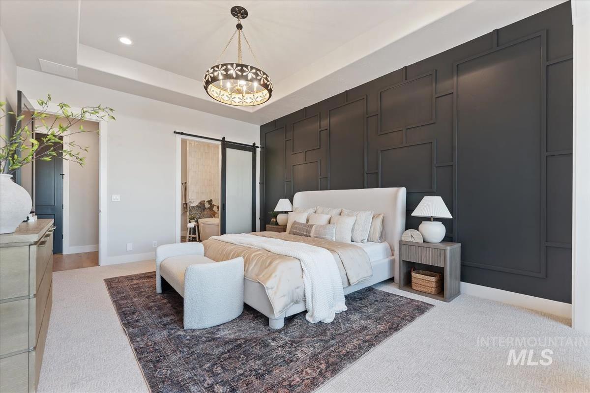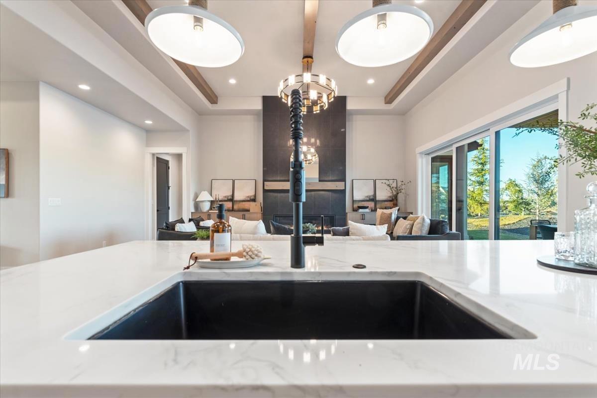 Welcome to The Balmoral by Hammett Homes. This residence exemplifies architectural excellence. Situated adjacent to a spacious pond, the property boasts two beaches one with pavers and the other with sand adorned with mature landscaping, boulders, & rock stepping stones. The main level includes both a primary suite & 2 additional bedrooms. The primary suite features a cozy sitting area overlooking the water, & its bathroom offers a spa-like ambiance with. The great room is distinguished by its high ceilings & elegant fireplace. The kitchen is fully equipped with Thermador appliances, a butler`s pantry, & a substantial additional pantry. Additionally, the office space is generously sized. On the upper level, there is a bonus room with wet bar, a large balcony, and an additional bedroom connected with a private bathroom. The large garage includes an RV bay that is insulated and has concrete floor coating done. Furthermore, each bedroom in this home has its own private bathroom along with a powder bath on the main level and a powder bath on the upper level.
