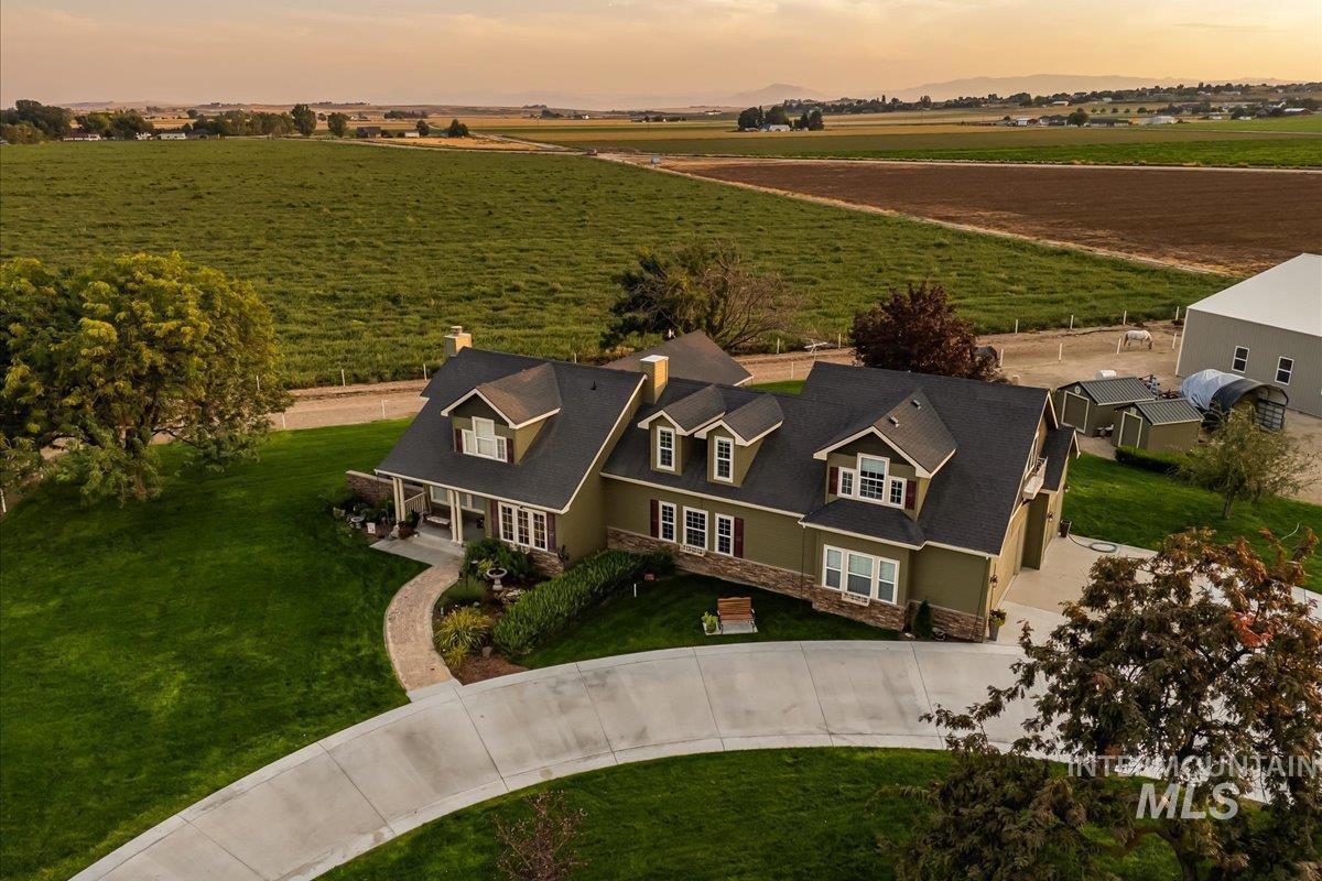 Luxurious home on 5 acres in South Nampa, offering breathtaking views of the Owyhee Mountains right from your back door. This 3,590 sq ft residence features 3 bedrooms, 2.5 baths, and a 3-car garage. The inviting living room showcases rich hardwood floors and a wood-burning fireplace, while the gourmet kitchen impresses with granite countertops, granite sink, induction cooktop, tri-vection double oven, two wine fridges, and dual dishwashers. A cozy family room off the kitchen offers a gas fireplace for added warmth. The large main-level primary suite boasts a steam shower, copper soaking tub, heated tile floors, heated towel rack, dual vanities, and a massive walk-in closet with custom built-ins. Upstairs, you’ll find a spacious bonus room, two bedrooms, a full bath, and a small office. 3 car garage insulated. Outside enjoy two pasture areas, a charming new barn for your animals, and a brand-new shop built in 2024. Nestled in near Lake Lowell and Wildlife Refuge, enjoy the wildlife year-round. A very peaceful place to live, with large shade trees, beautiful views from inside the home and outdoors in all directions. You will love living here!